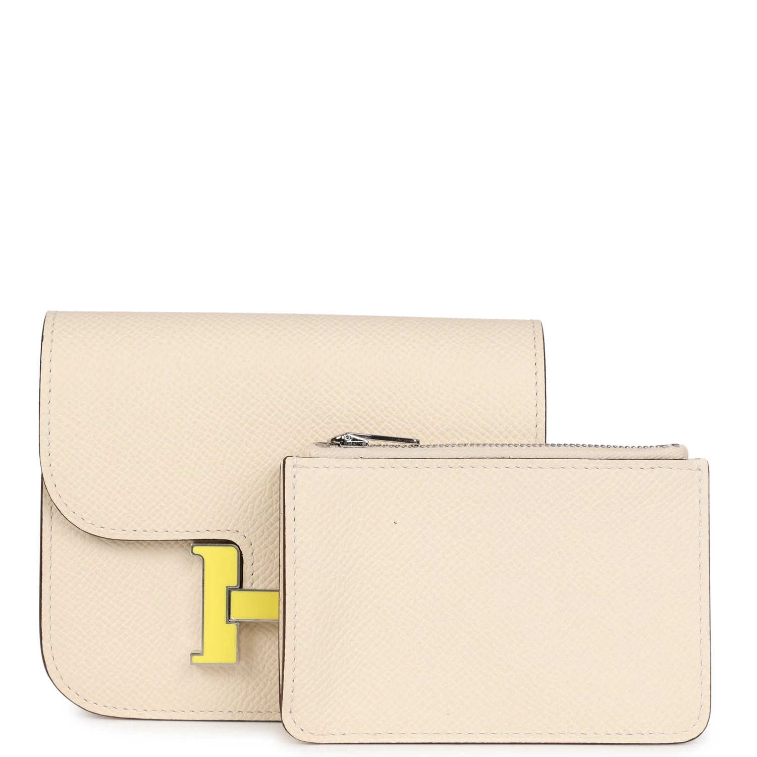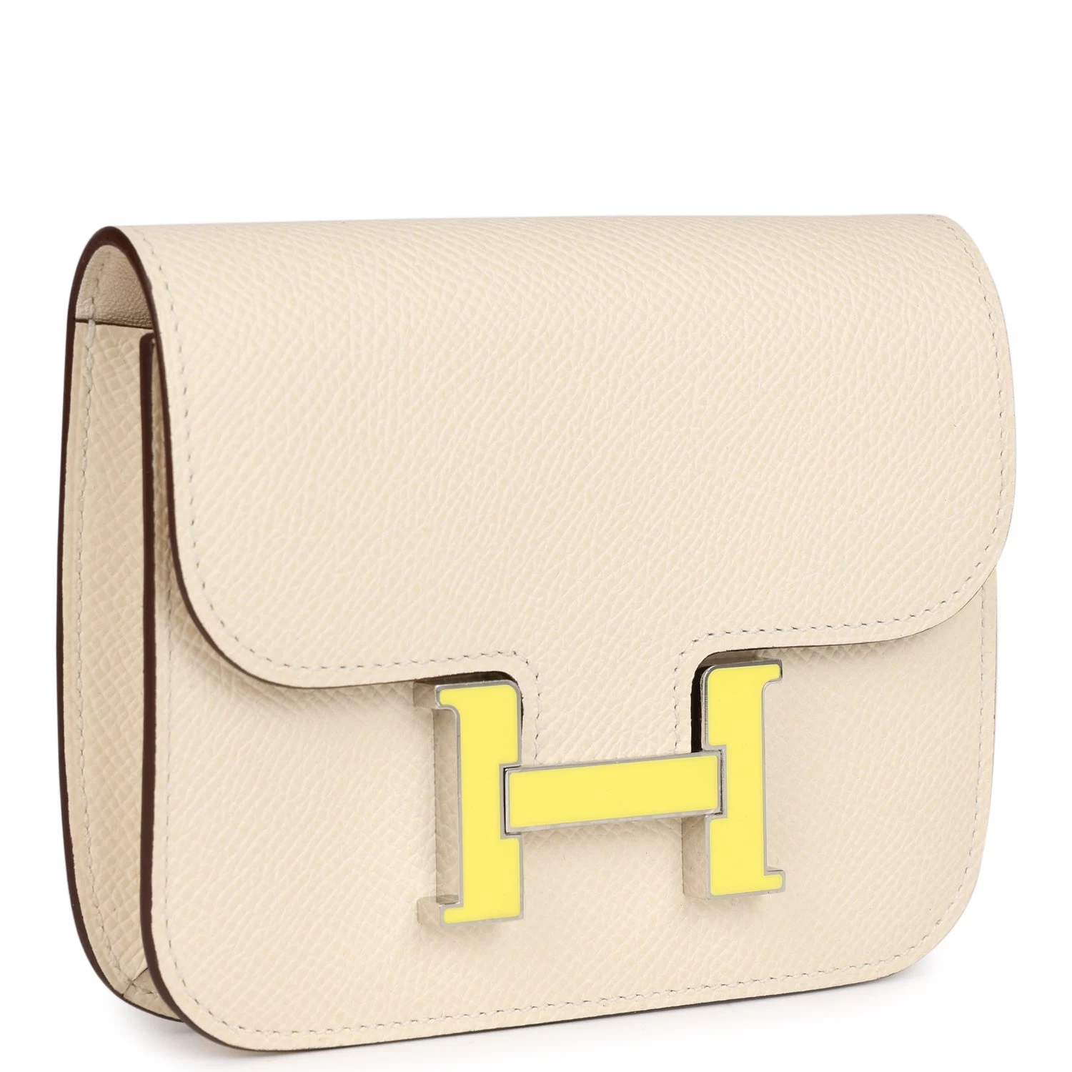 This Constance Slim Wallet is in Craie Epsom with Lime Enamel and Palladium Hardware, tonal stitching, two internal pockets, and one internal pocket with card holder, “H” Snap Closure
