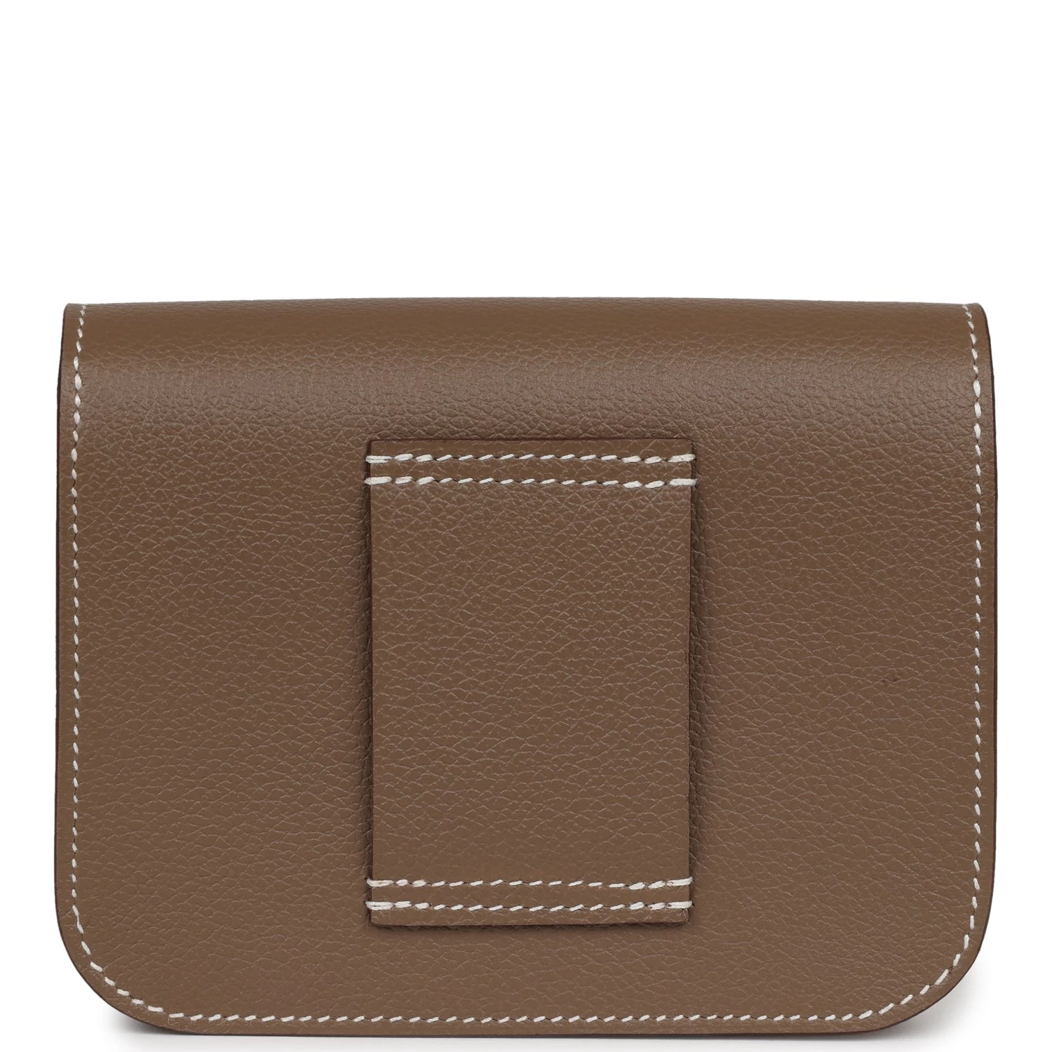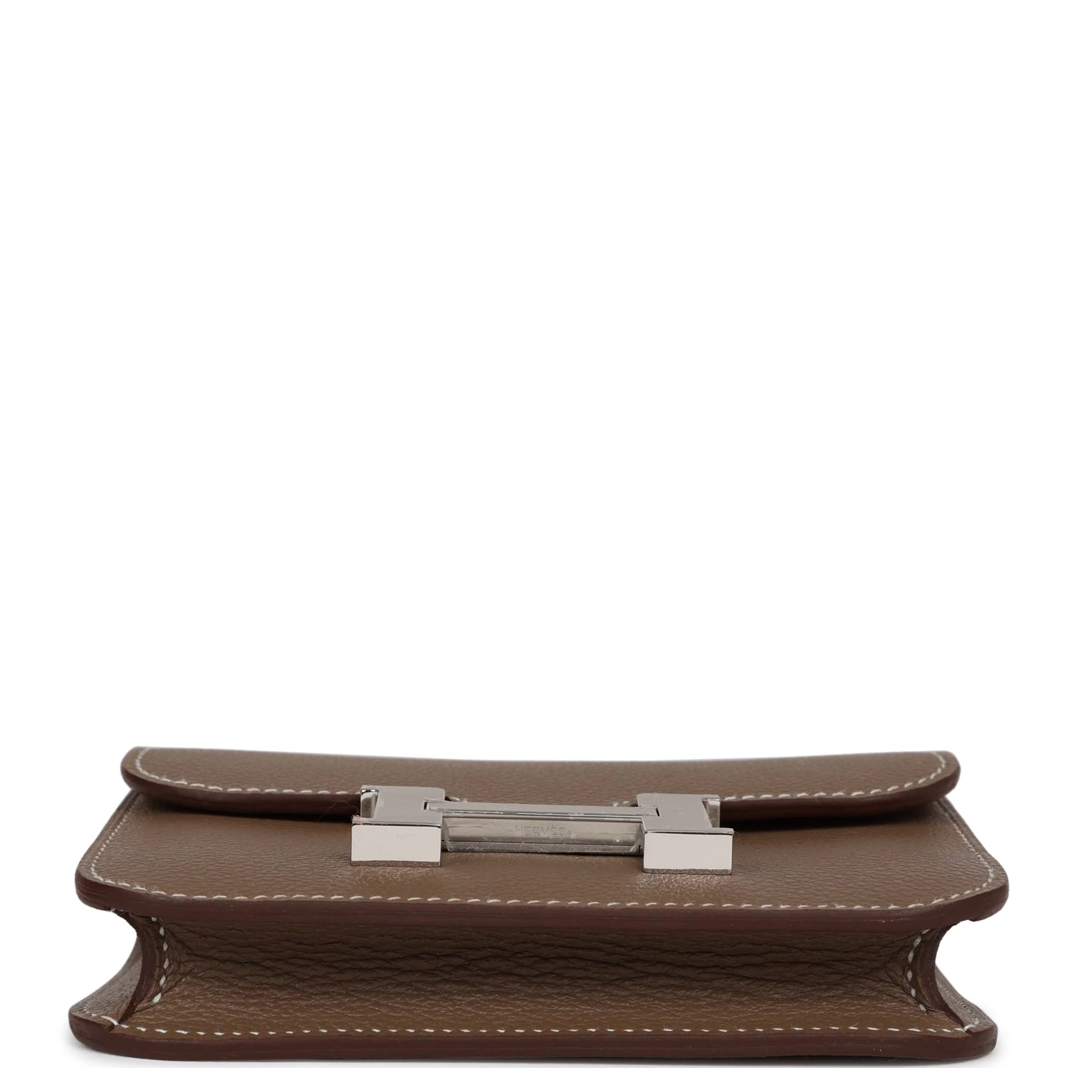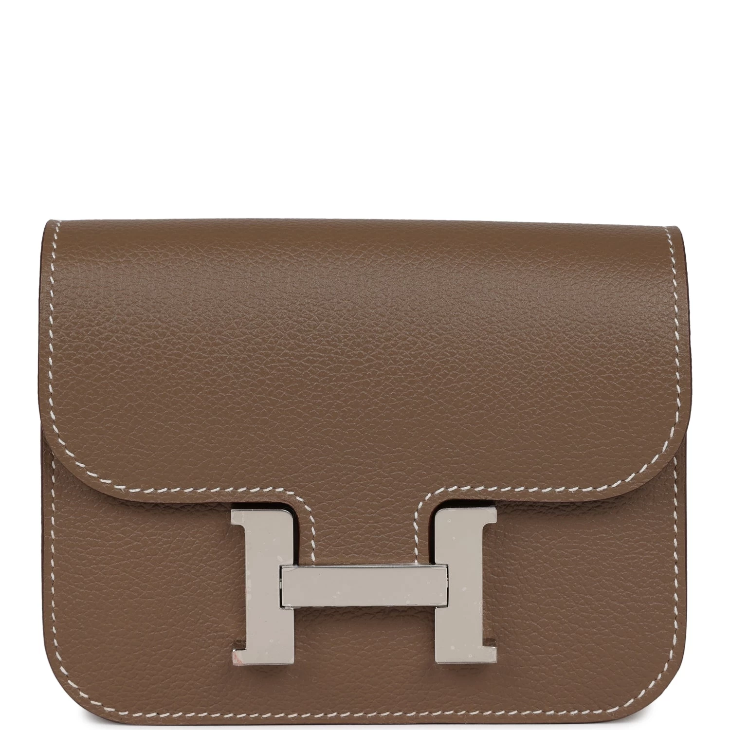This Constance Slim Wallet is in Etoupe Evercolor leather with palladium hardware and has contrast stitching, rear belt loop, front flap and removable coin pouch.