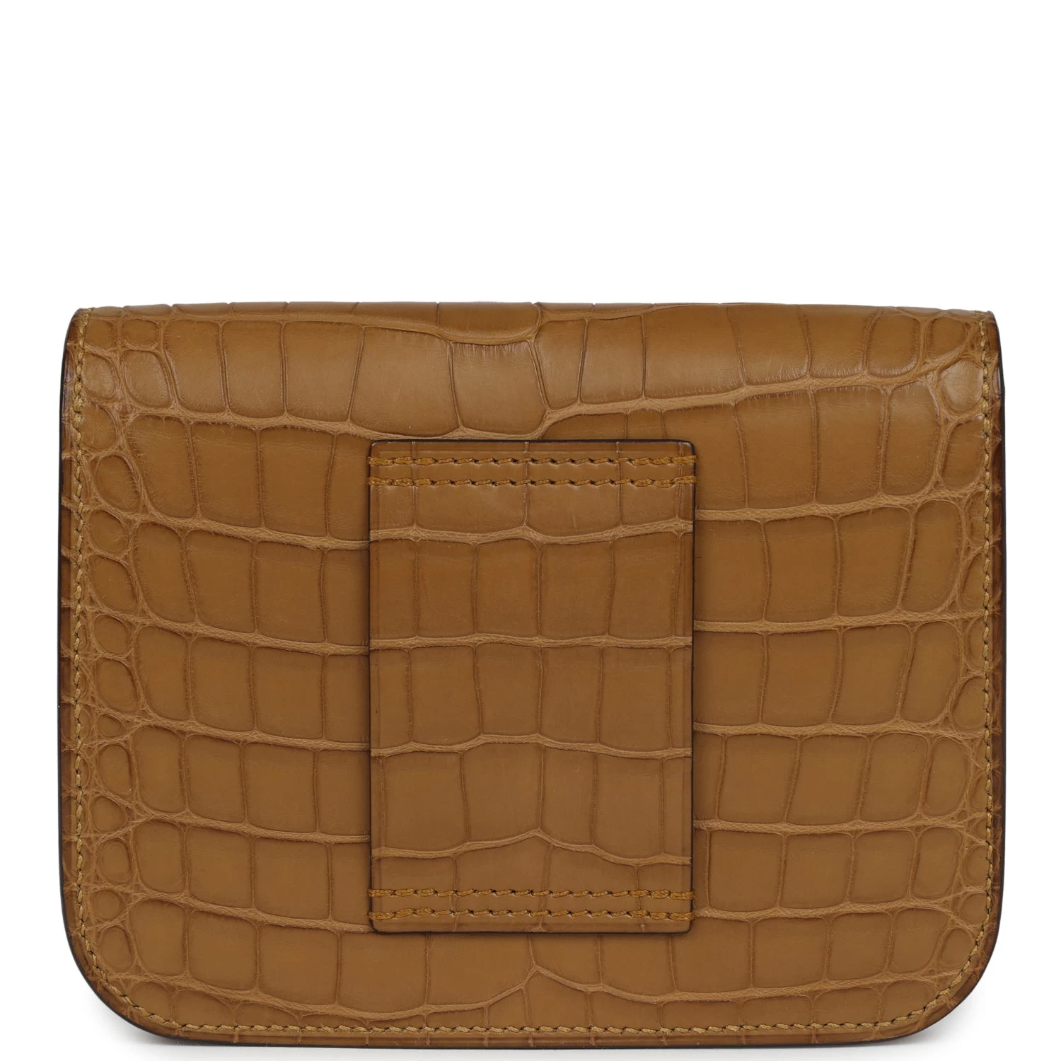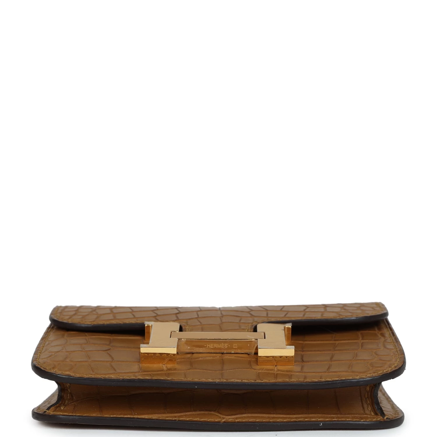 This Constance Slim Wallet is in Kraft Matte Alligator Mississippiensis with gold hardware, tonal stitching, rear belt loop, front flap and removable coin pouch.