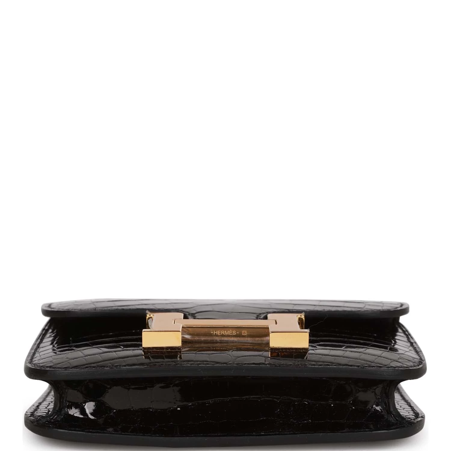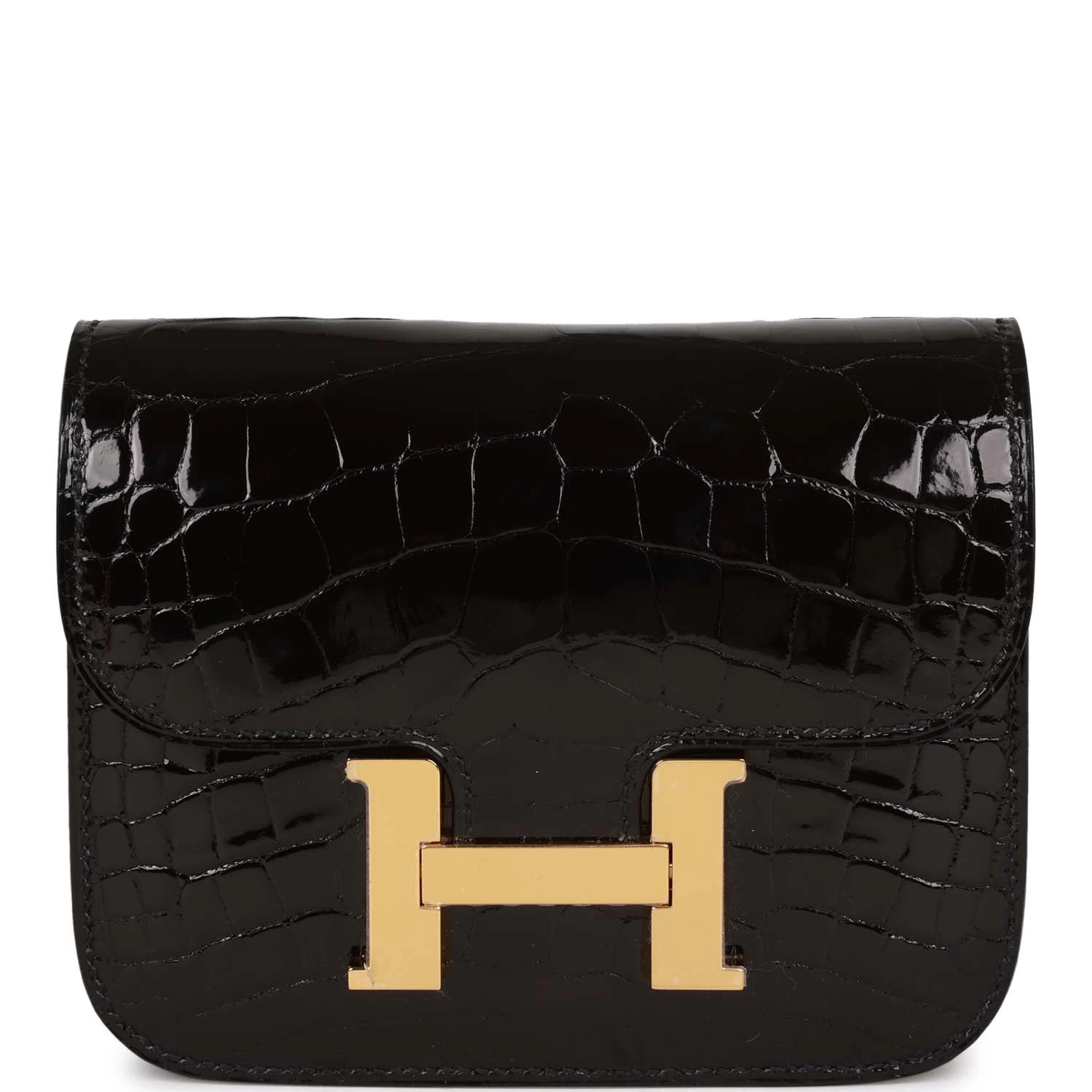 This Constance Slim Wallet is in Black Mississippiensis alligator leather with gold hardware and has tonal stitching, a rear belt loop, front flap with “H” snap lock closure, and removable coin pouch.