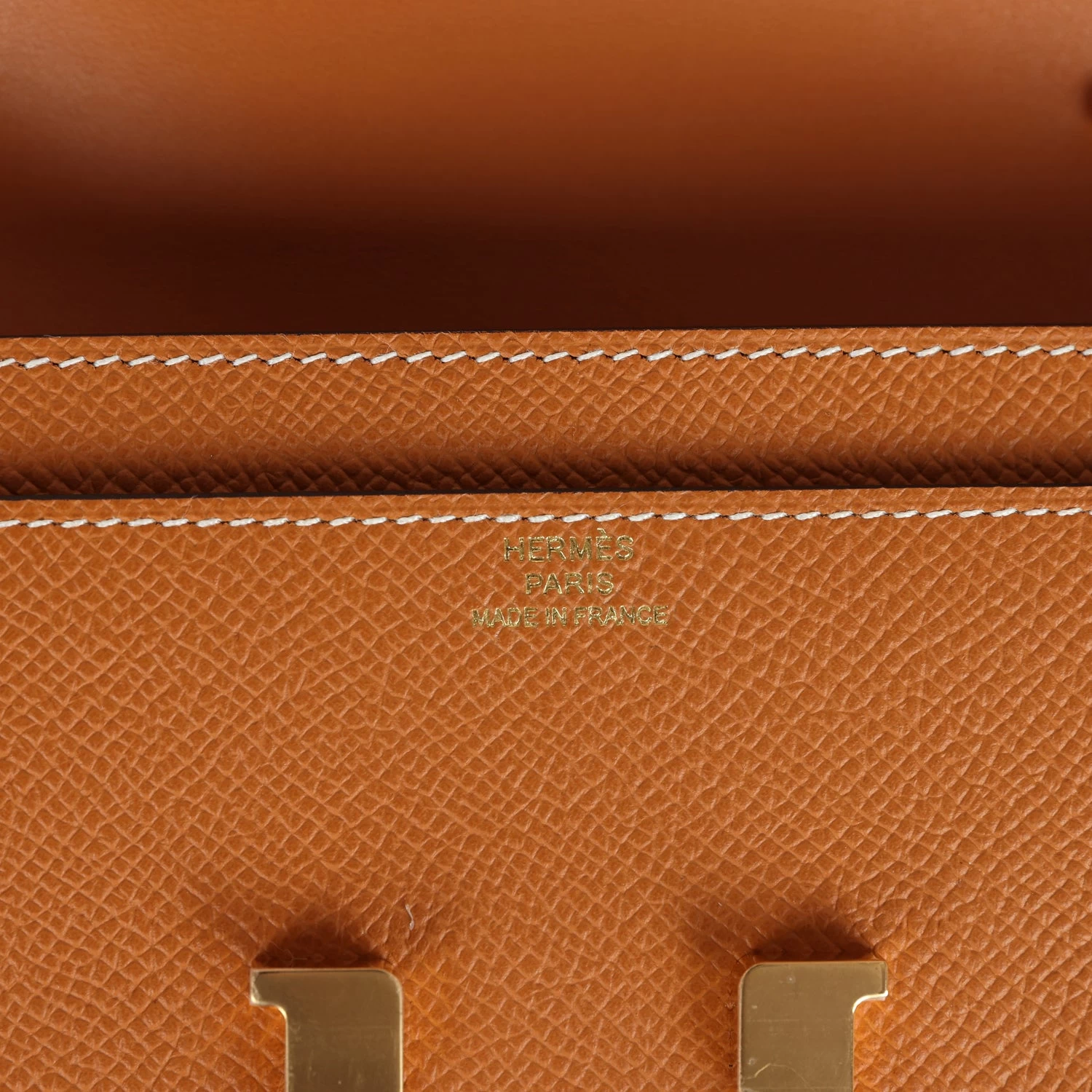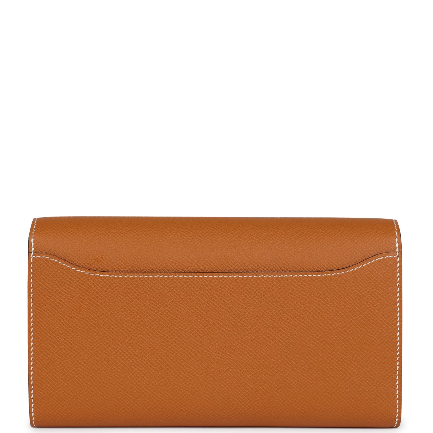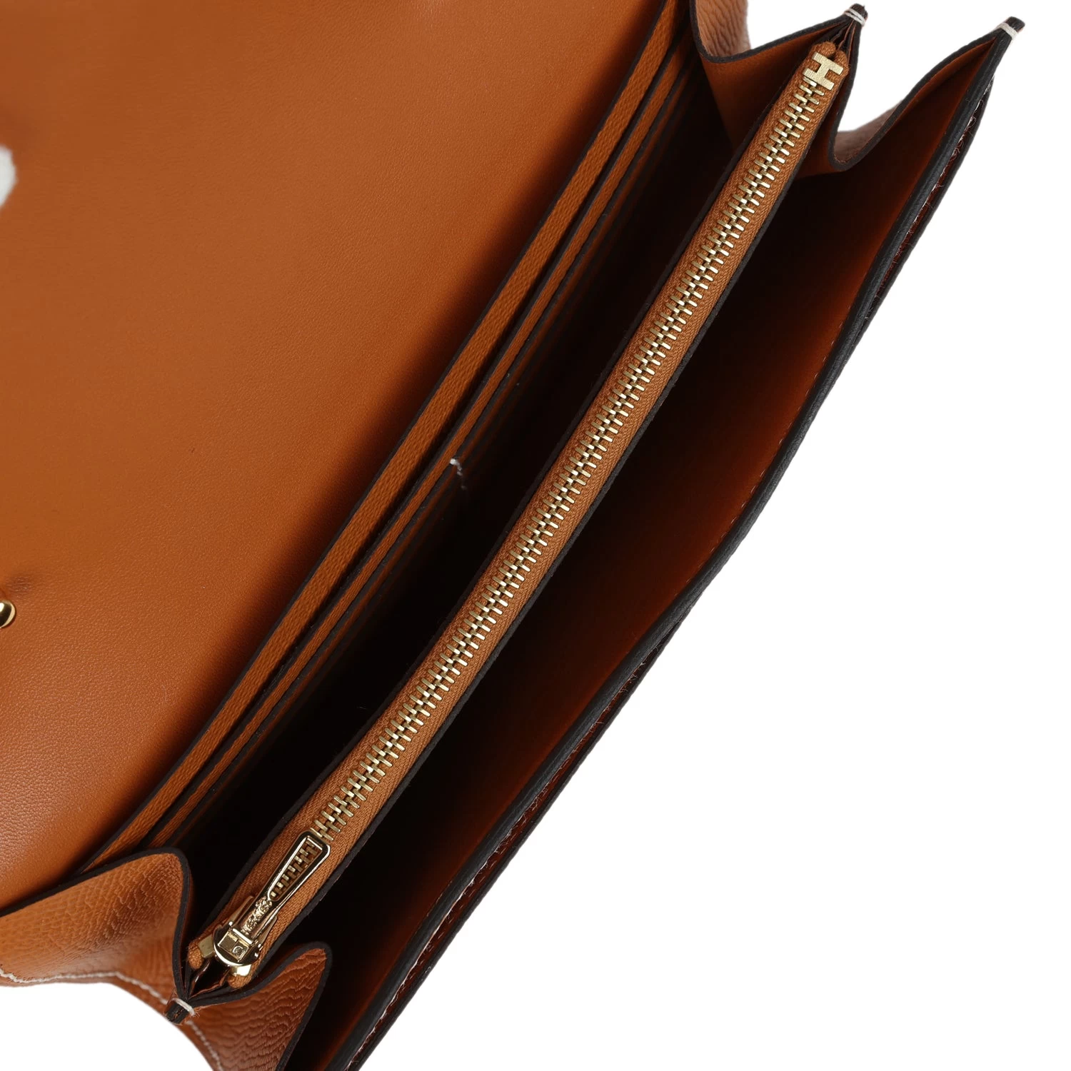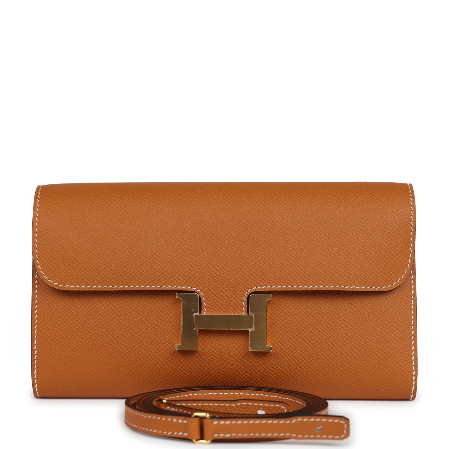 This Constance Wallet To Go is in Toffee epsom leather with gold hardware and has contrast stitching, metal “H” snap lock closure, open front compartment and removable crossbody strap.