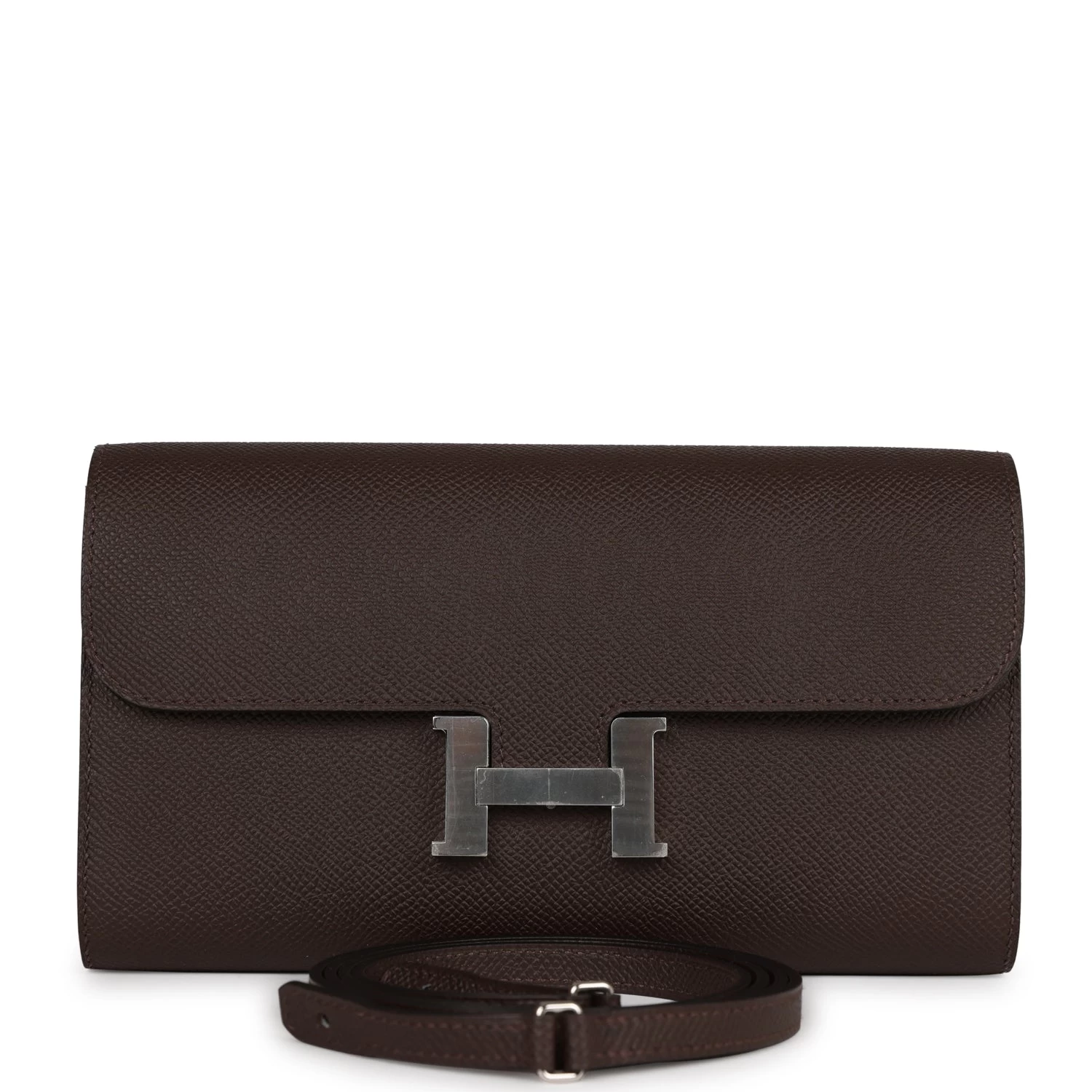 This Constance Wallet To Go is in Chocolate epsom leather with palladium hardware, has tonal stitching, metal “H” snap lock closure, open front compartment and removable crossbody strap.
