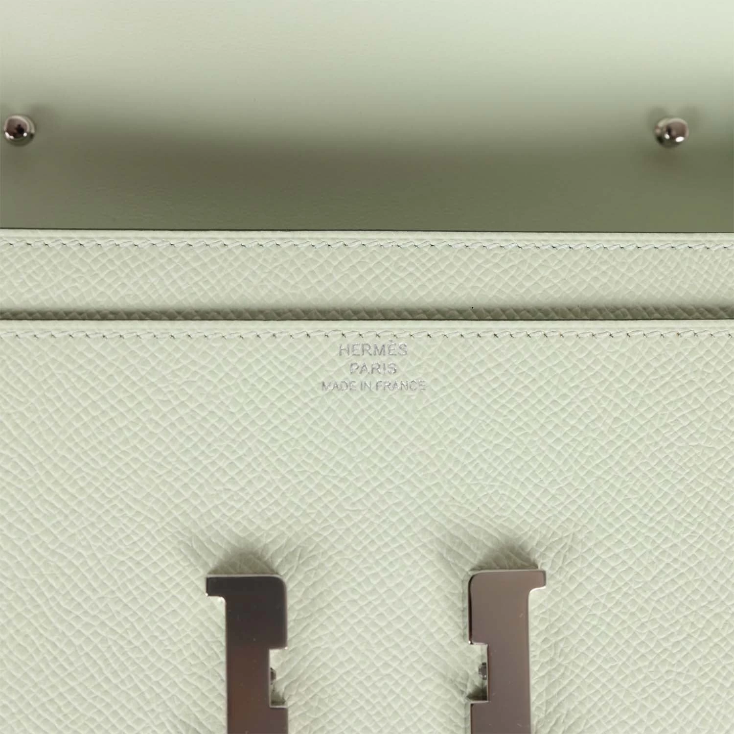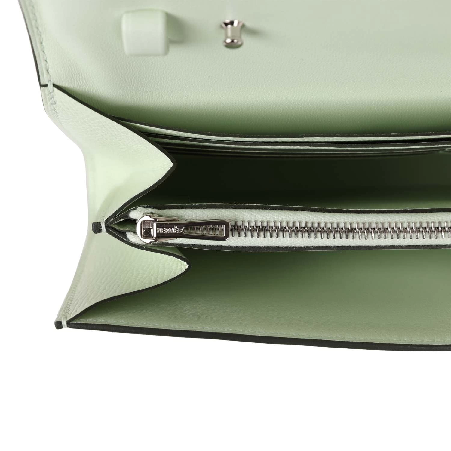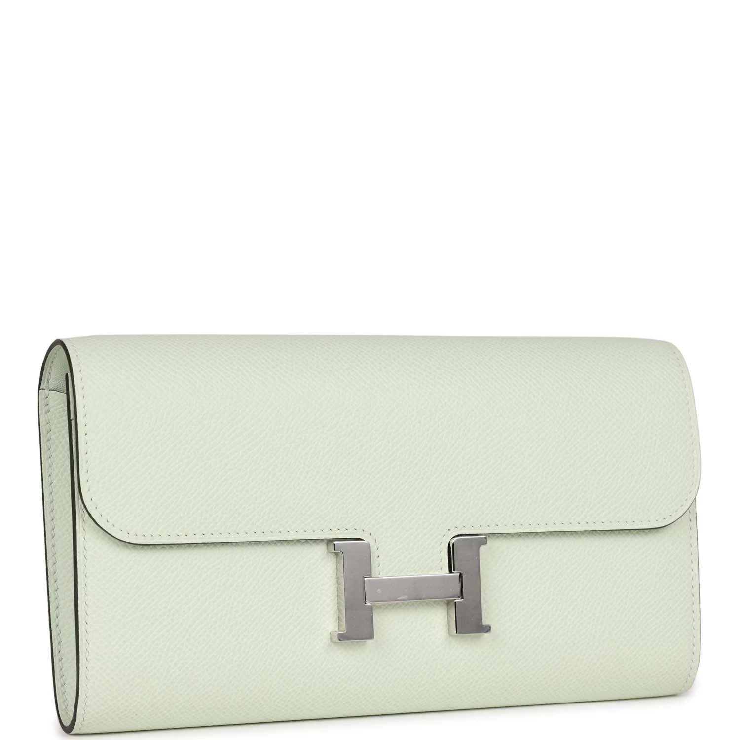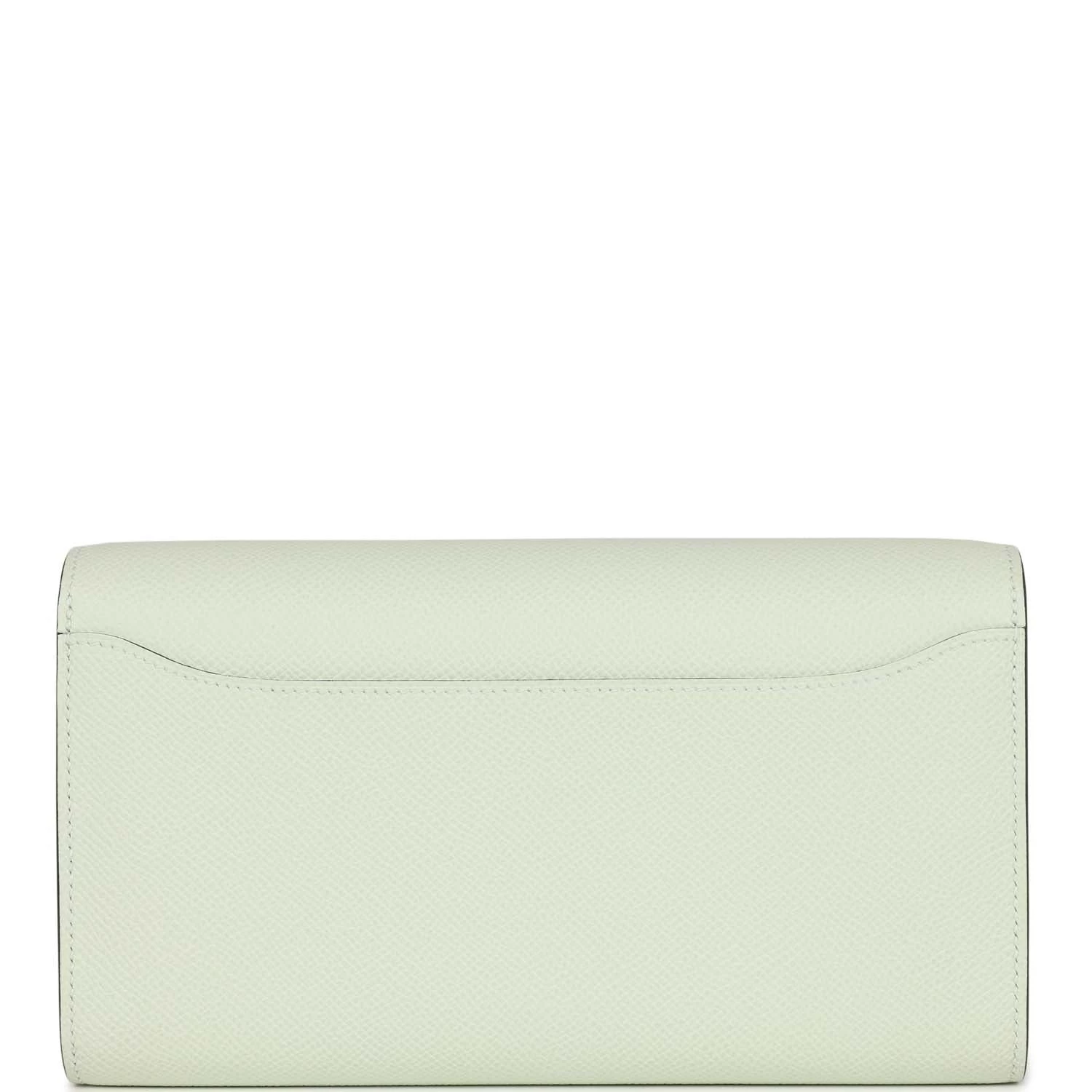 This Constance Wallet To Go is in Vert Fizz epsom leather with palladium hardware and has tonal stitching, metal “H” snap lock closure, open front compartment and removable crossbody strap.