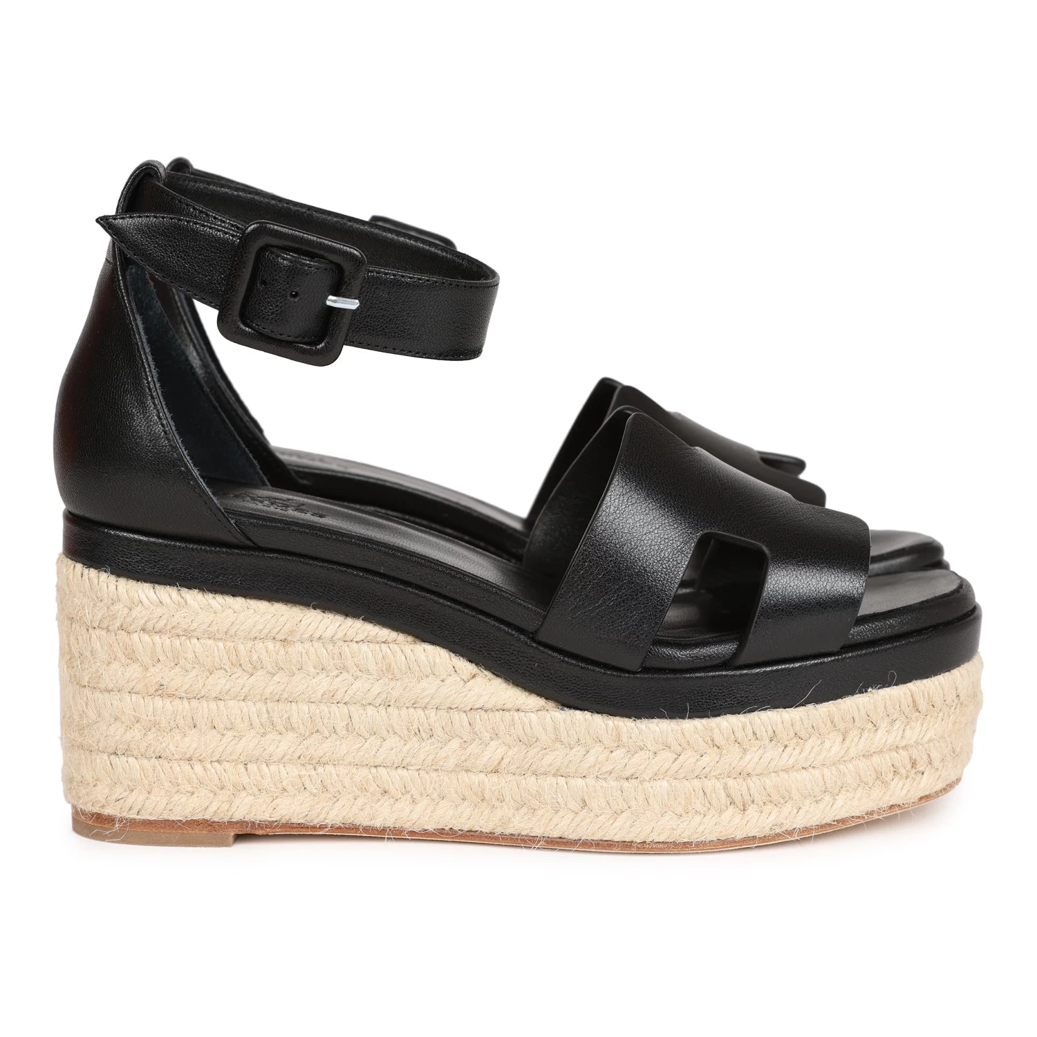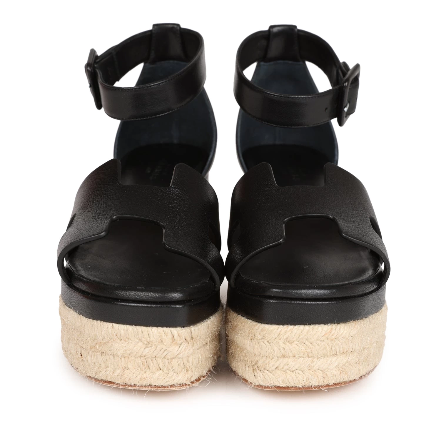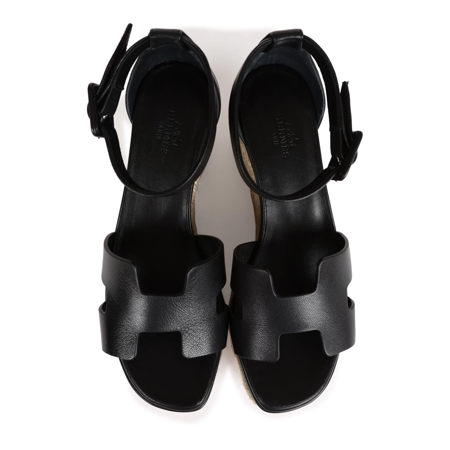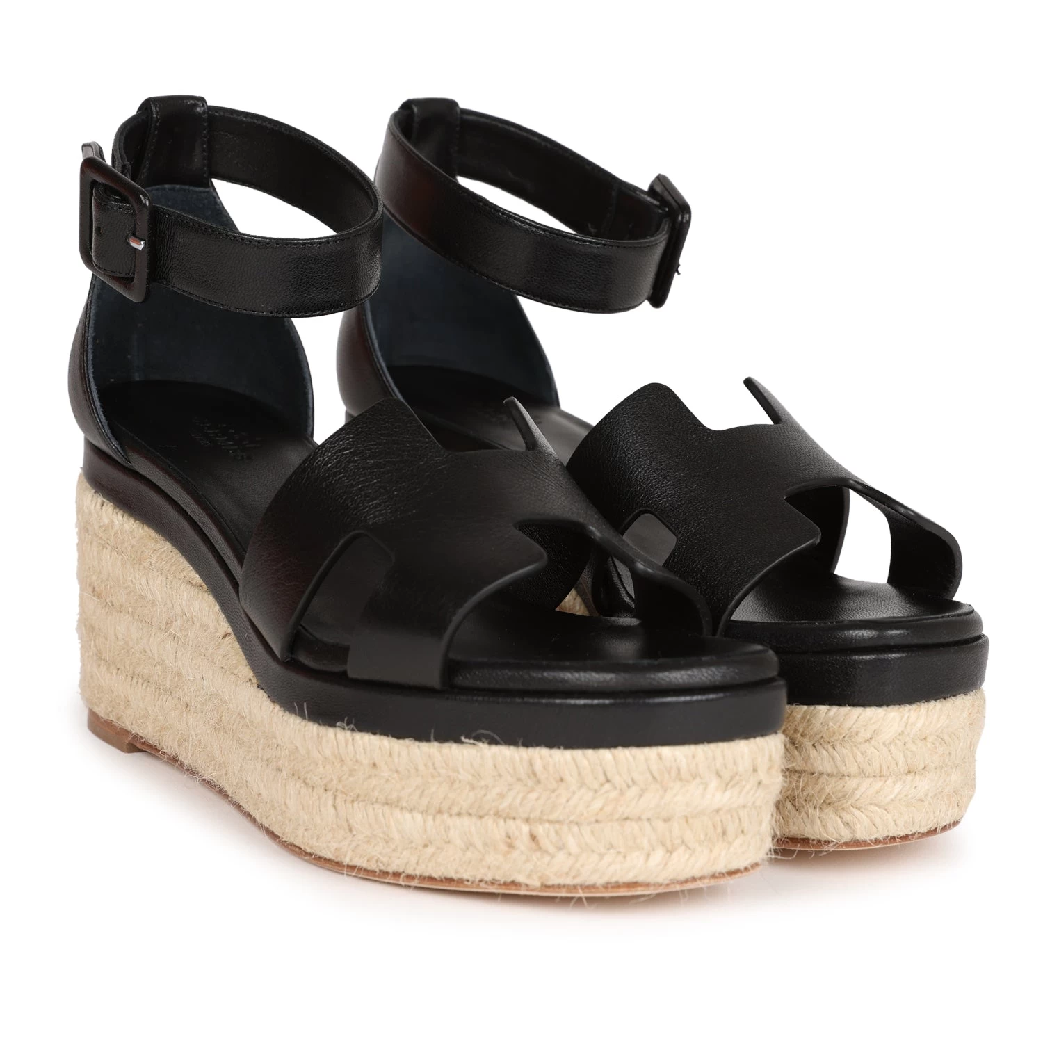 This pair of Doll 60 Espadrille Sandals are in Black Calfskin with Palladium Hardware, features the iconic “H” cut-out detail on the front and wedge heel, with a black goatskin insole.