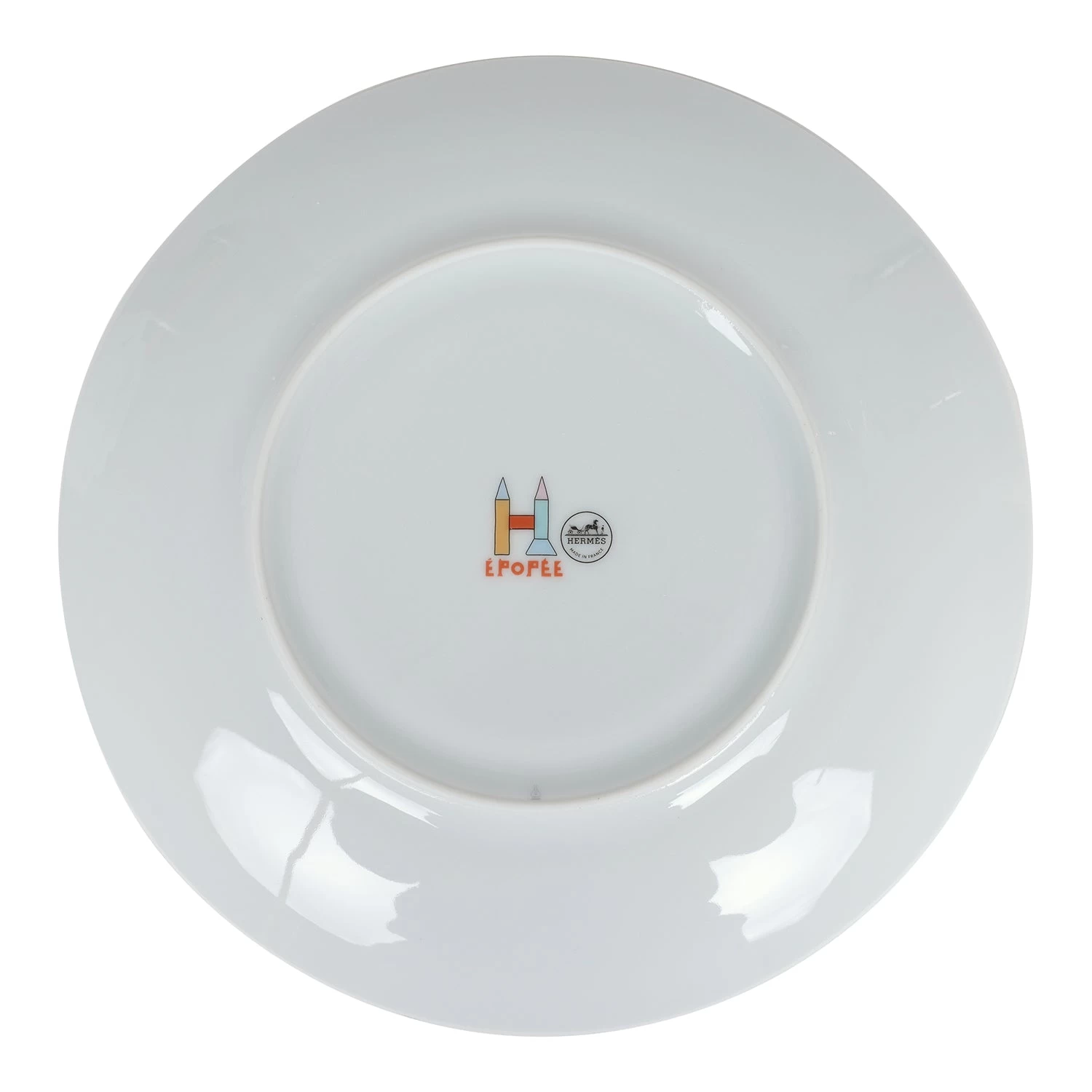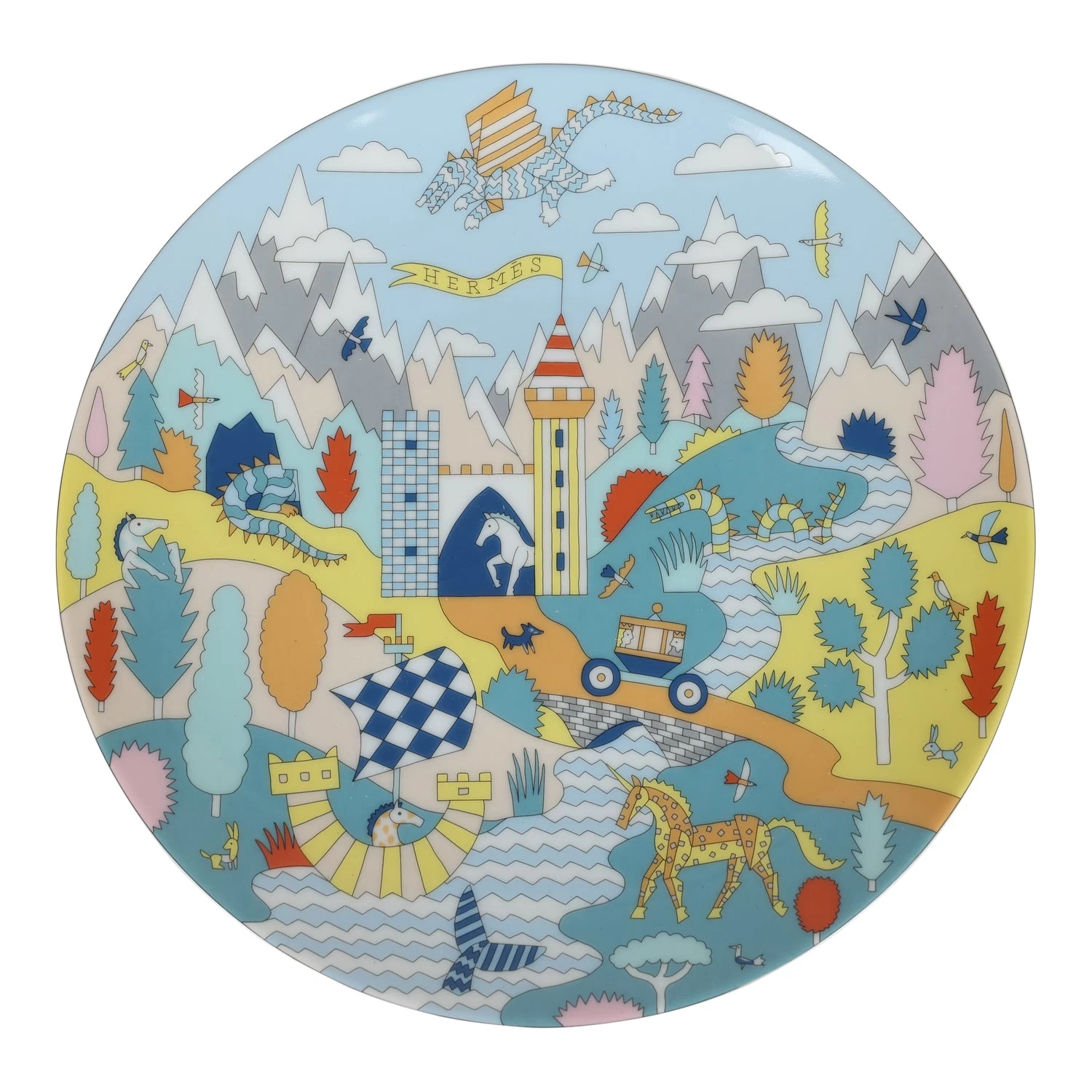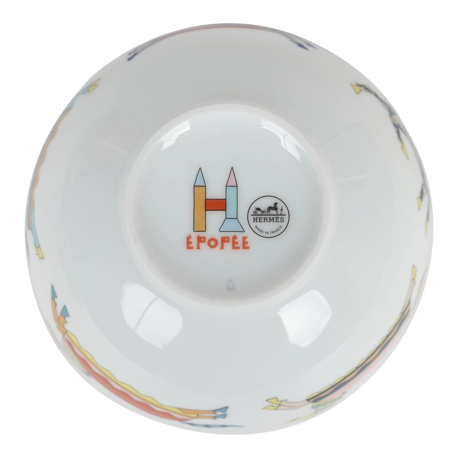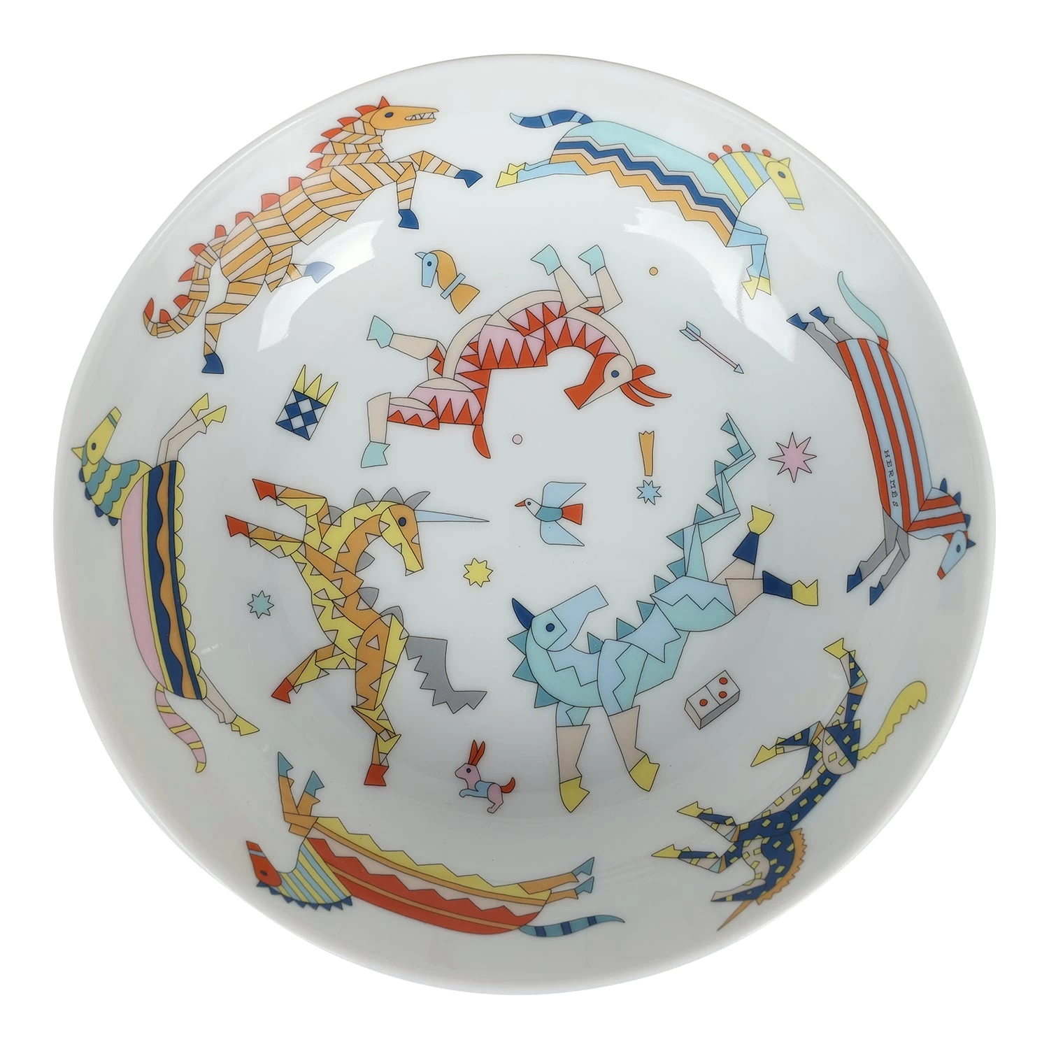 This Hermes Epopee set of four multicolor porcelain tableware set, features one dessert plate, one cereal bowl, one bowl, and one tumbler with horses, unicorns, and dragons screen-printed designed by Jan Bajtlik and applied by hand on the porcelain mugs.