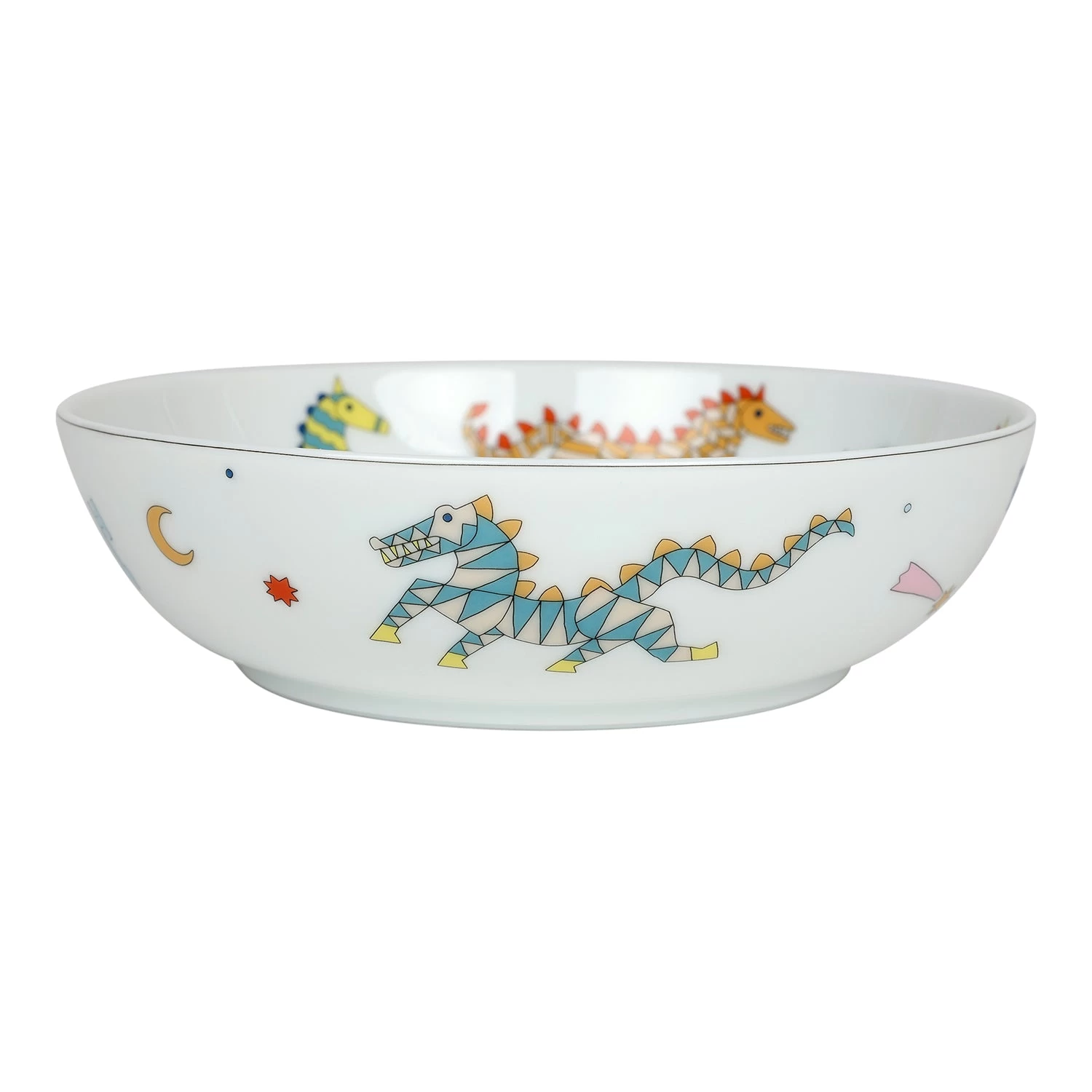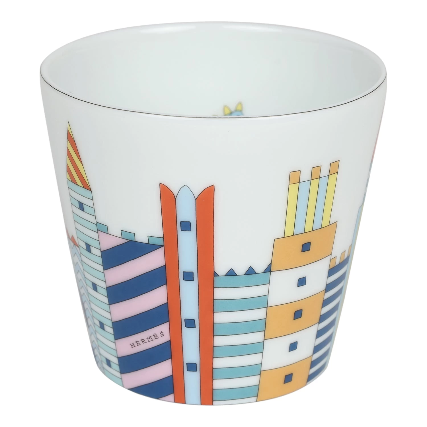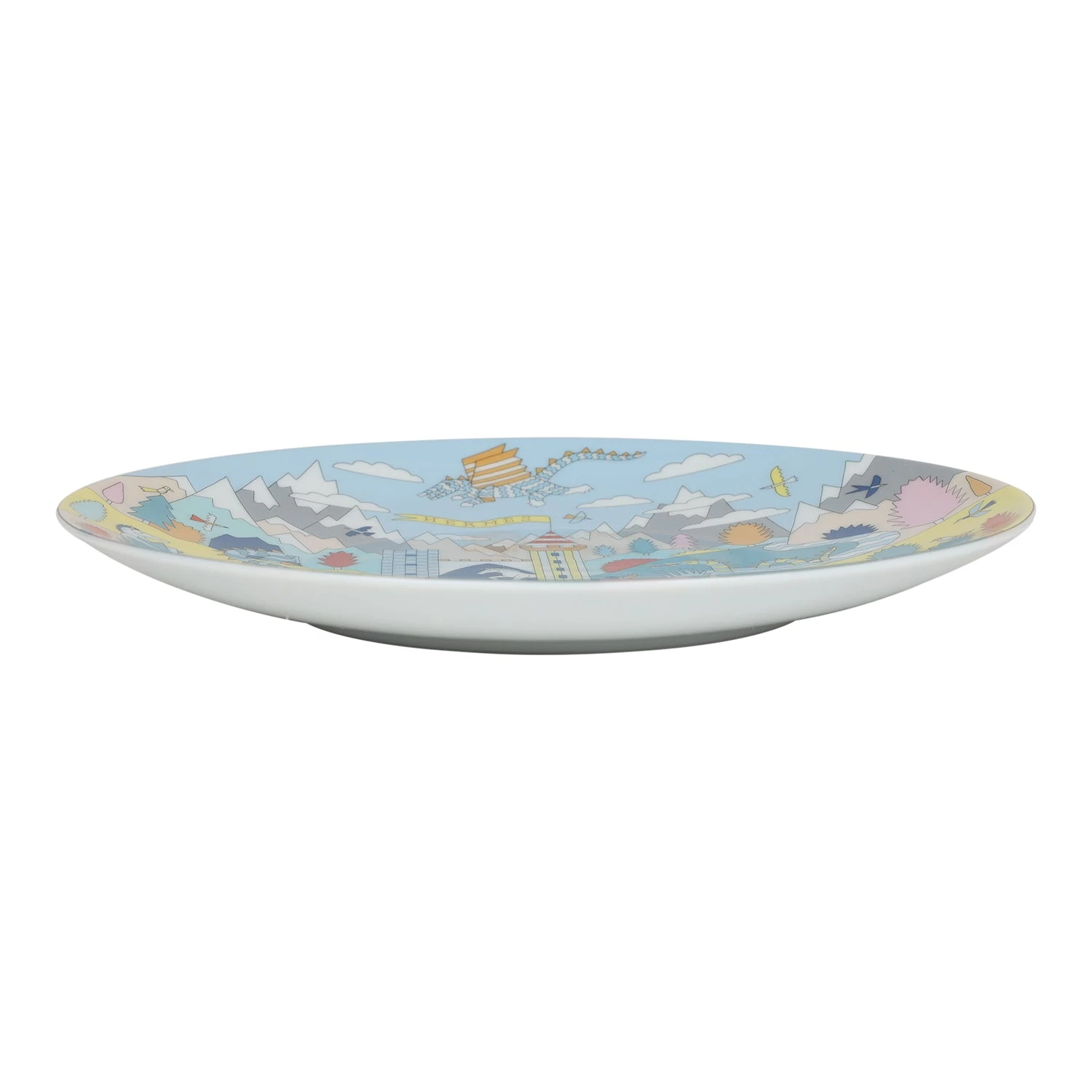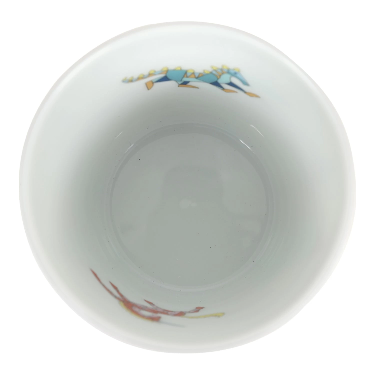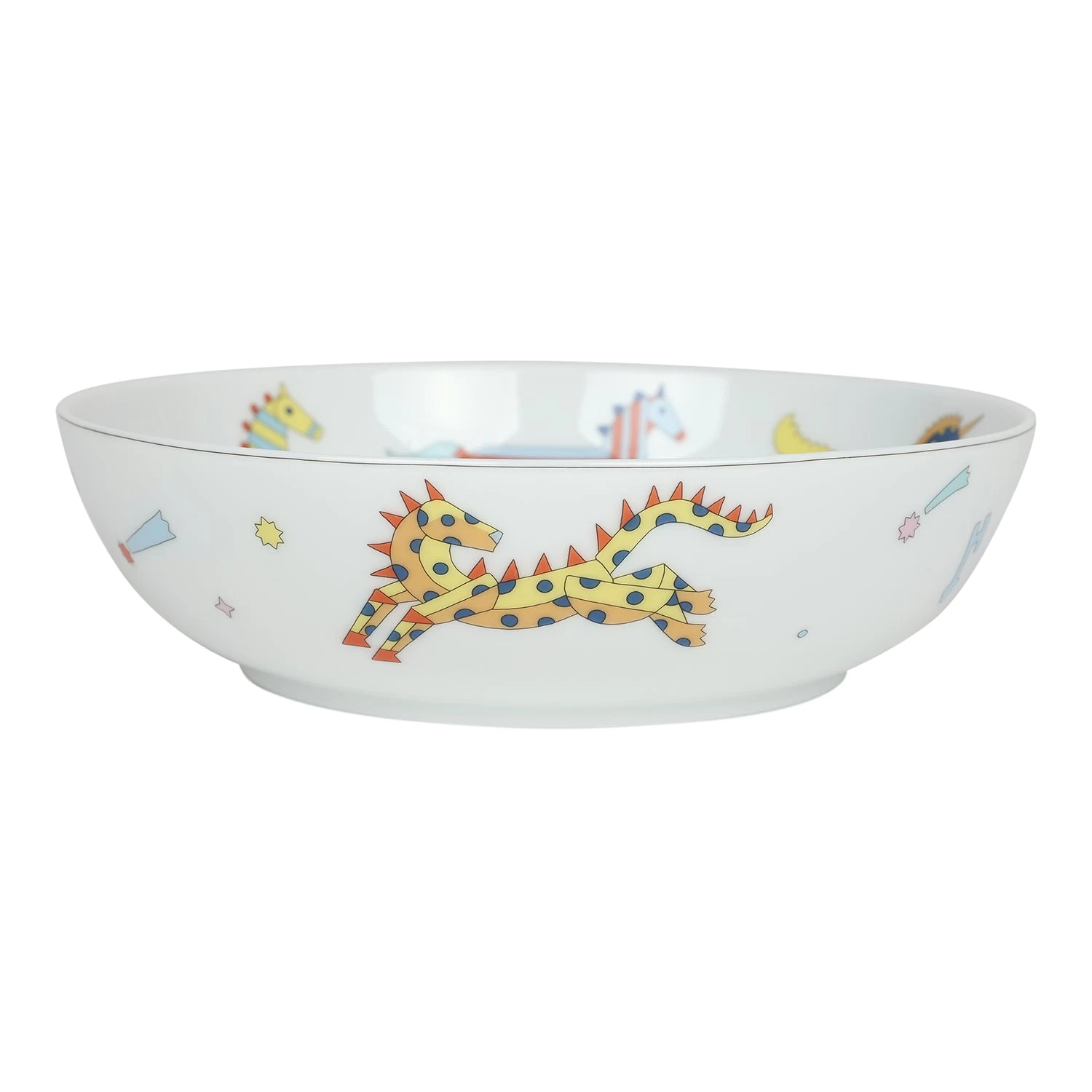 This Hermes Epopee set of four multicolor porcelain tableware set, features one dessert plate, one cereal bowl, one bowl, and one tumbler with horses, unicorns, and dragons screen-printed designed by Jan Bajtlik and applied by hand on the porcelain mugs.