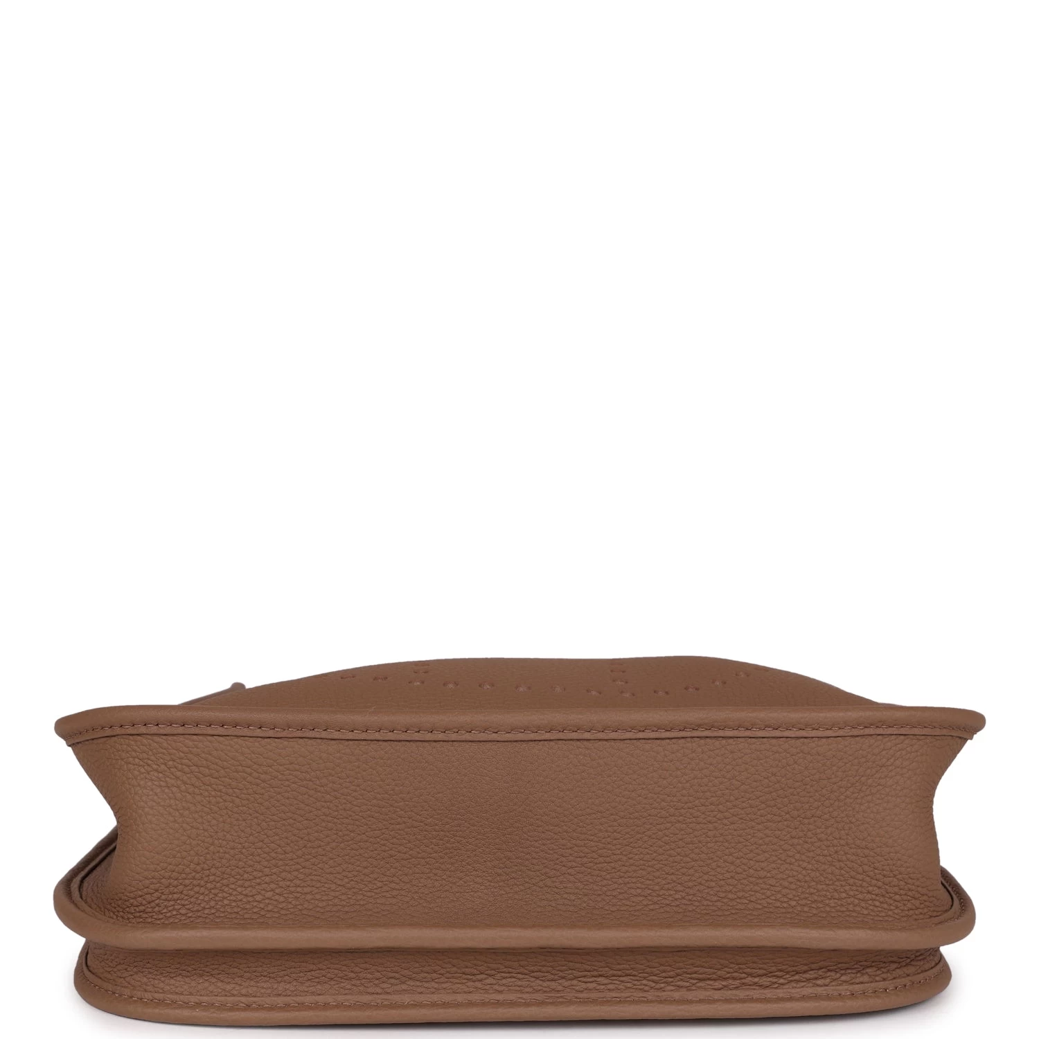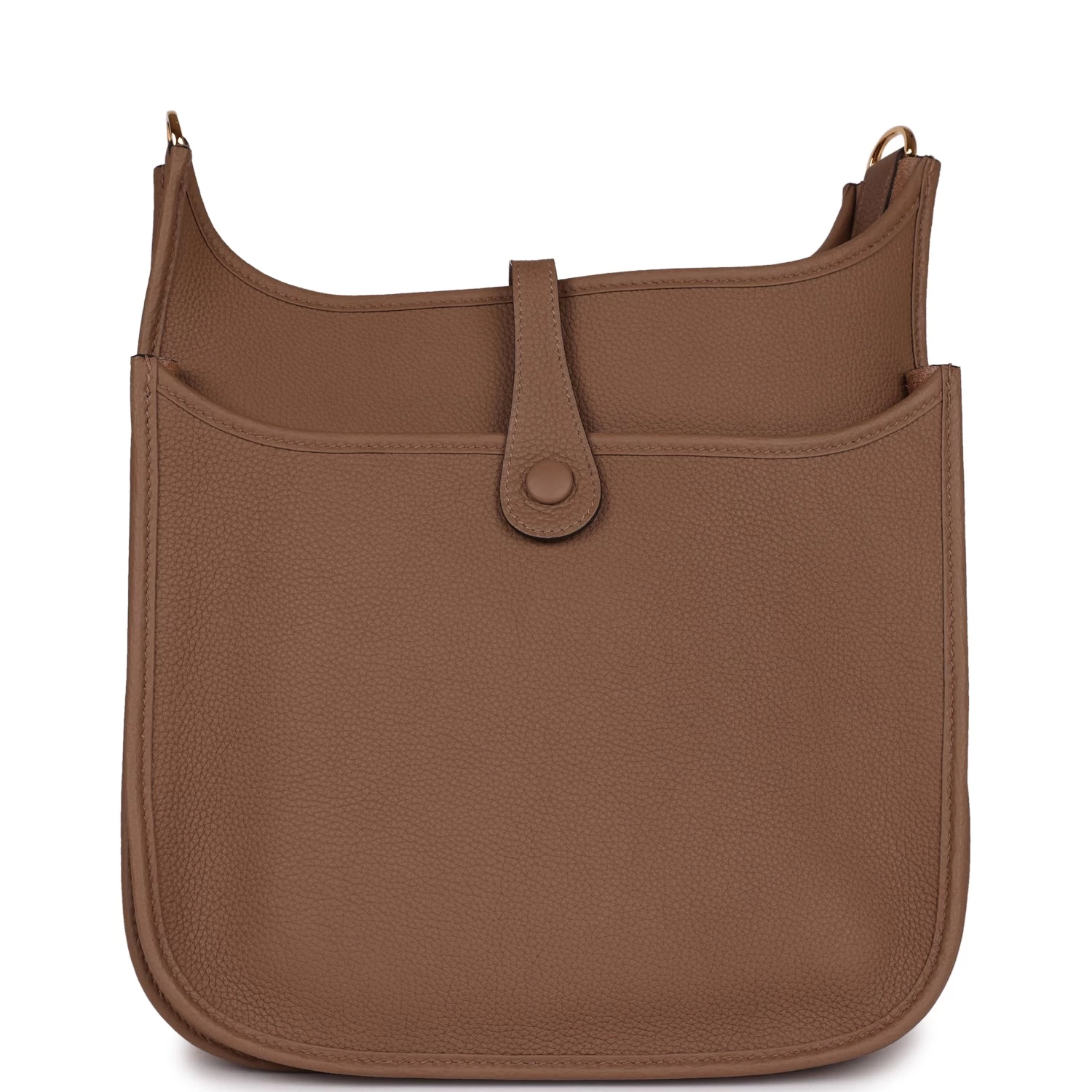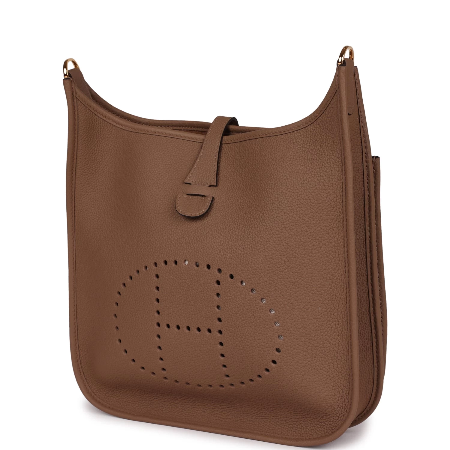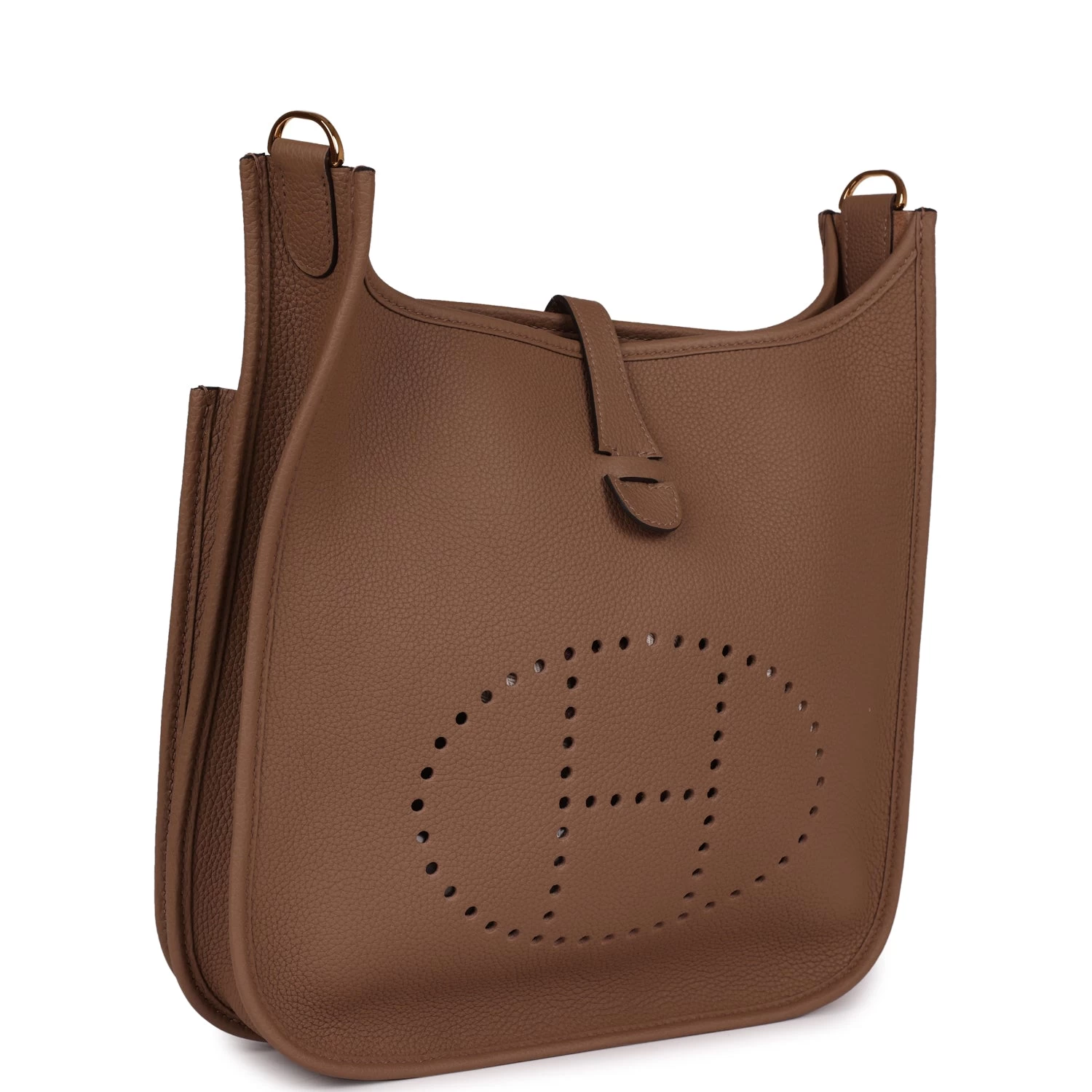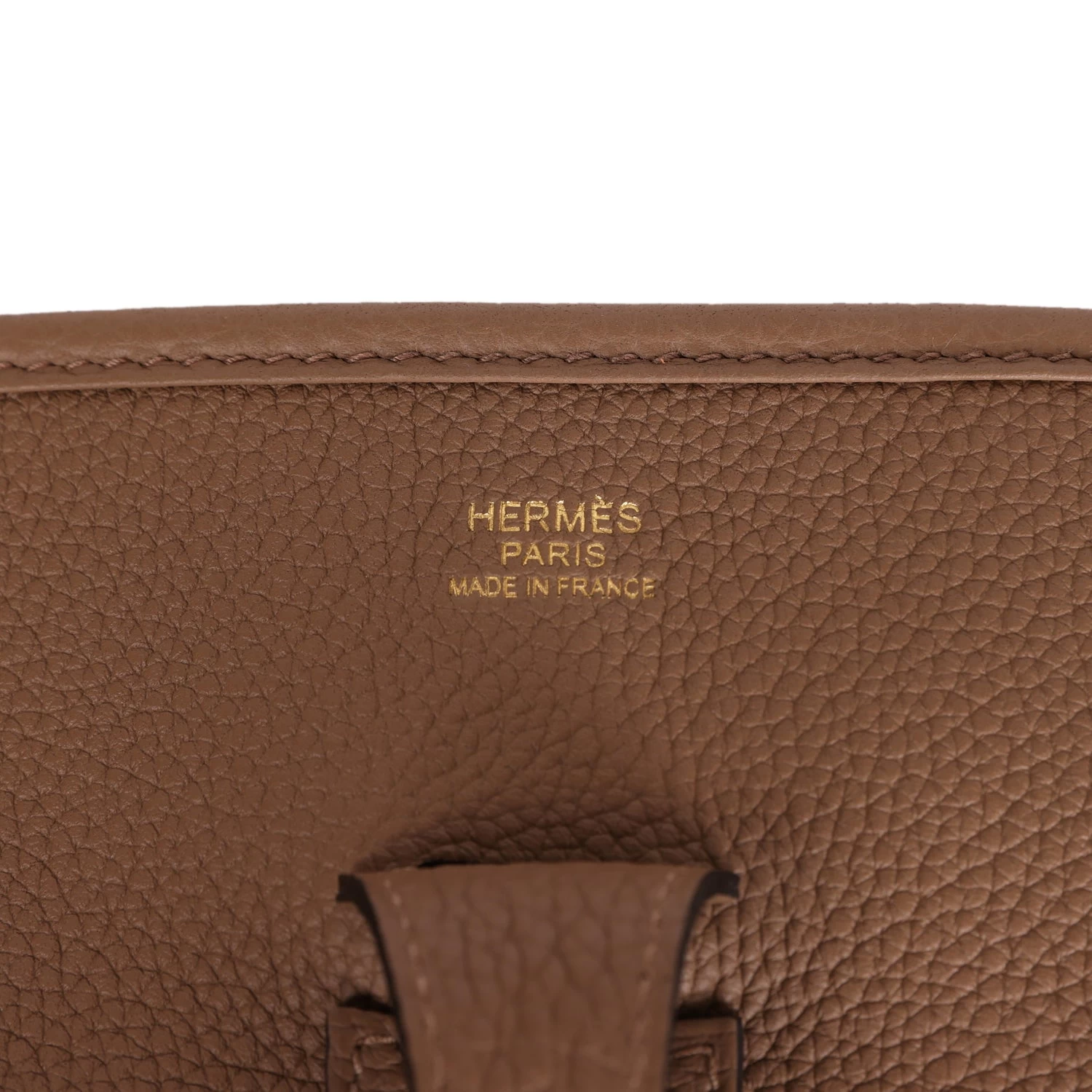 This Evelyne is in Beige de Weimar clemence leather with gold hardware and has tonal stitching, pull tab top closure and Beige de Weimar removable canvas and leather shoulder/crossbody strap.