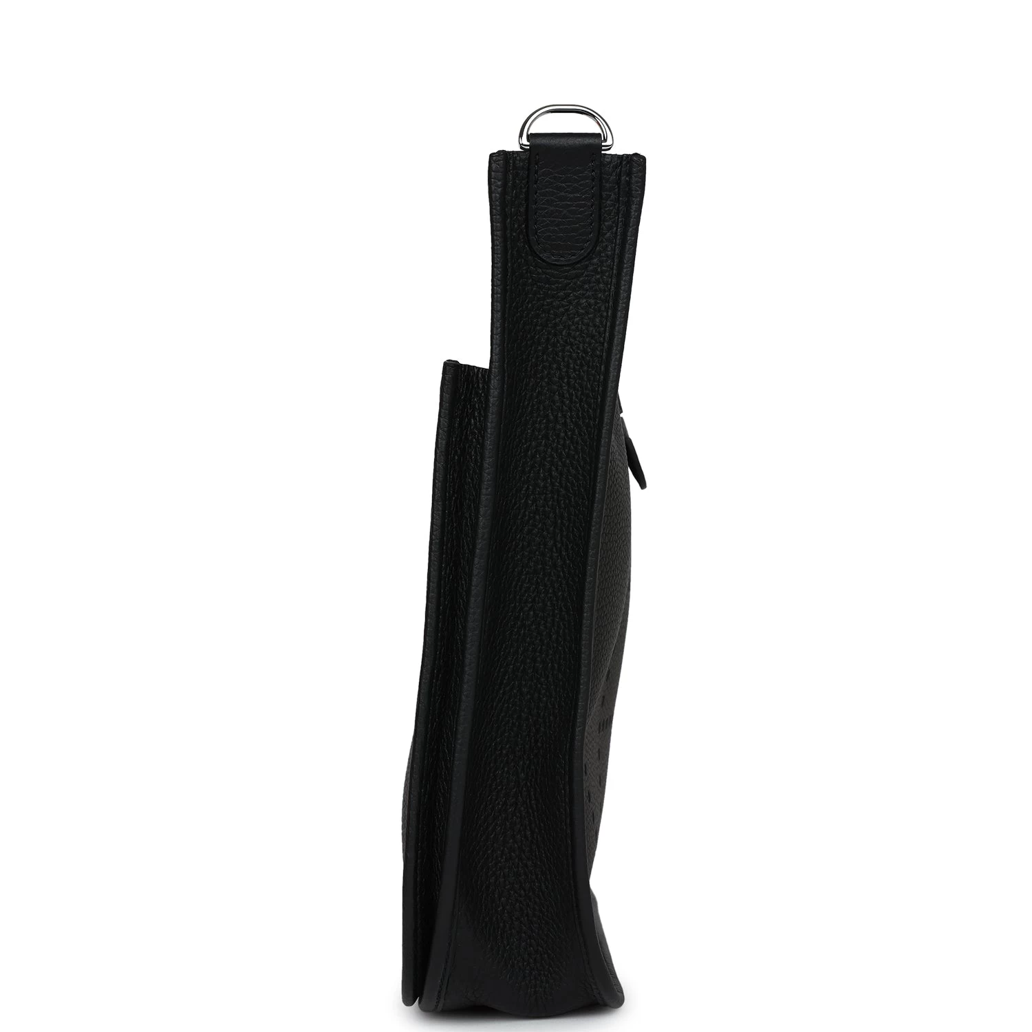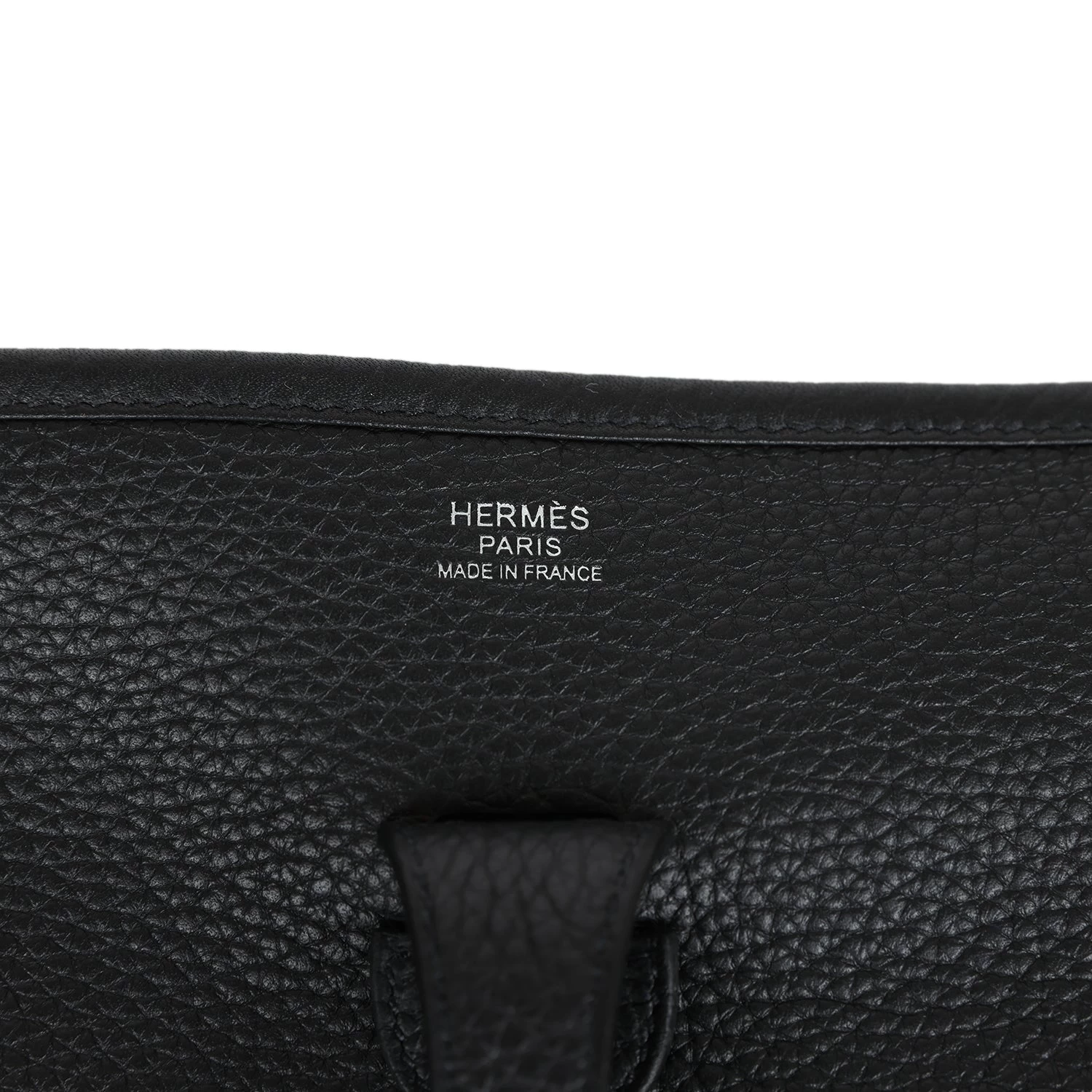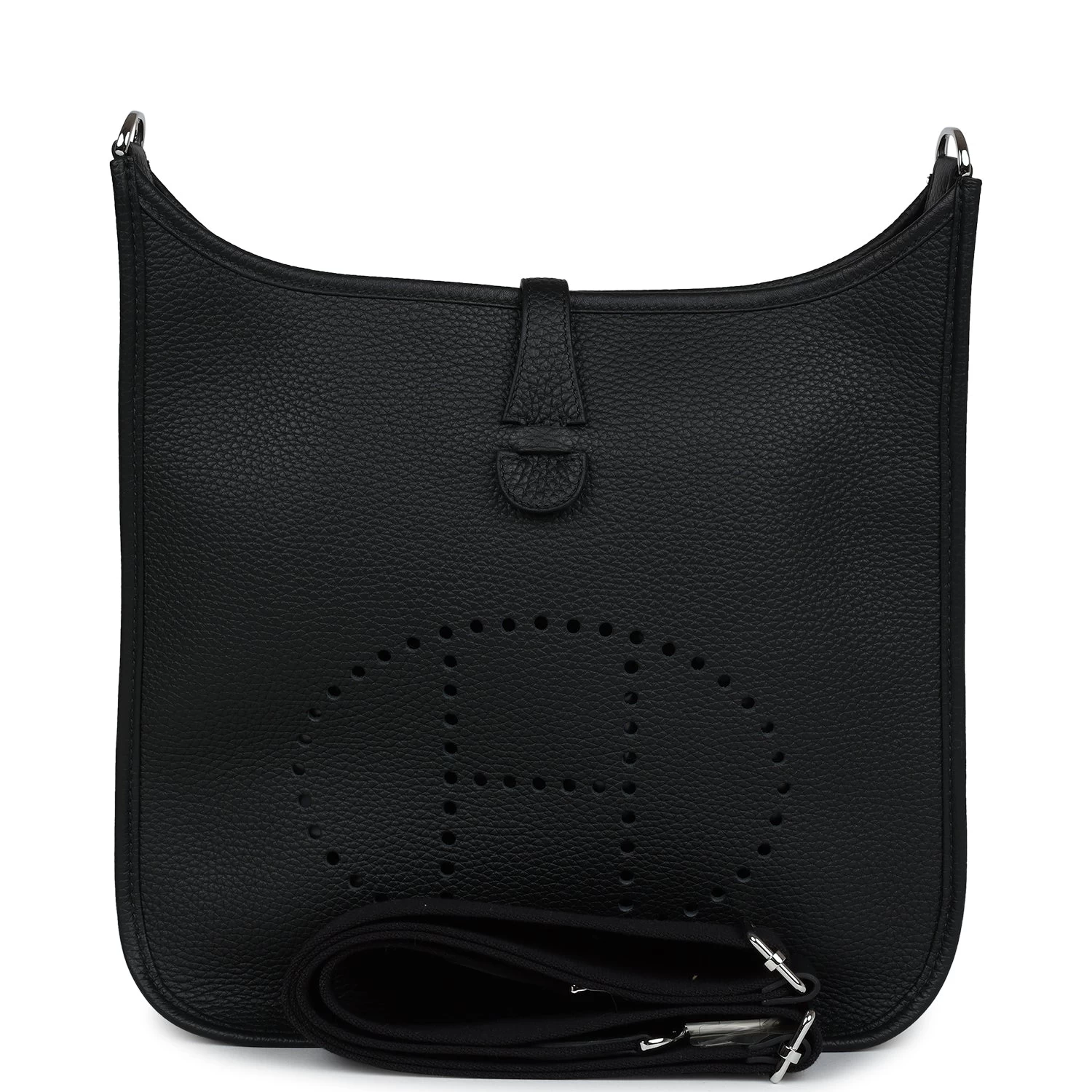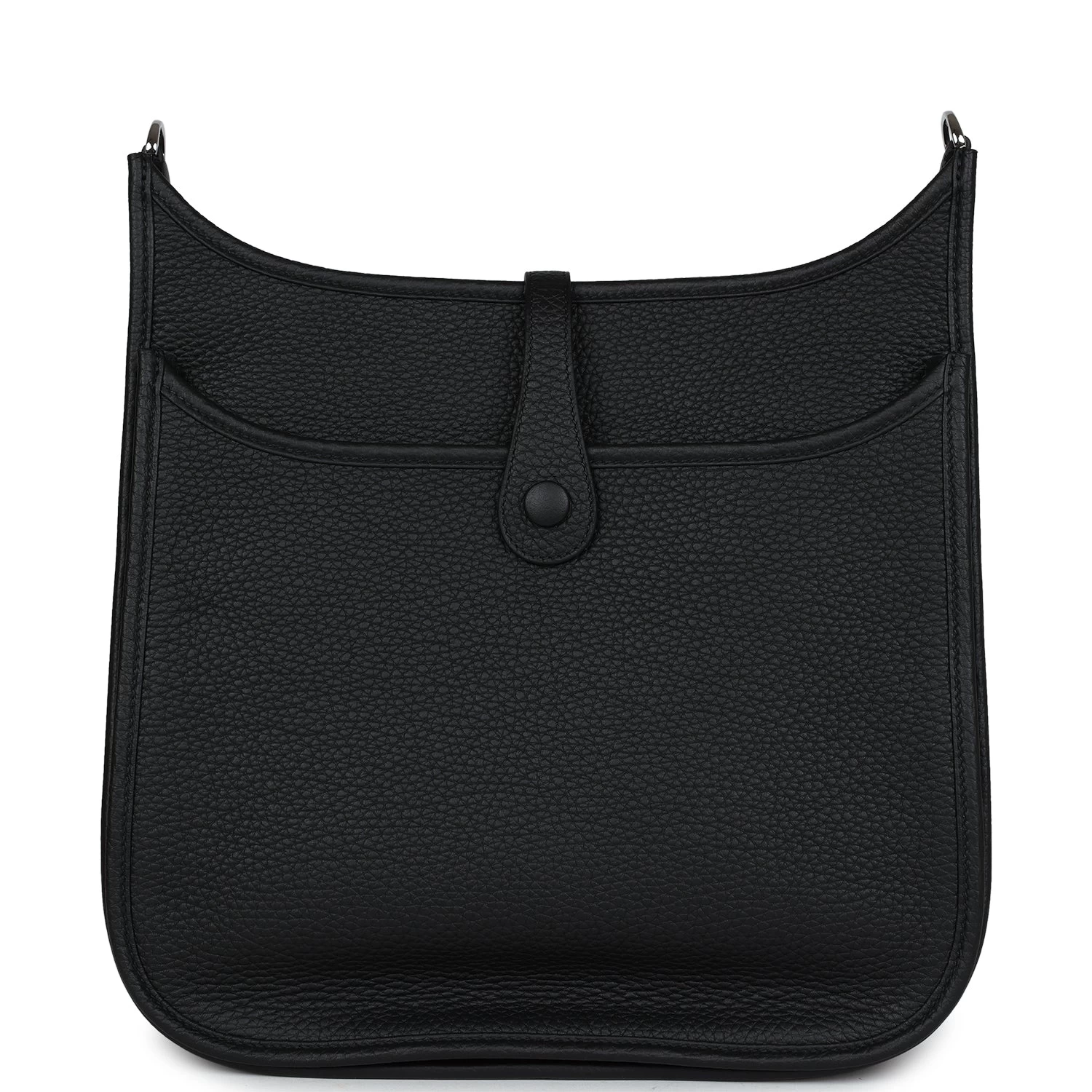 This Evelyne is in Black clemence leather with palladium hardware and has tonal stitching, pull tab top closure and Black removable canvas and leather shoulder/crossbody strap.