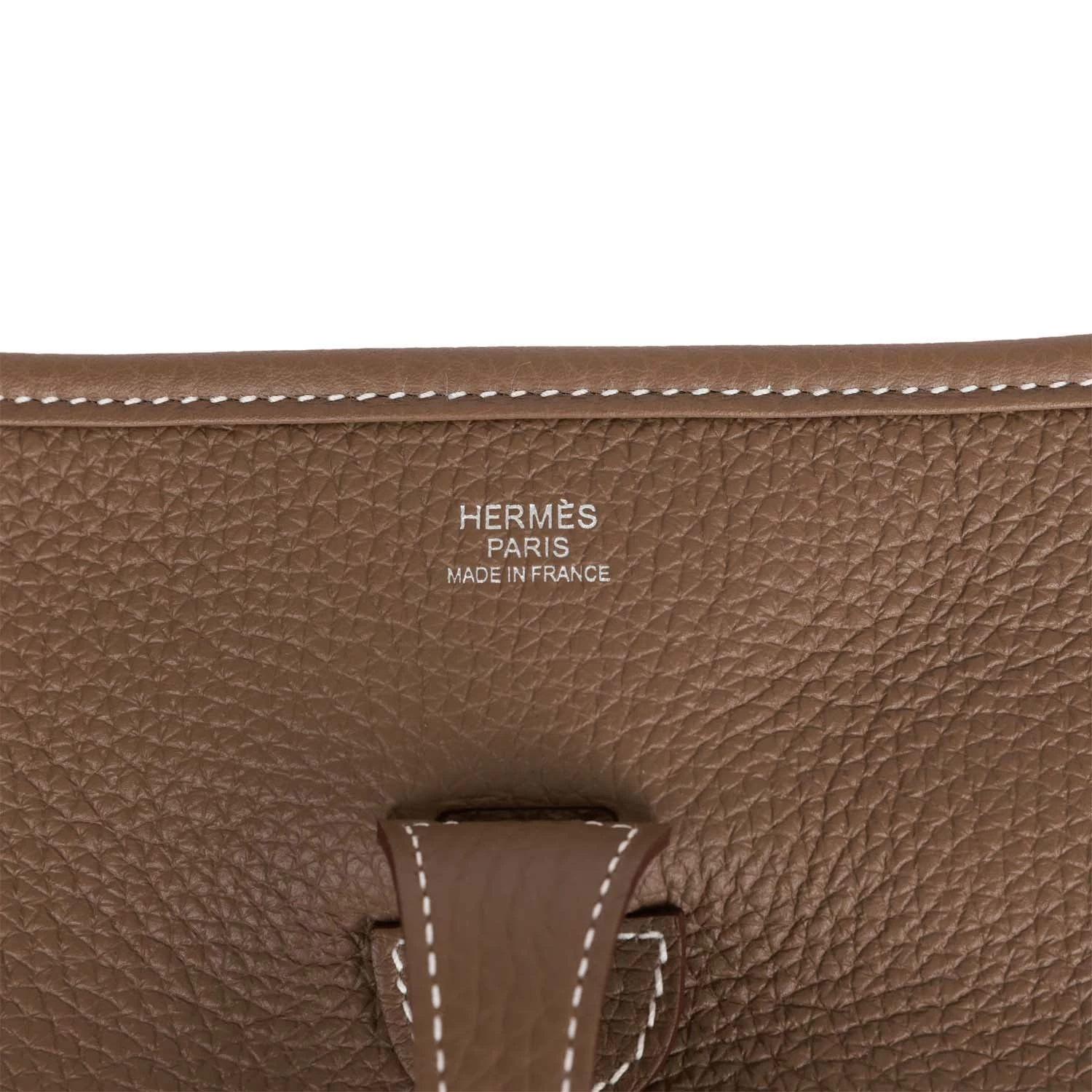 This Evelyne is in Etoupe clemence leather with palladium hardware and has contrast stitching, pull tab top closure and Etoupe removable canvas and leather shoulder/crossbody strap.