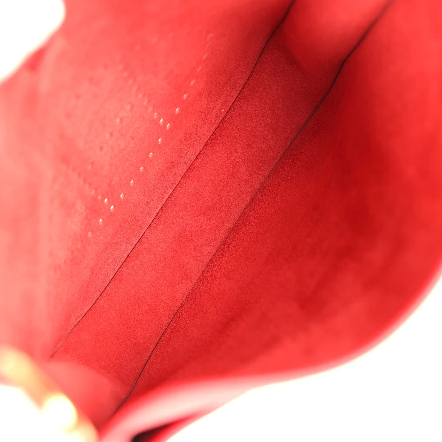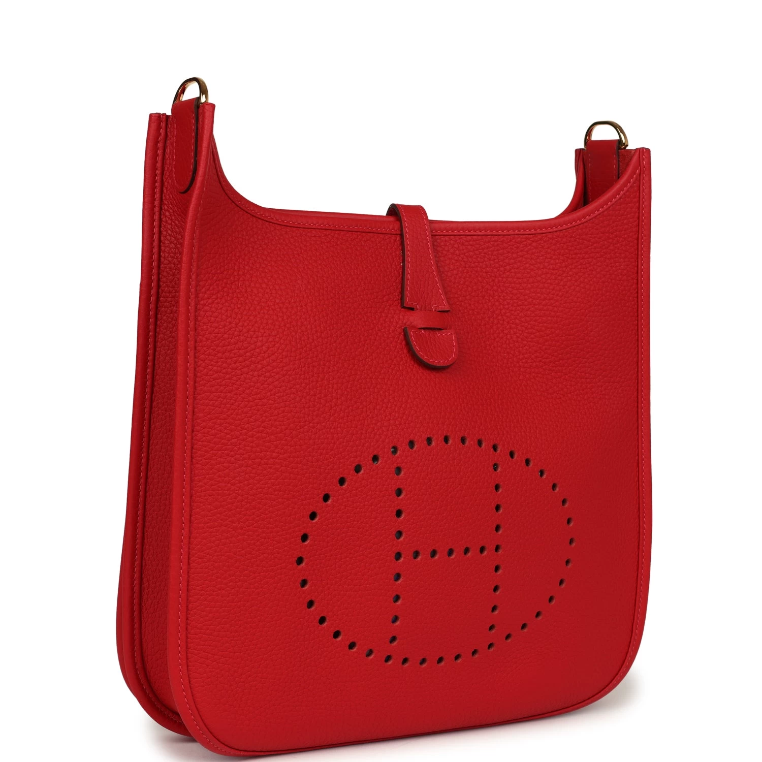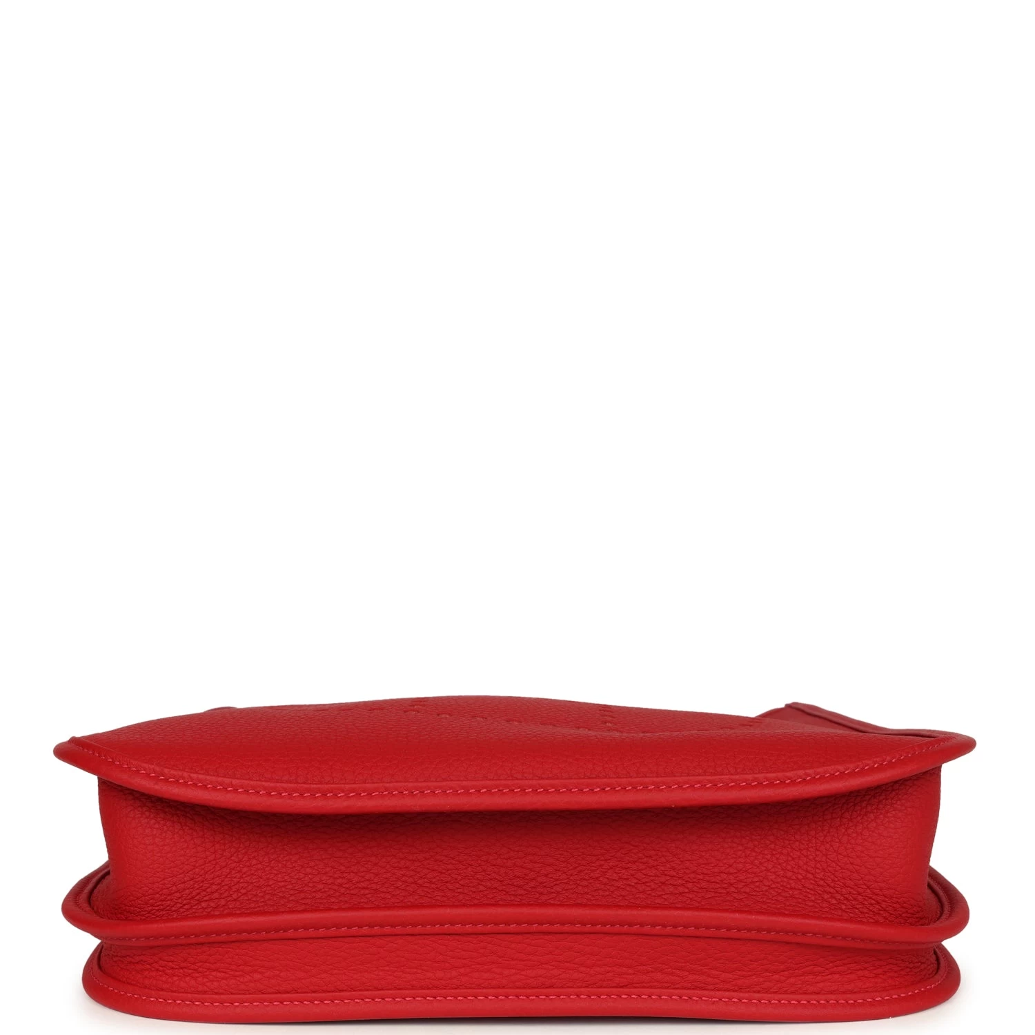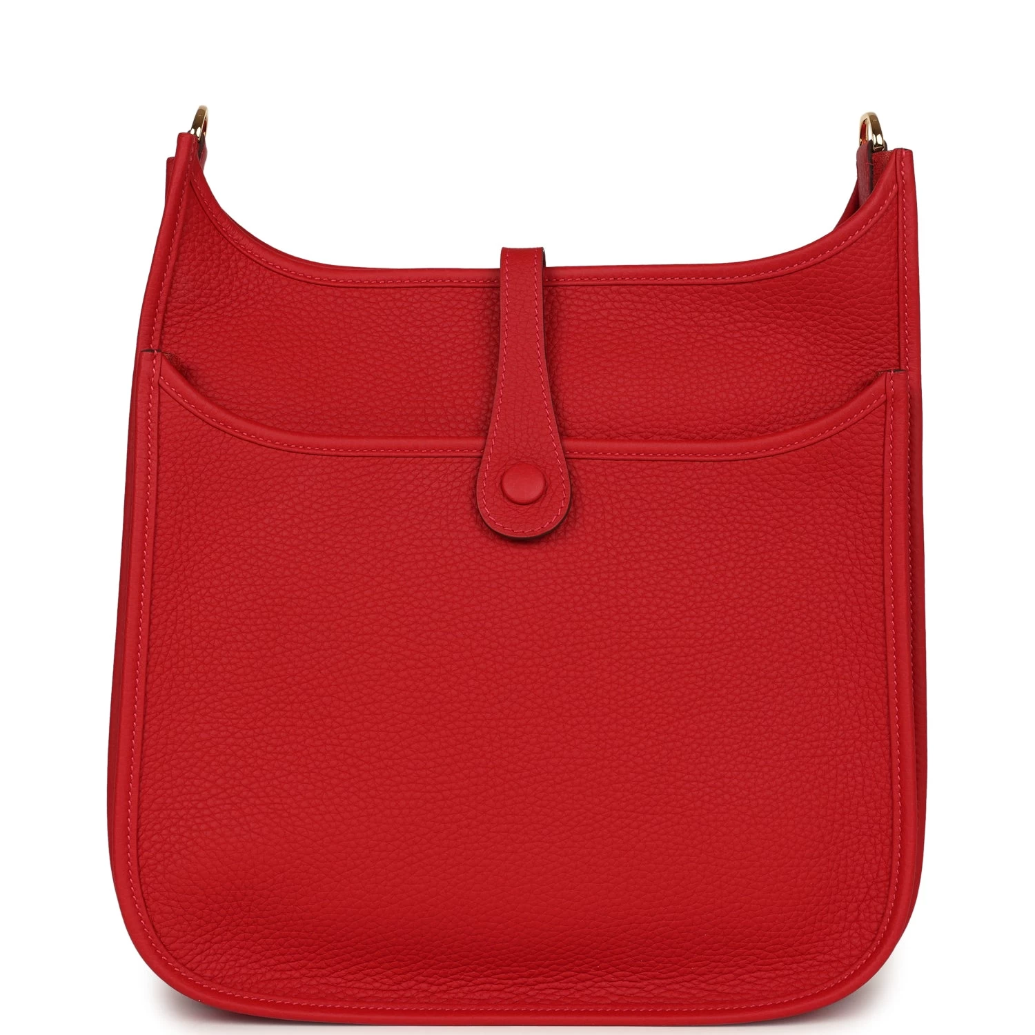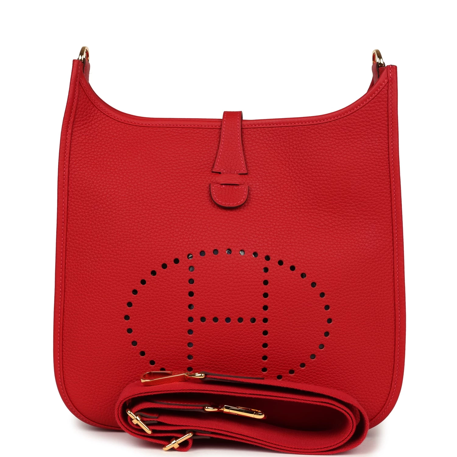 This Evelyne PM is in Vermillon clemence leather with gold hardware, has tonal stitching, pull tab top closure, and Vermillon removable canvas and leather shoulder/crossbody strap.