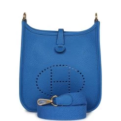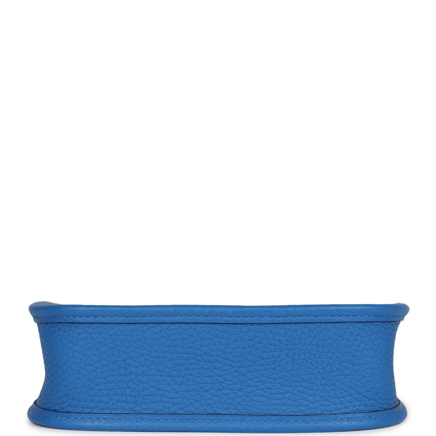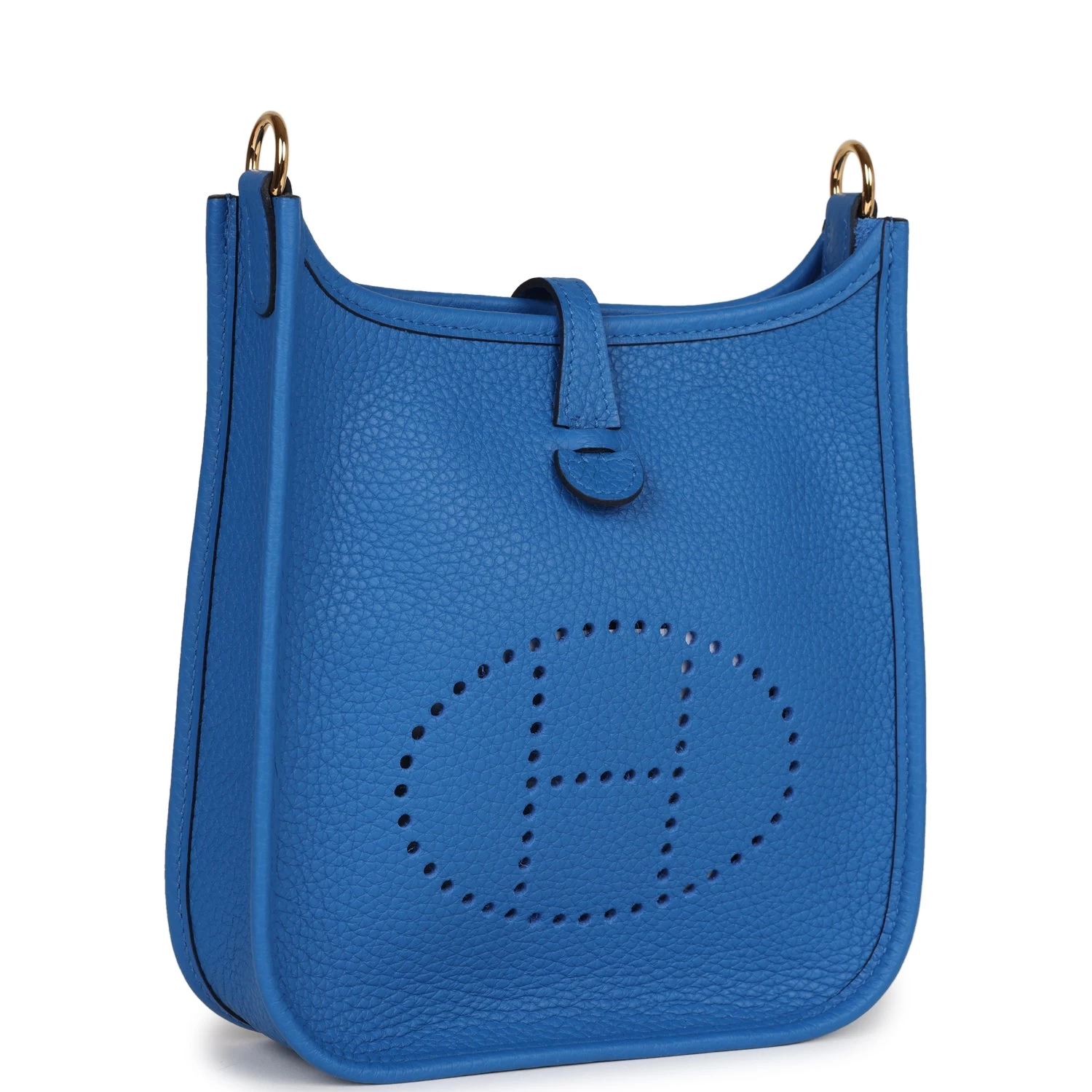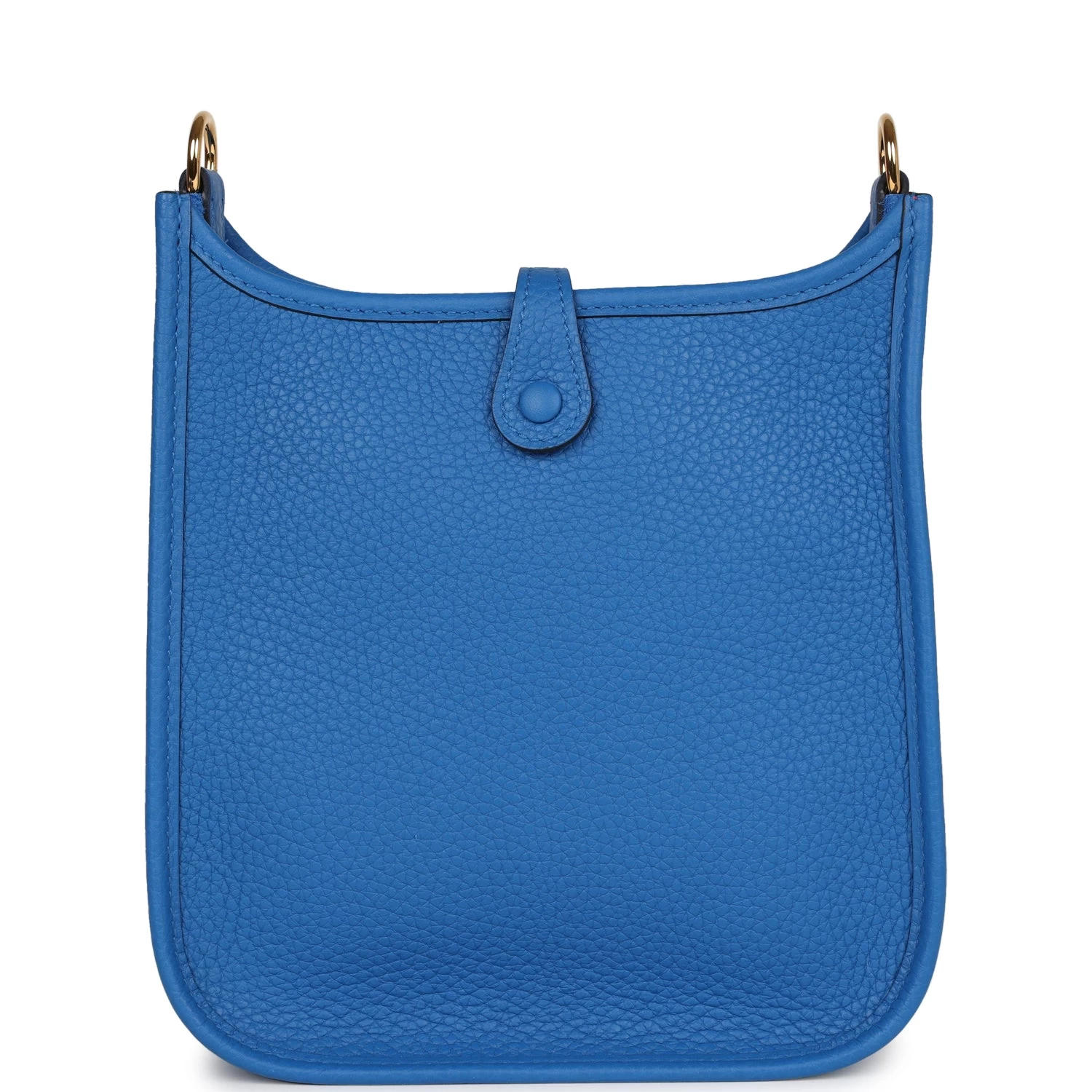 This Evelyne is in Bleu Zellige clemence leather with gold hardware and has tonal stitching, pull tab top closure and a Bleu Zellige removable canvas and leather shoulder/crossbody strap.