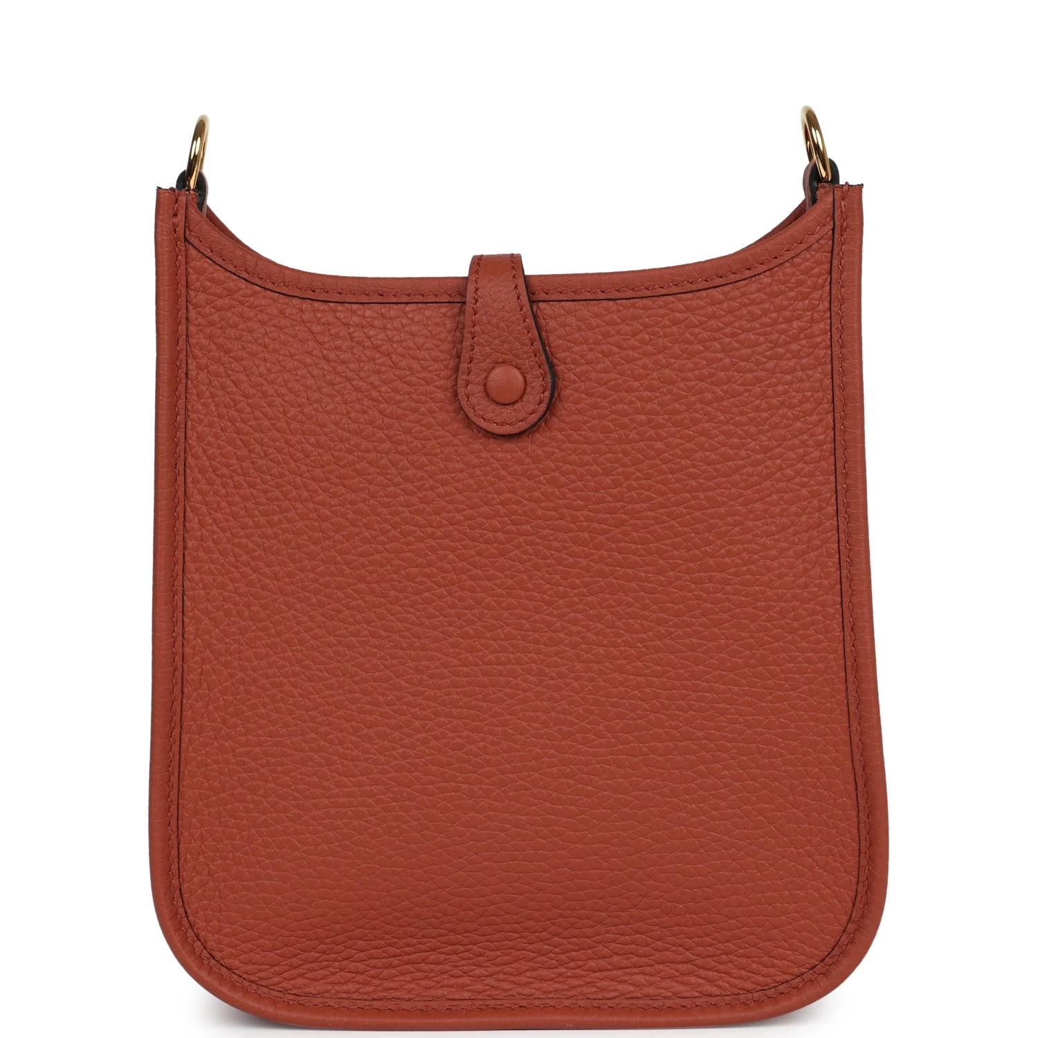 This Hermes Evelyne TPM is in Cuivre Taurillon clemence leather with gold hardware, tonal stiching, gold hardware, large perforated H in circle (front), pull tab snap closure, and a detachable Cuivre shoulder/crossbody strap.