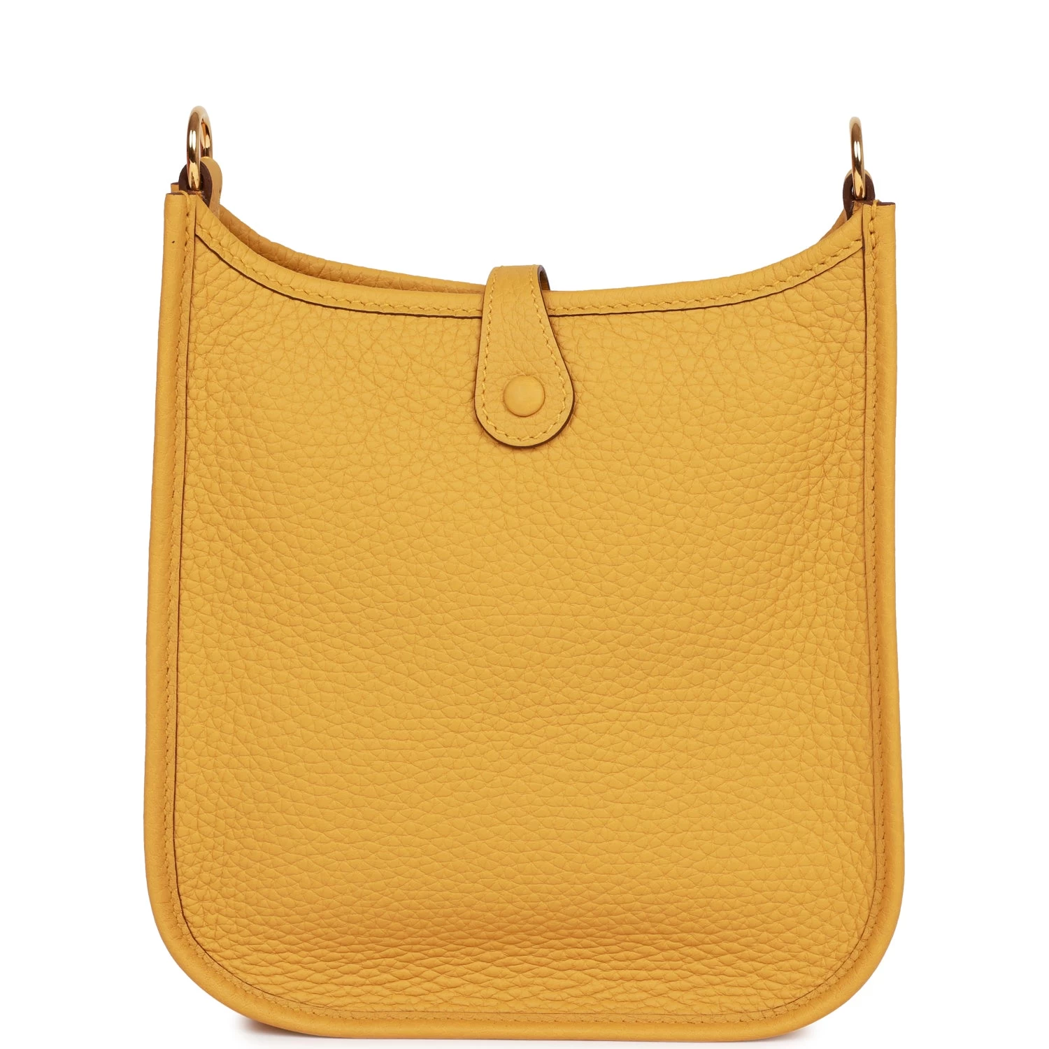 This Evelyne is in Jaune Ambre clemence leather with gold hardware and has tonal stitching, pull tab top closure and a Jaune Ambre removable canvas and leather shoulder/crossbody strap.