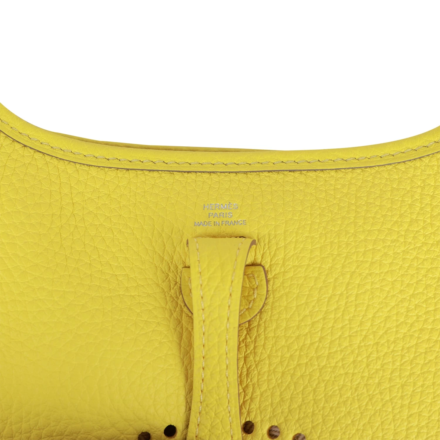This Evelyne TPM is in Lime clemence leather with palladium hardware and features tonal stitching stitching, pull tab top closure and a quadrille removable canvas and leather shoulder/crossbody strap.