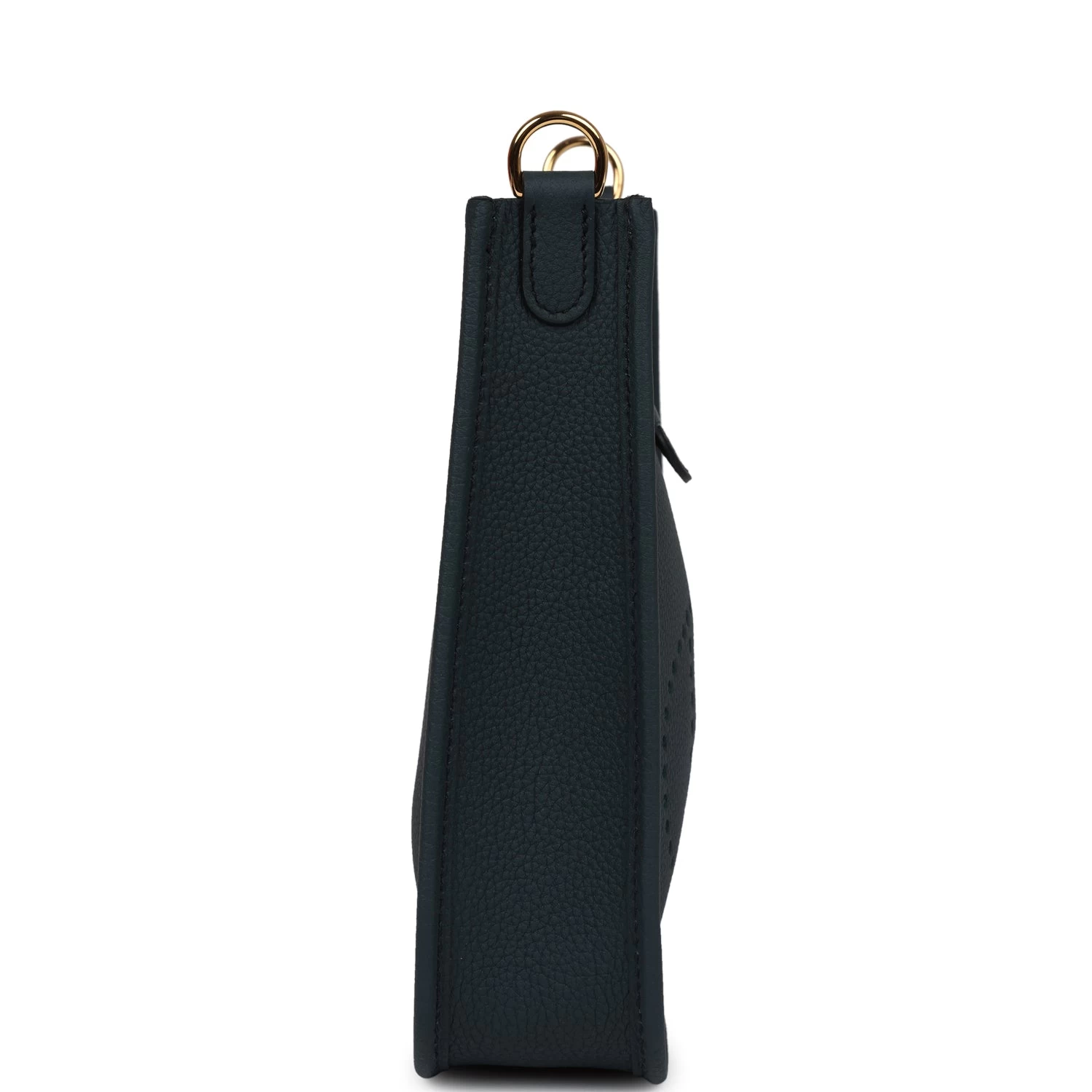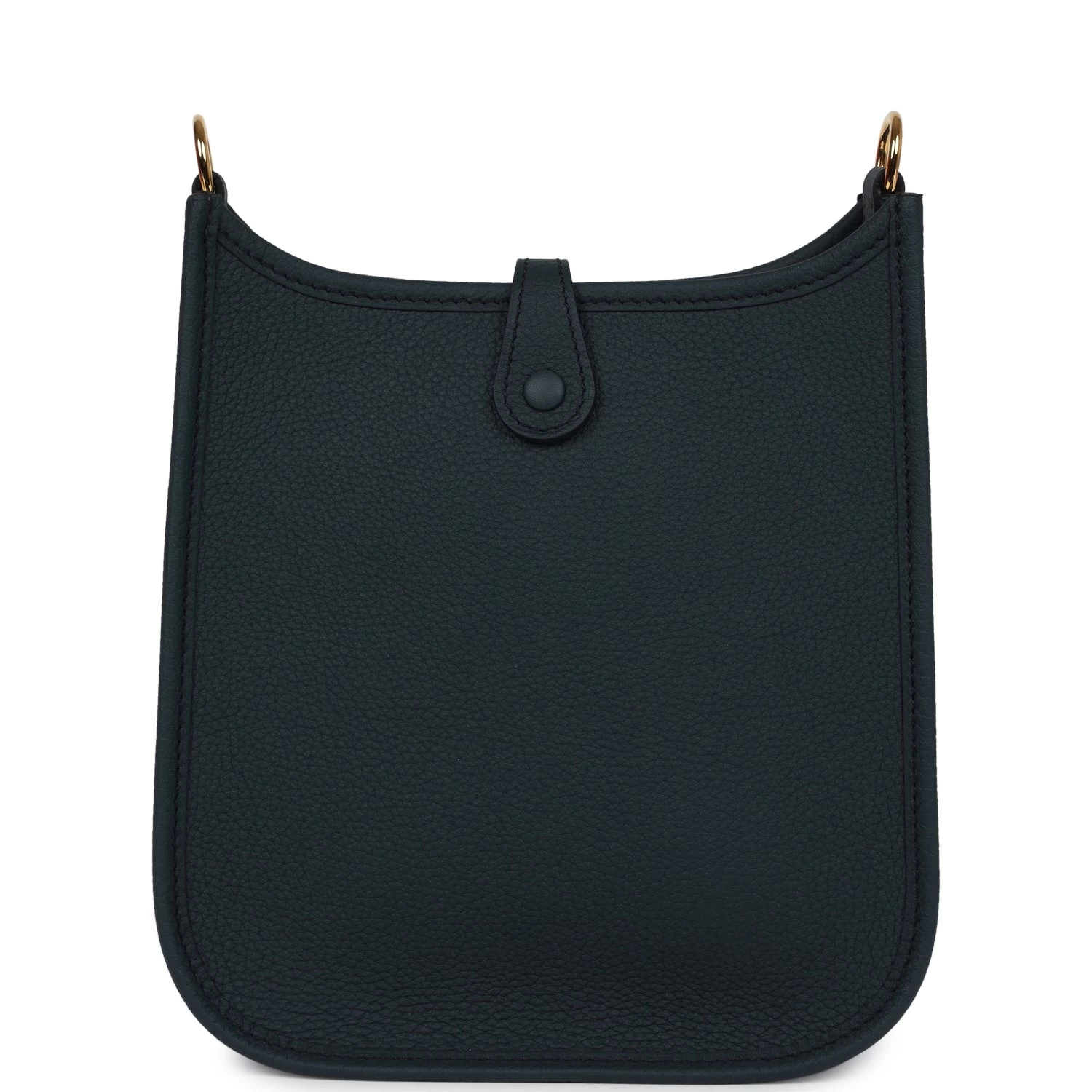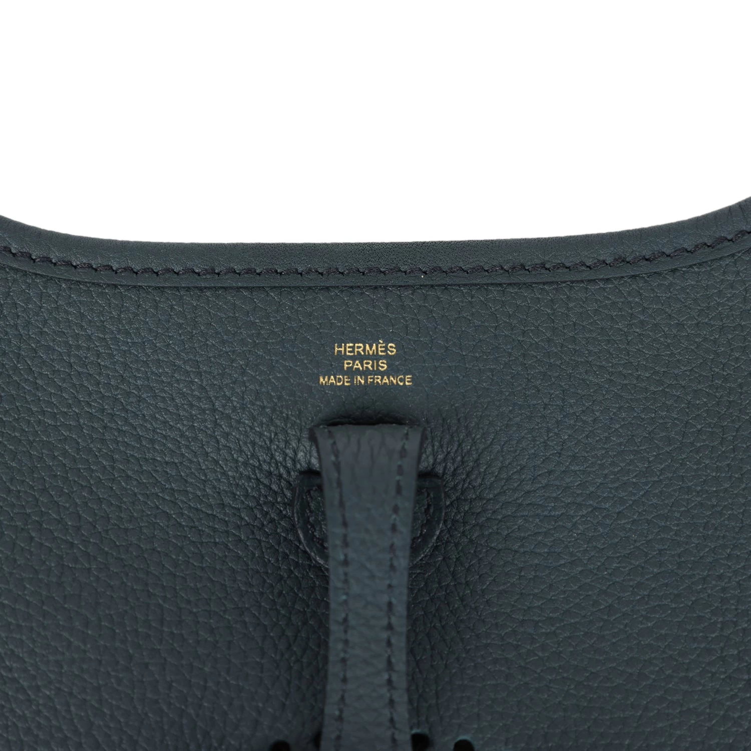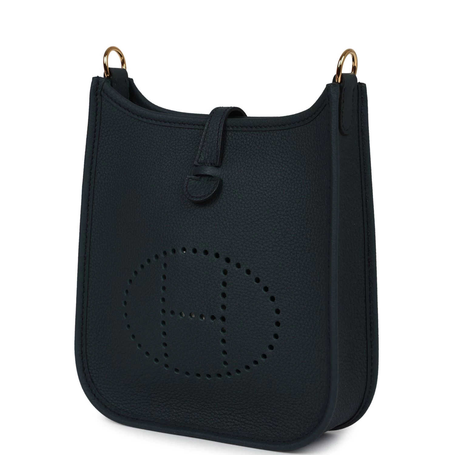 This Evelyne TPM is in Vert Cypress clemence leather with Gold hardware and features tonal stitching, large perforated H in circle (front), pull tab top closure and a matching removable canvas and leather shoulder/crossbody strap.