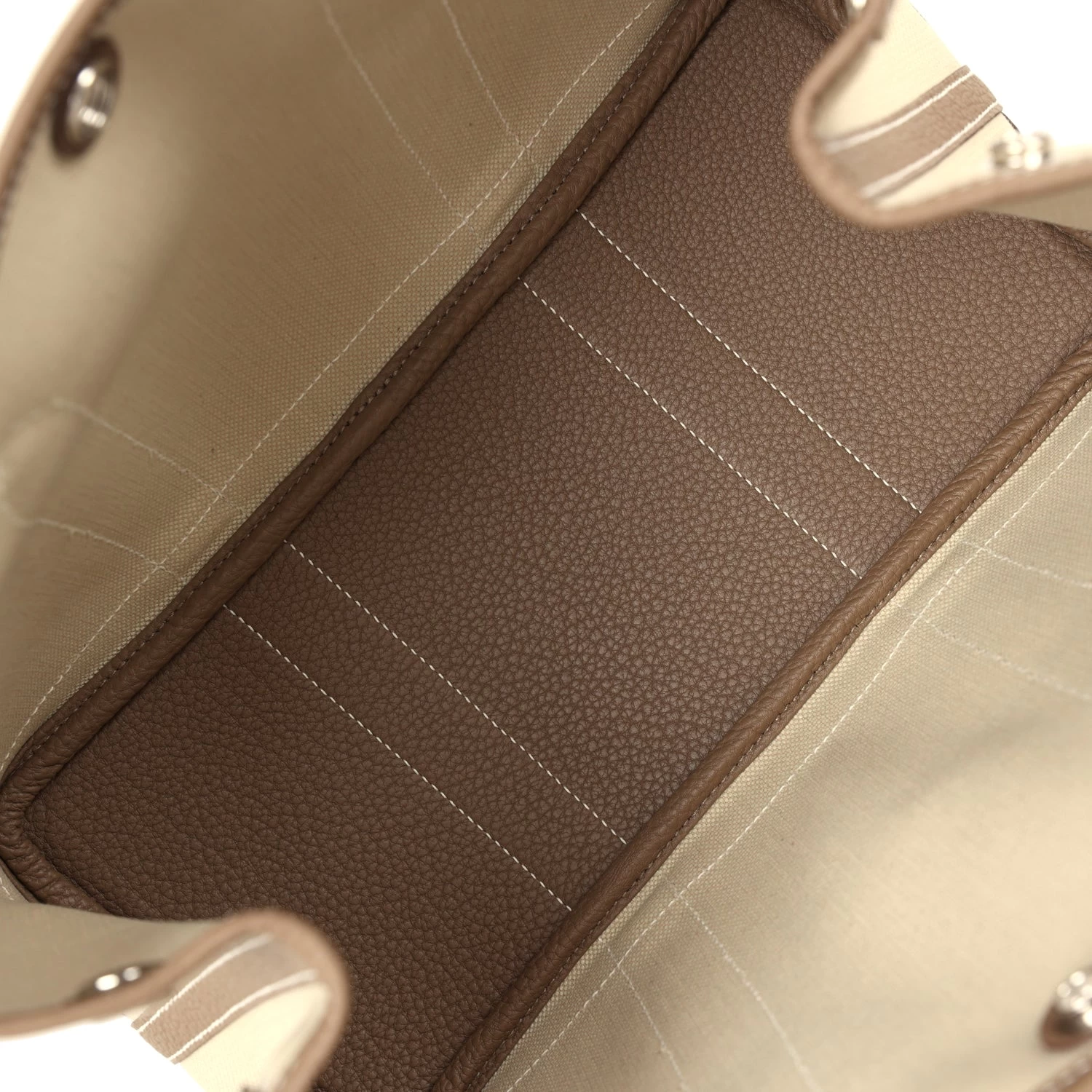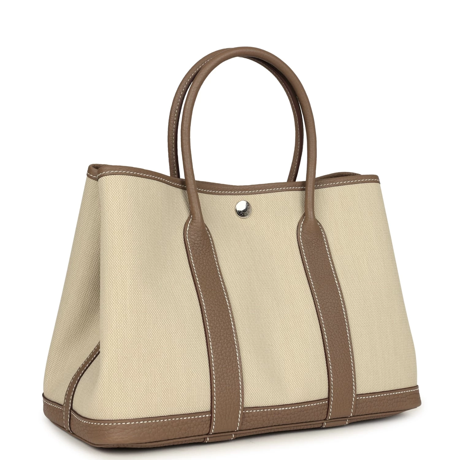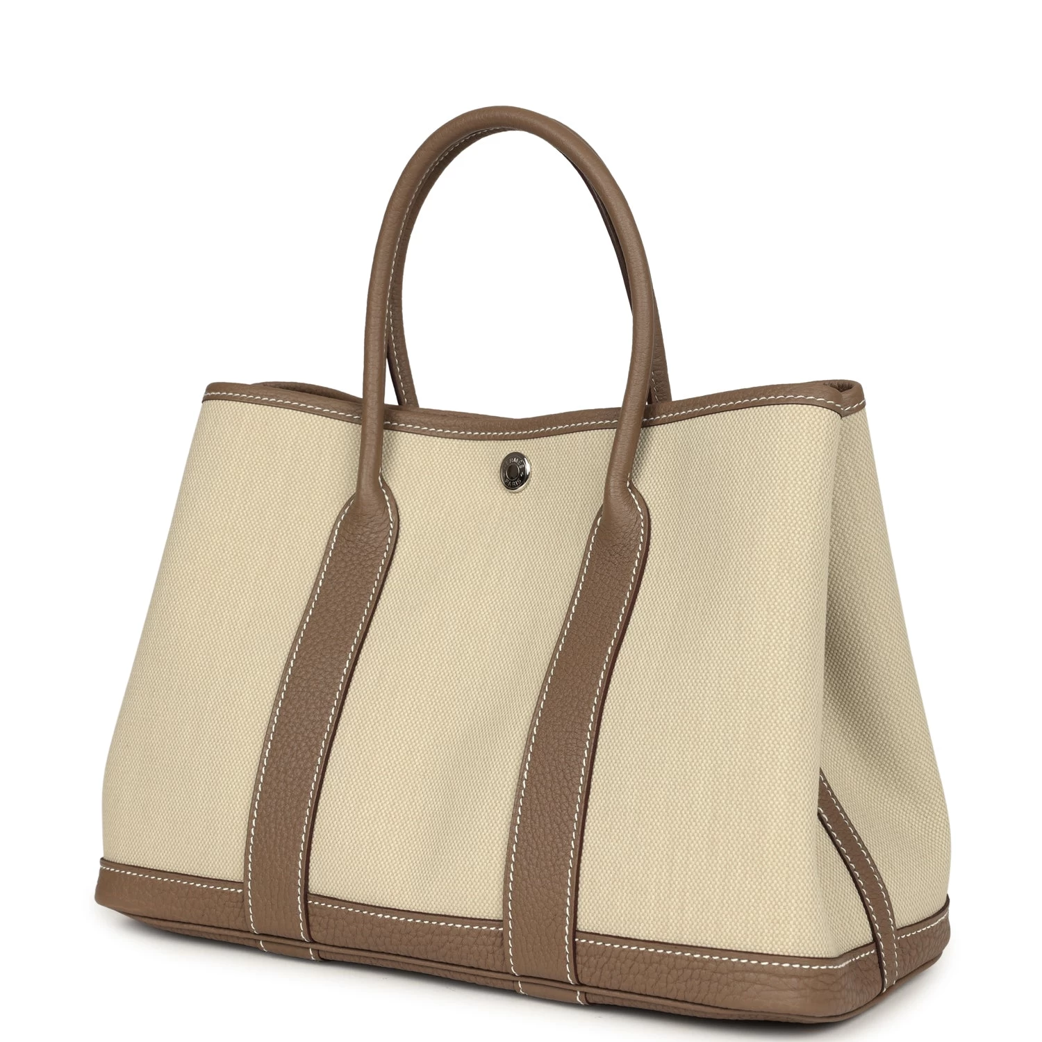 This Garden Party 30 is in Ecrue toile and Etoupe negonda with palladium hardware and contrast white stitching, one engraved palladium front snap closure with two snap closures on the side to adjust bag width. This bag features two top handles.