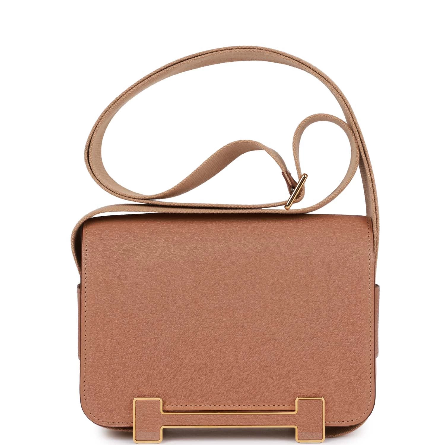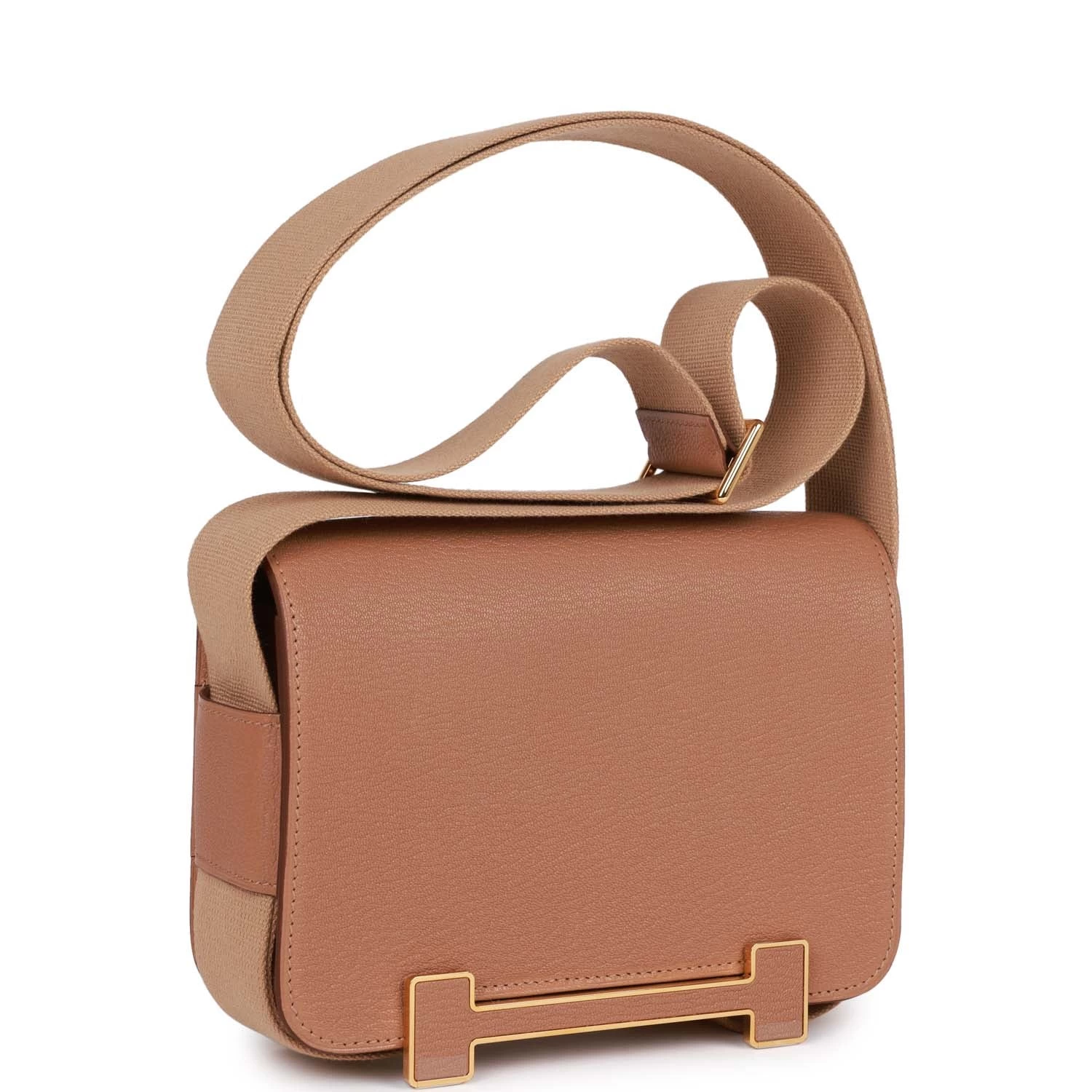 This Hermes Geta Bag is in Quebracho and Chai chevre leather with gold hardware, tonal stitching, single magnetic flap closure, and adjustable shoulder strap.