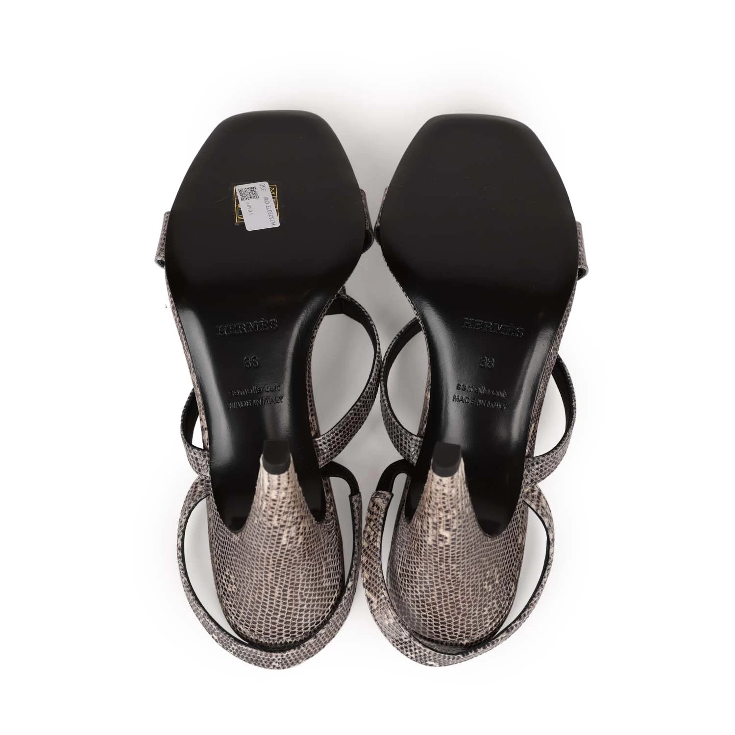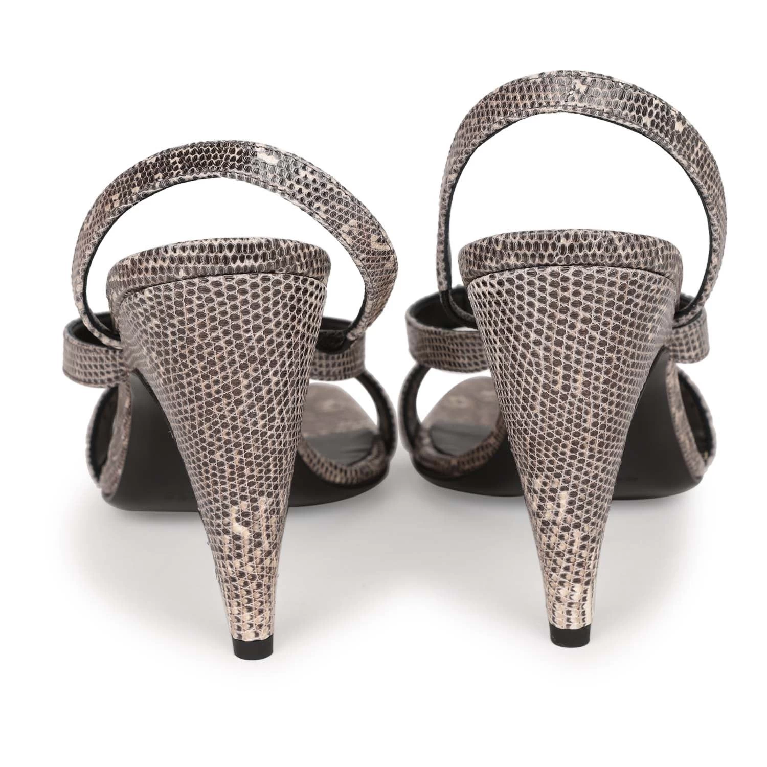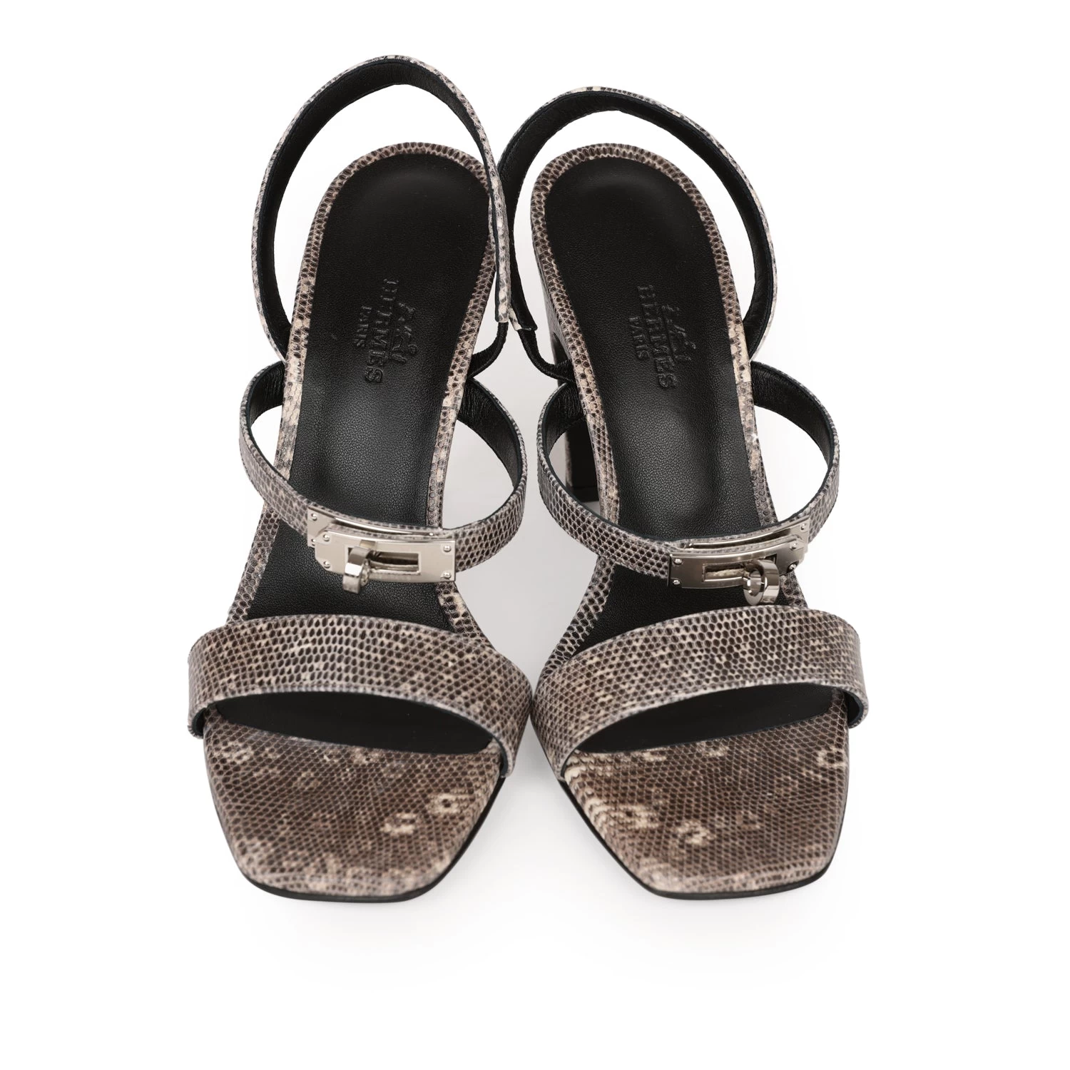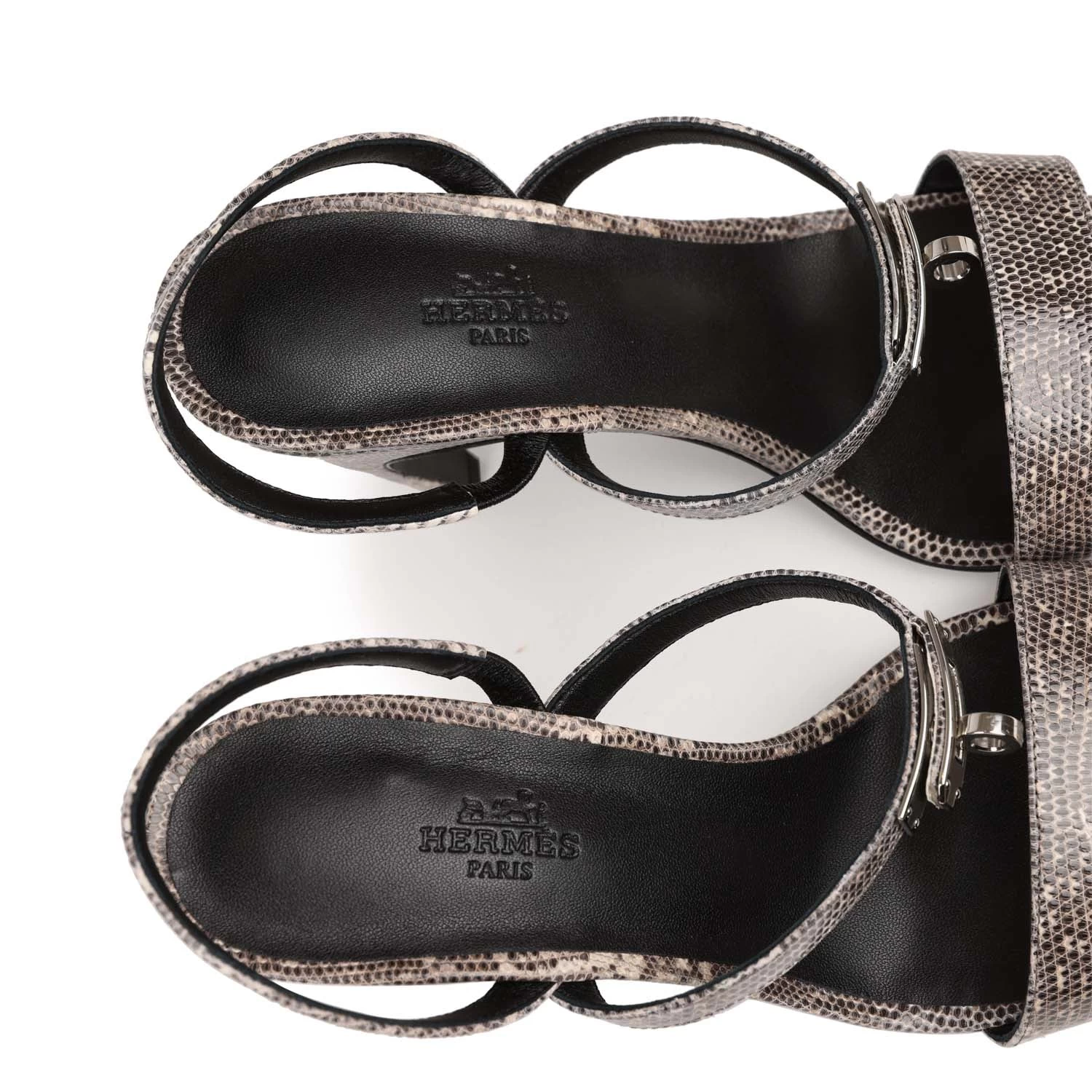 This pair of Glamour 95 sandals are in Ombre Lizard with palladium hardware, kelly buckle closure strap, black leather sole, and Ombre Lizard exterior leather.