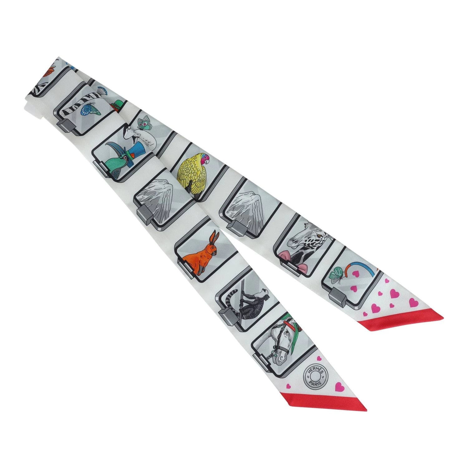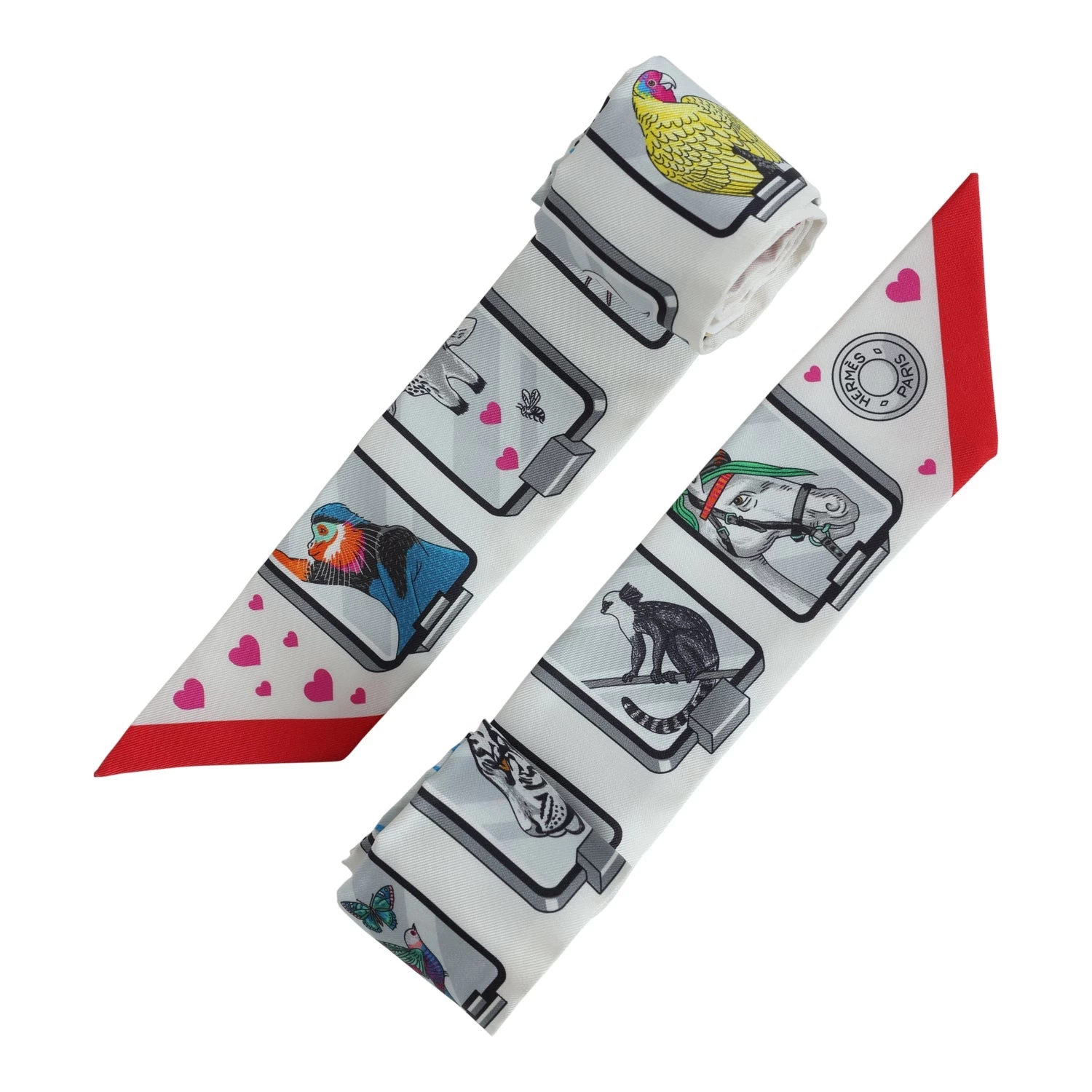 This silk twilly pair is in a Blanc, Gris and Rouje colorway.