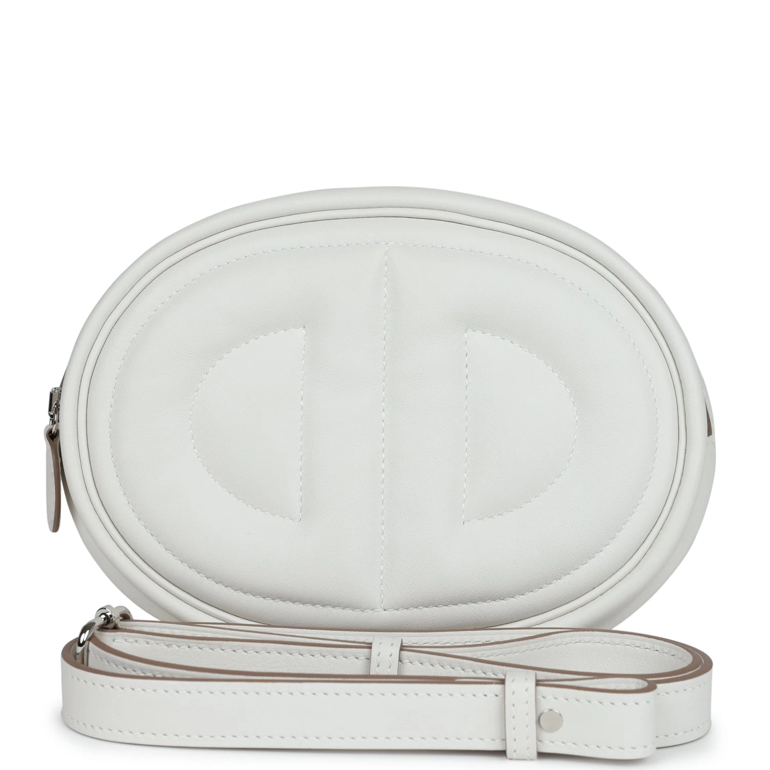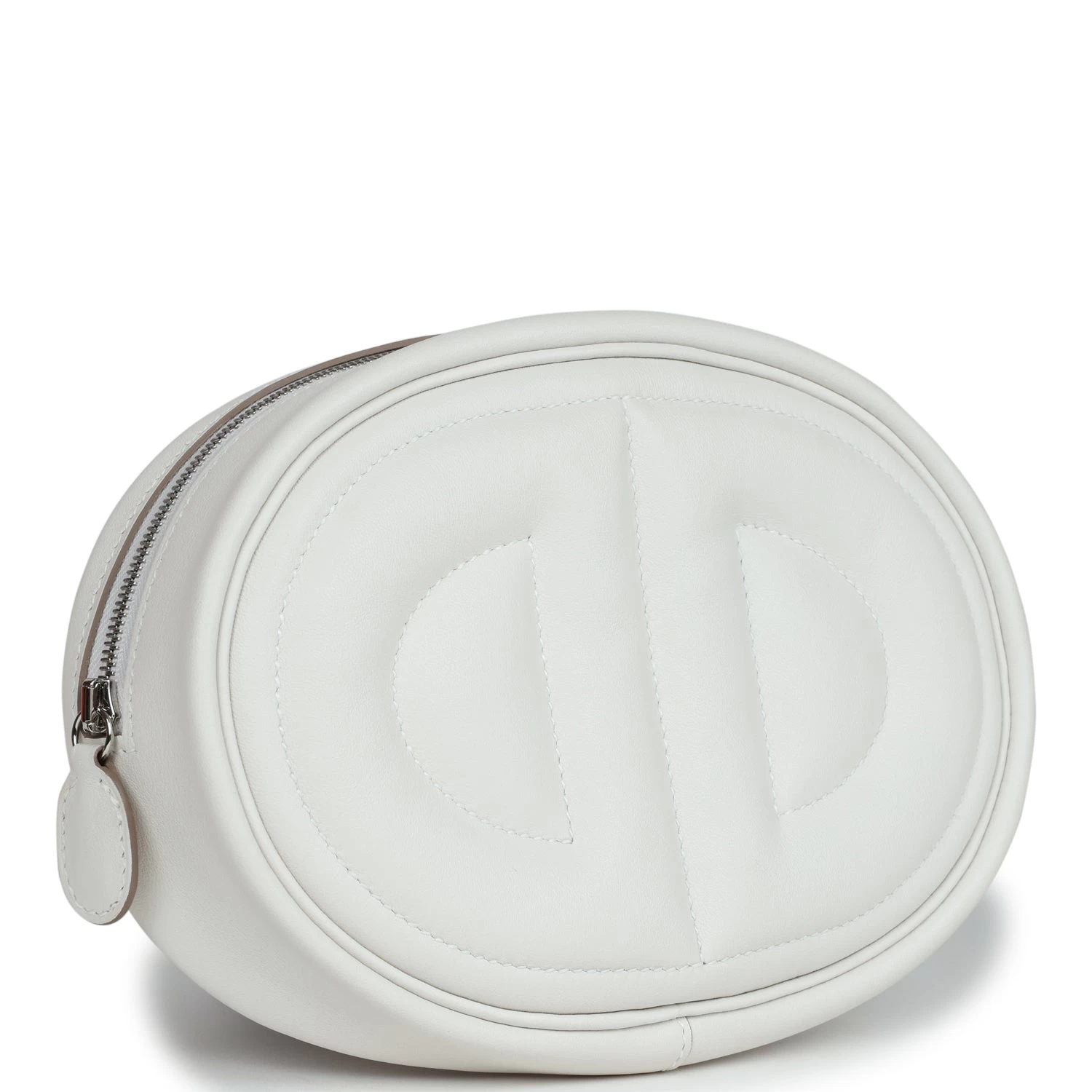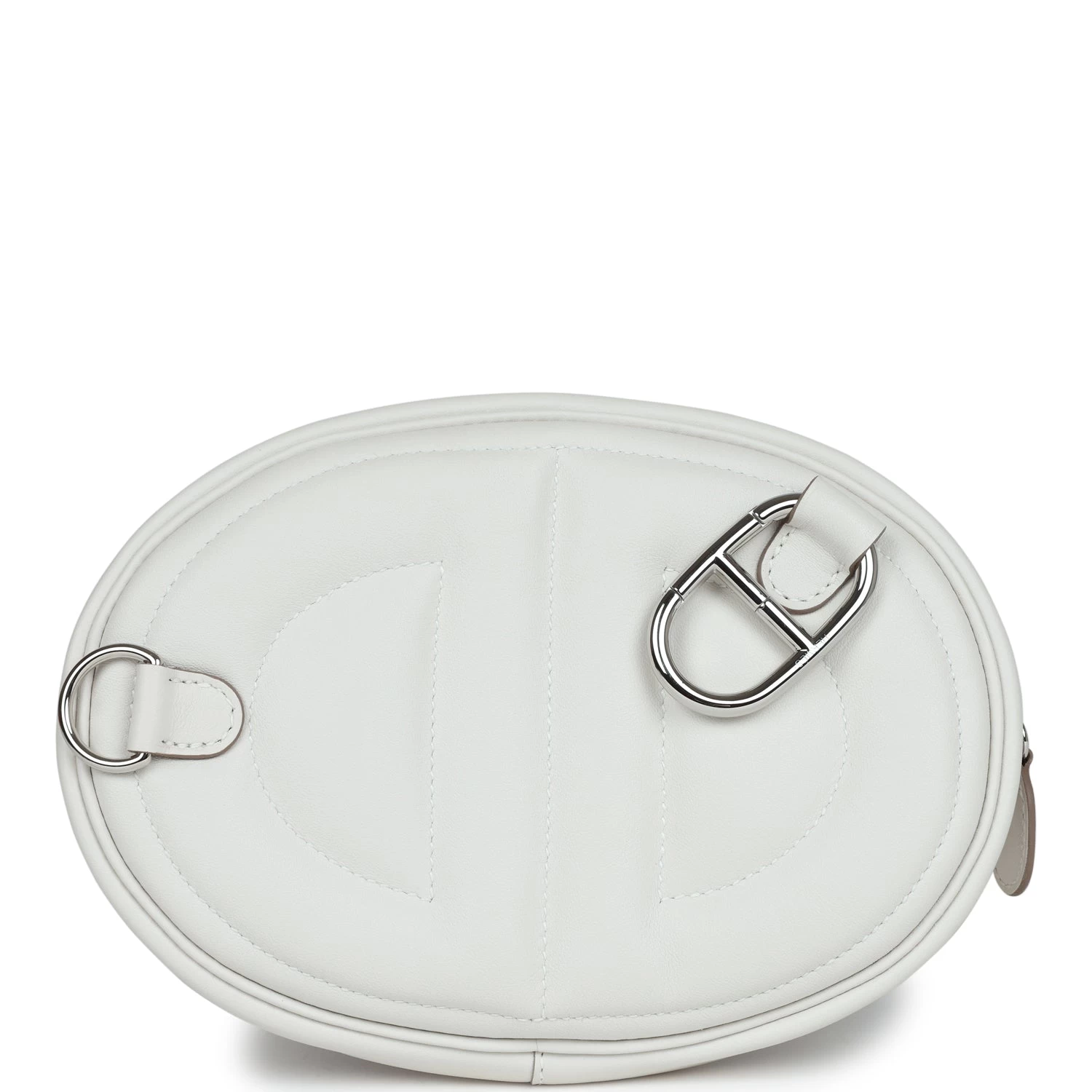 This In the Loop Belt Bag is in Gris Pale and Gris Meyer swift leather with Palladium hardware, features tonal stitching, oval shaped belt bag with a quilted Two Chaine d’Ancre embossed on the front and bag of belt bag, zipper closure, and removable belt bag strap.