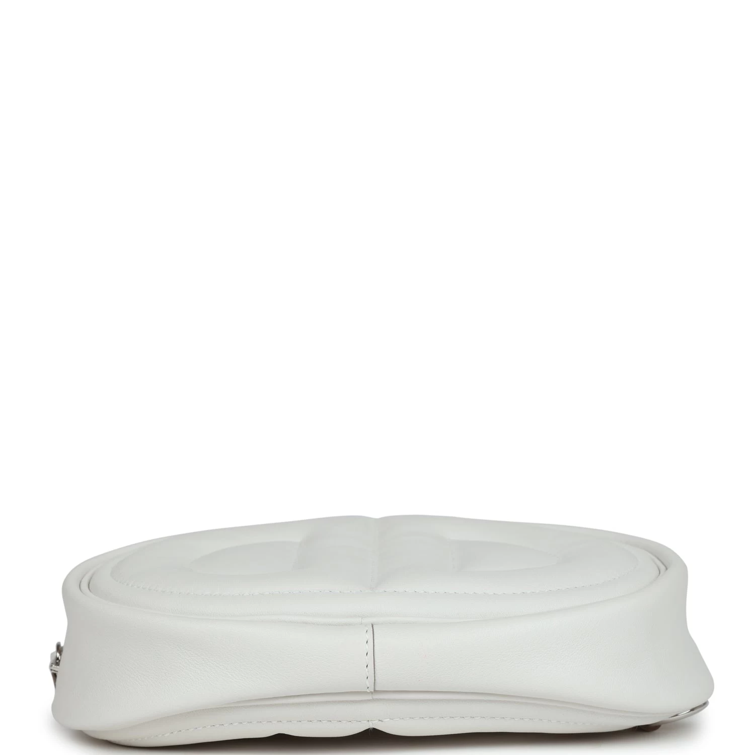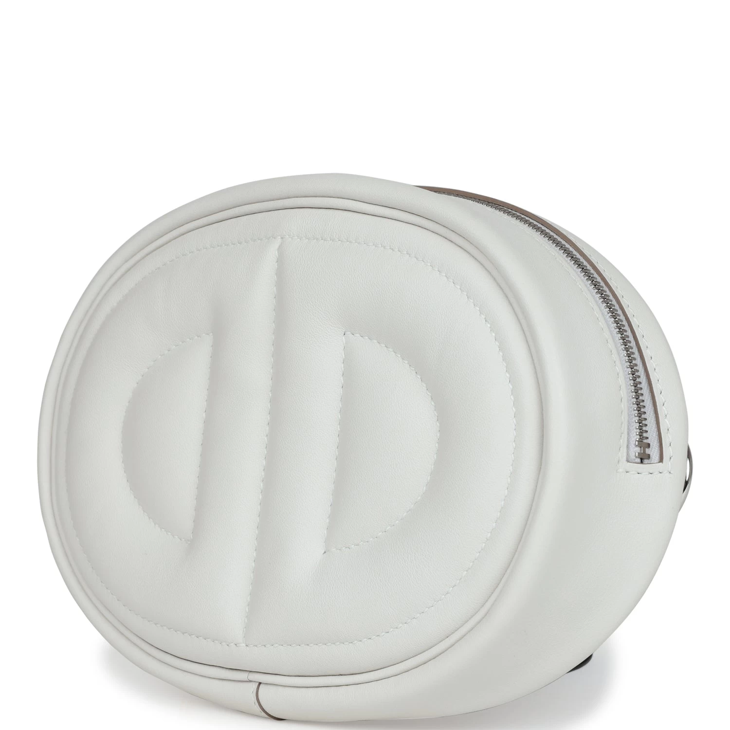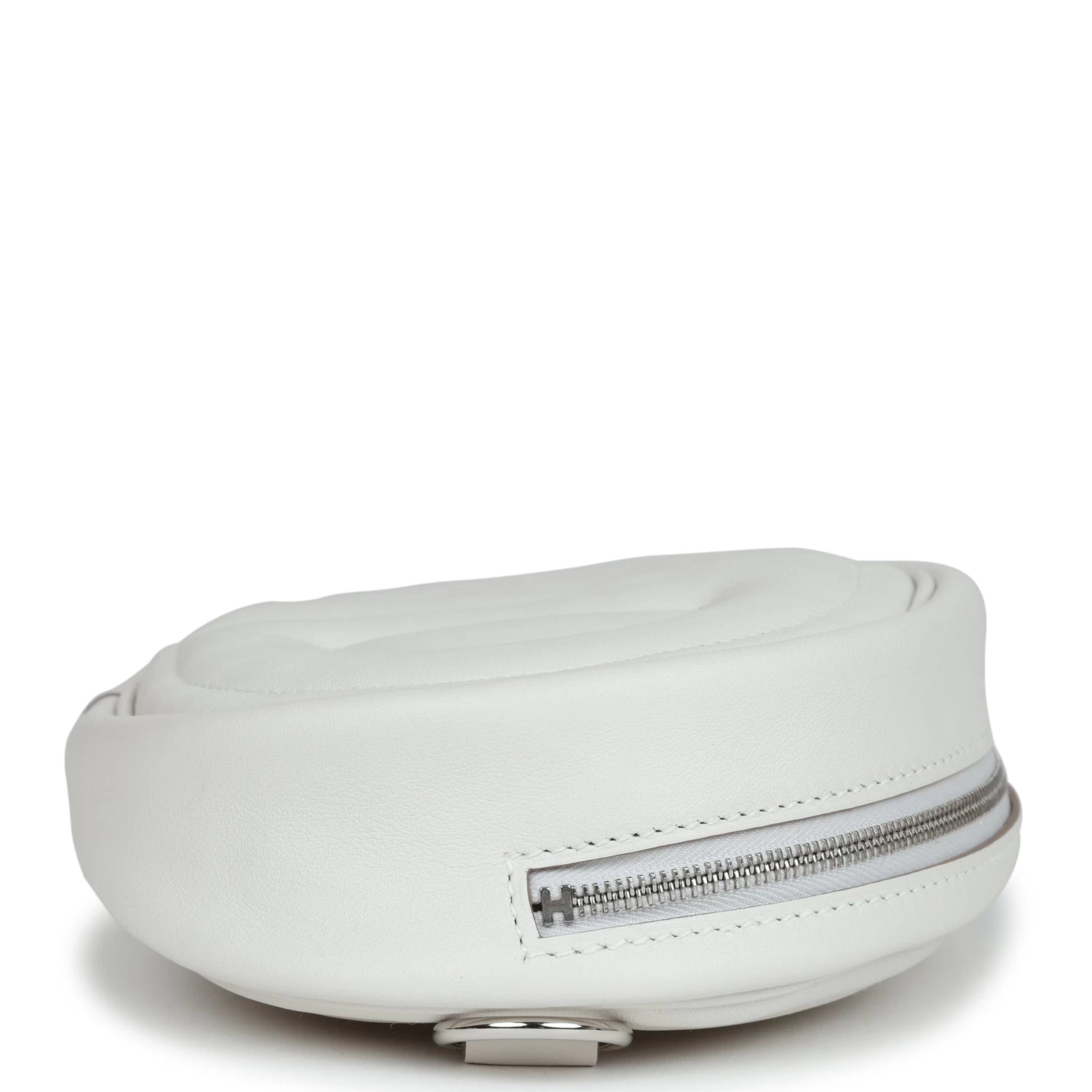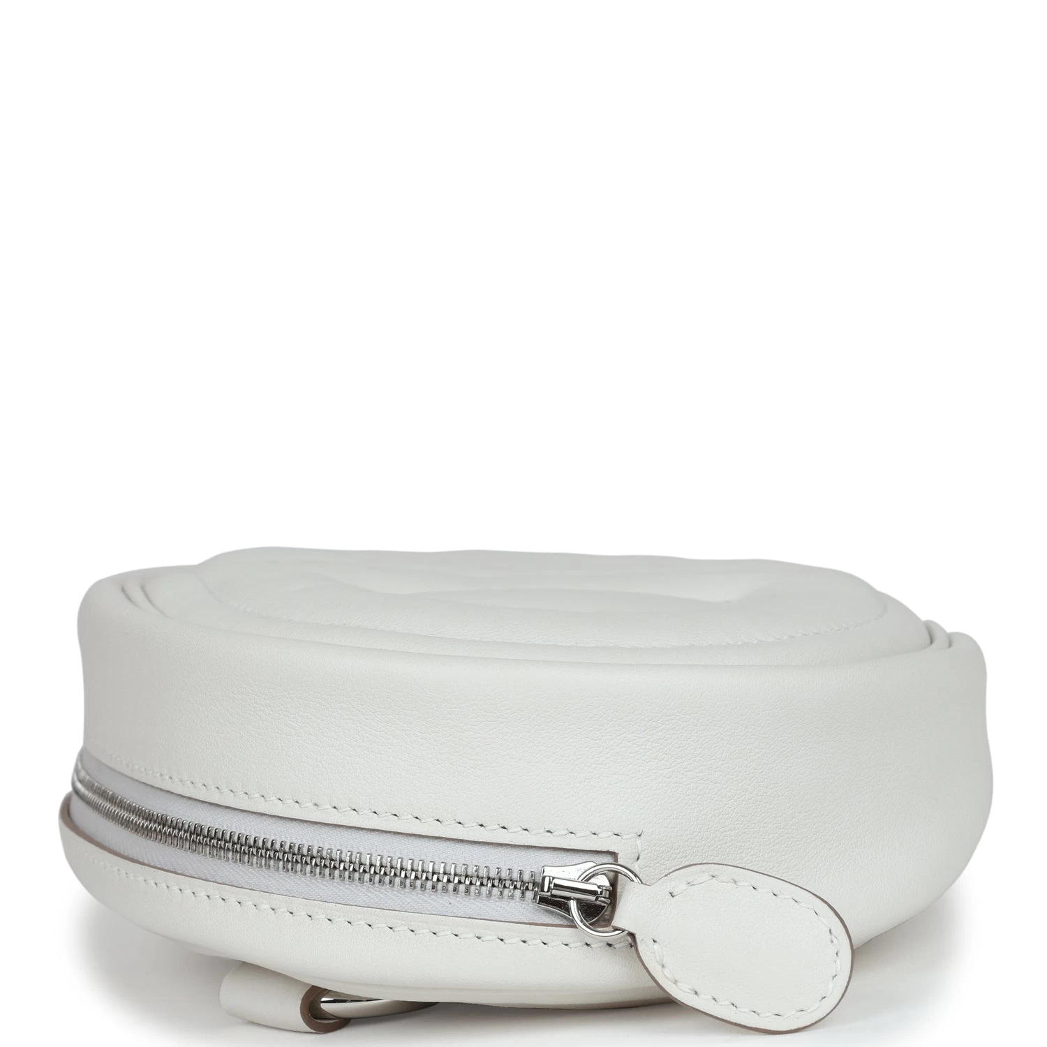 This In the Loop Belt Bag is in Gris Pale and Gris Meyer swift leather with Palladium hardware, features tonal stitching, oval shaped belt bag with a quilted Two Chaine d’Ancre embossed on the front and bag of belt bag, zipper closure, and removable belt bag strap.