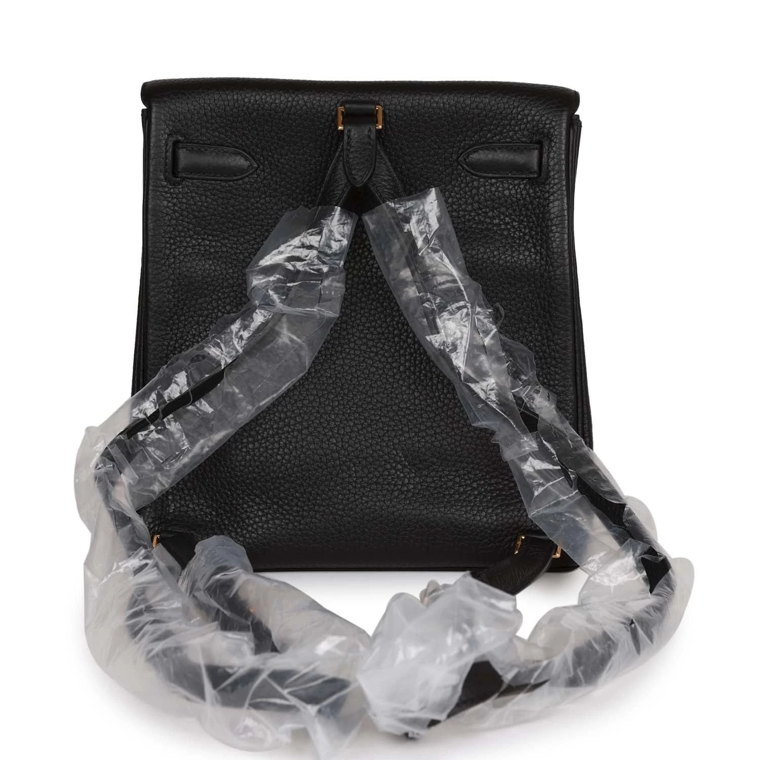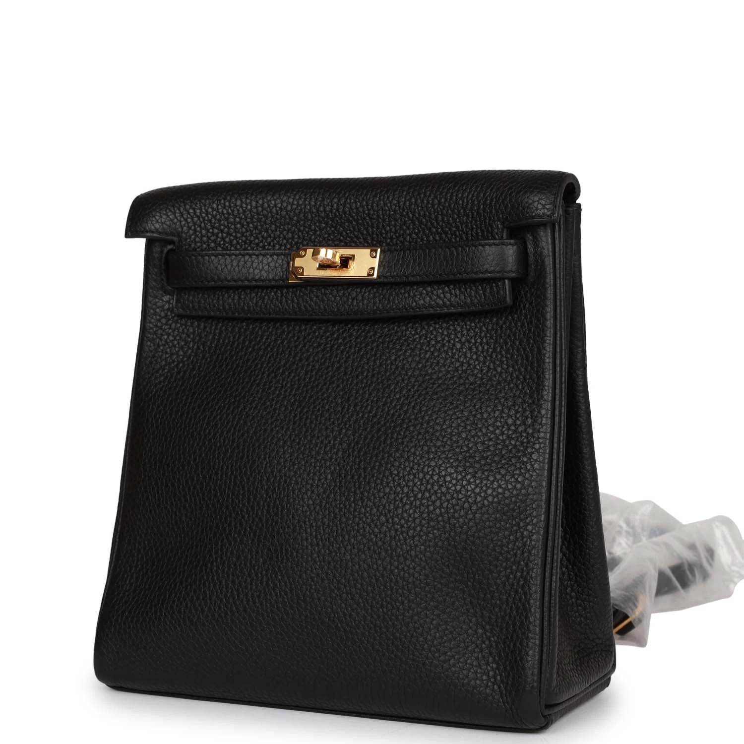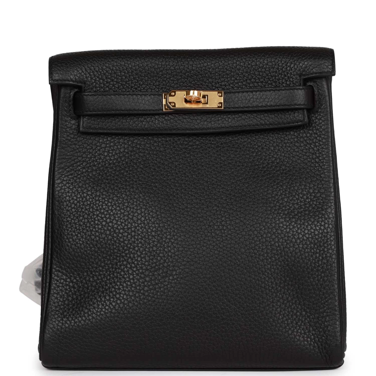 This Kelly Ado Backpack is in Black clemence leather with gold hardware and has tonal stitching, two straps with front toggle closure, and two adjustable shoulder straps.