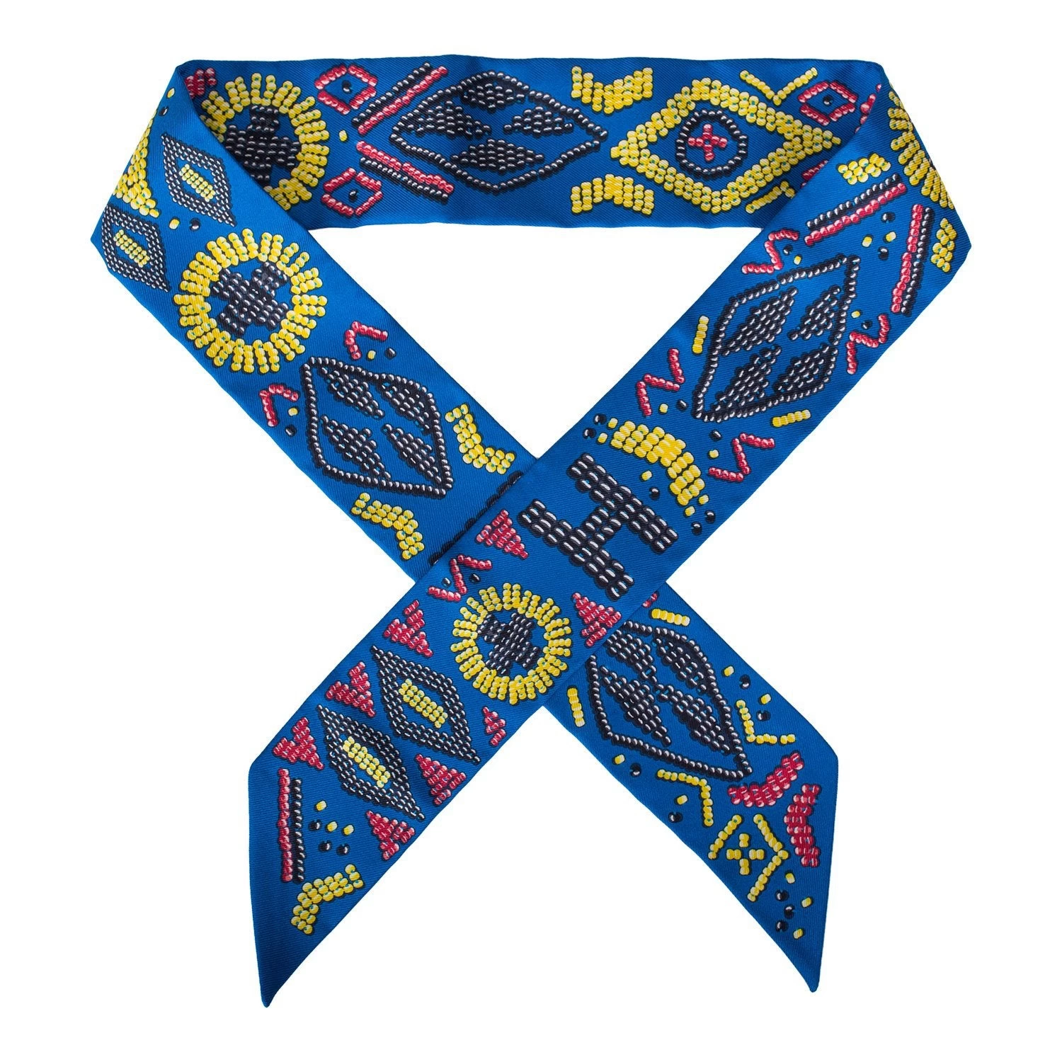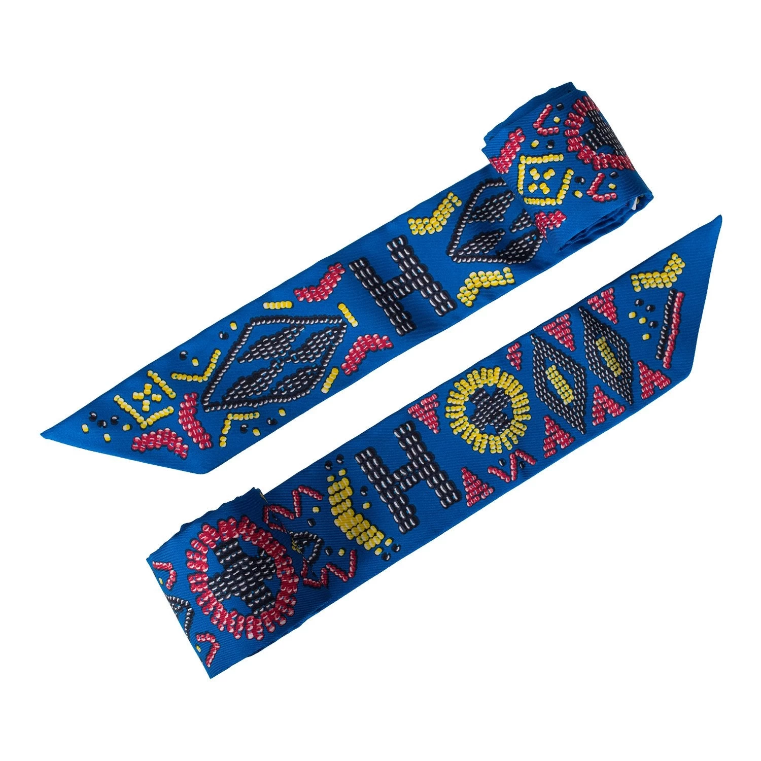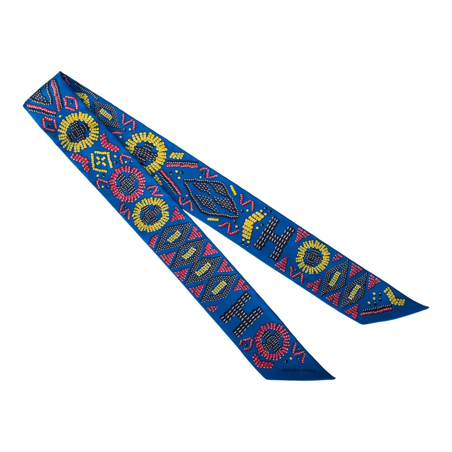 Hermes “Kelly en Perles” silk twilly pair in a bleu royal colorway with jaune and framboise secondary colors.