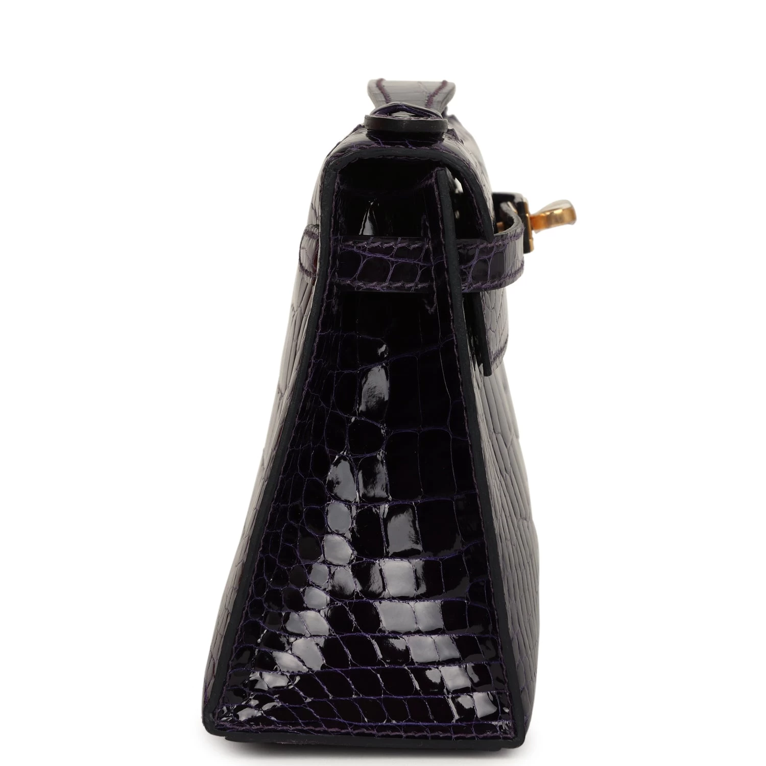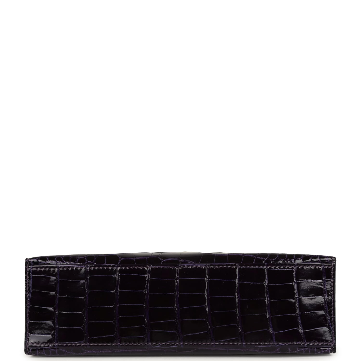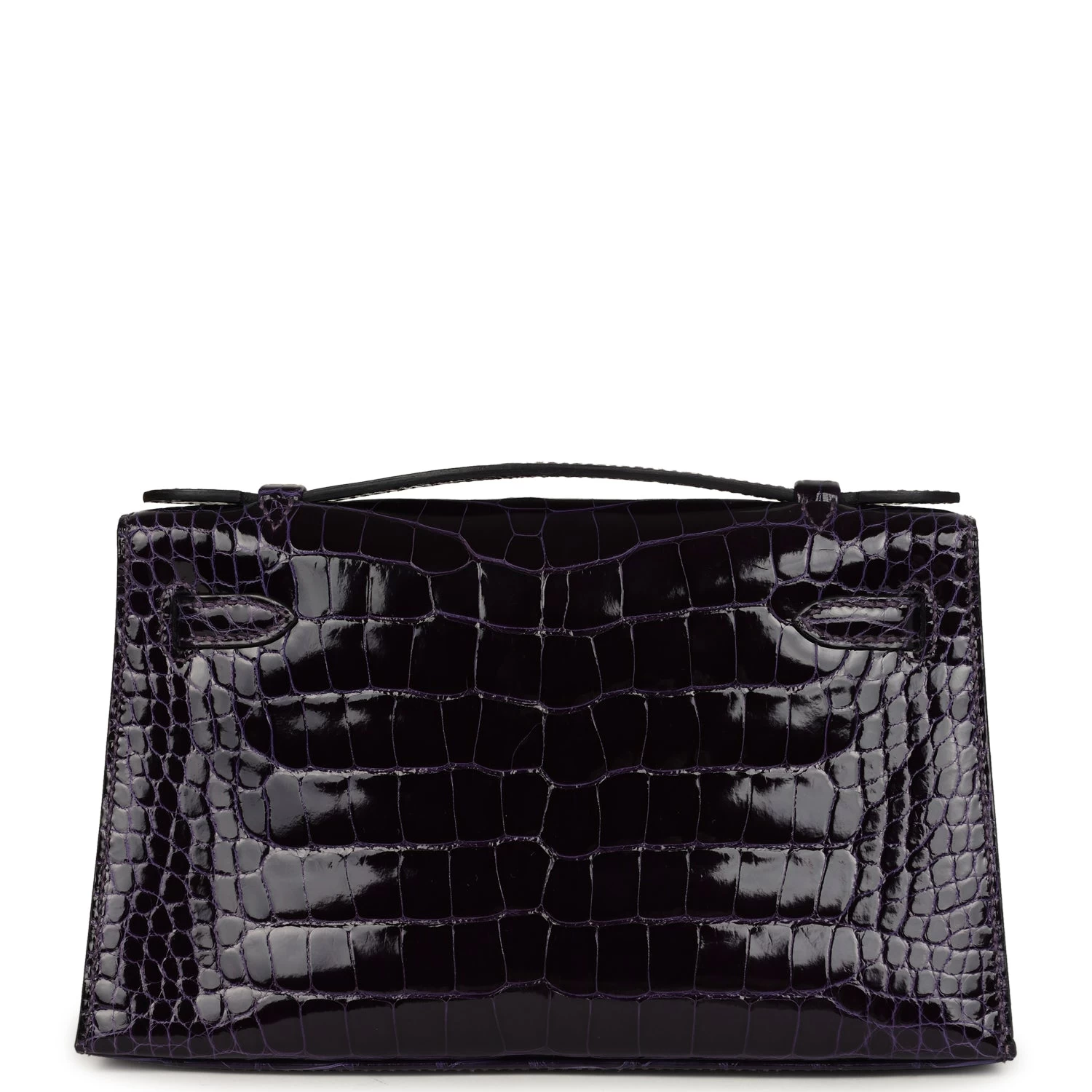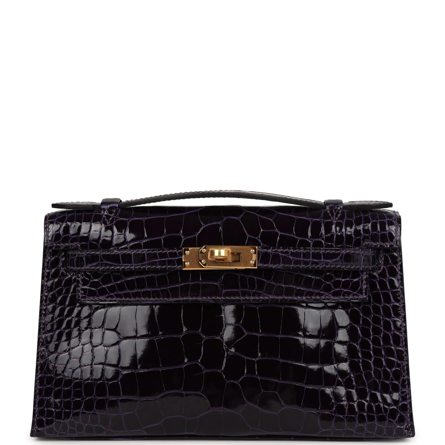This Kelly Pochette is in Amethyst Shiny Alligator Mississippiensis with gold hardware, tonal stitching, front flap with two straps, toggle closure and single flat handle.