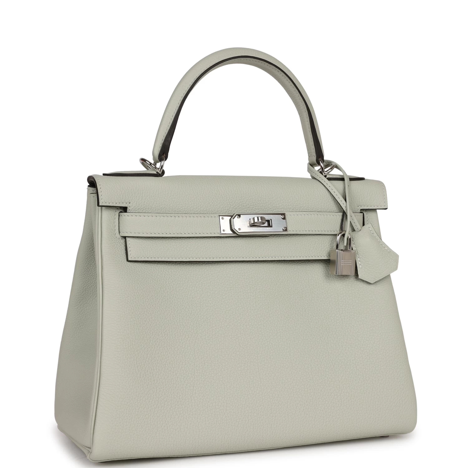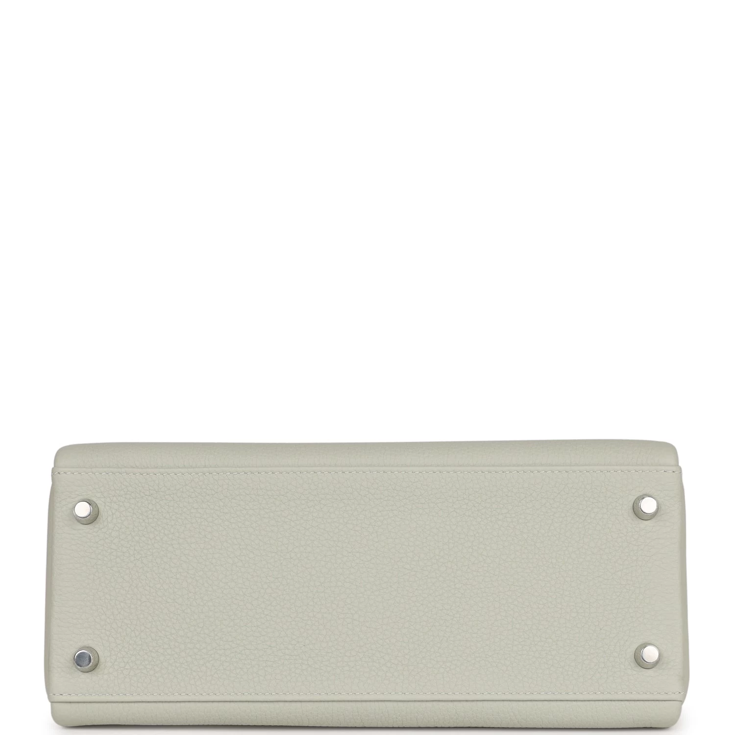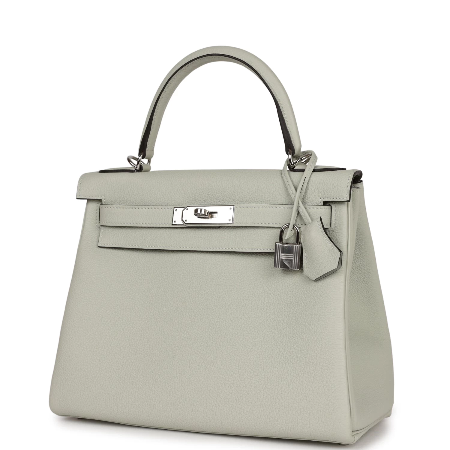 This Kelly, in the Retourne style, is in Gris Neve togo leather with palladium hardware and has tonal stitching, front flap, two straps with center toggle closure, clochette with lock and two keys, single rolled handle and removable shoulder strap.