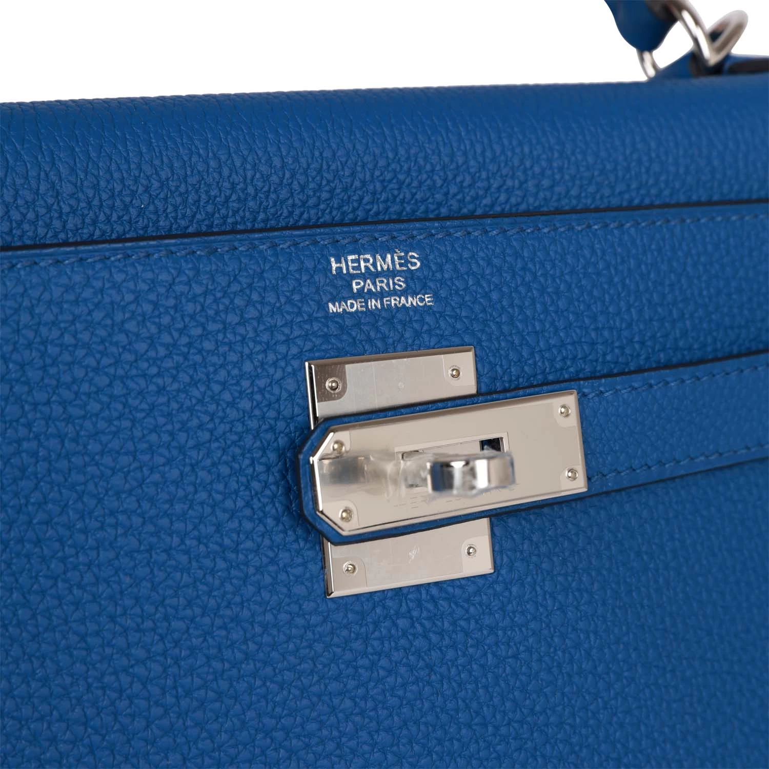 This Kelly, in the Retourne style, is in Bleu France togo leather with palladium hardware and has tonal stitching, two straps with front toggle closure, clochette with lock and two keys, single rolled handle and removable shoulder strap.