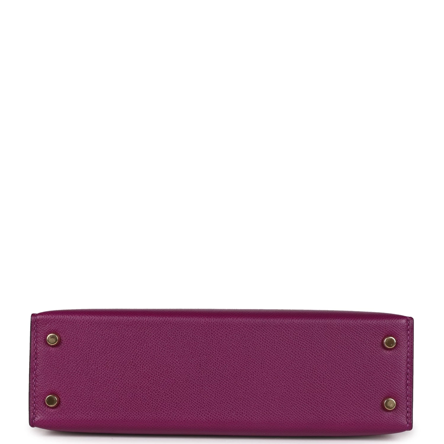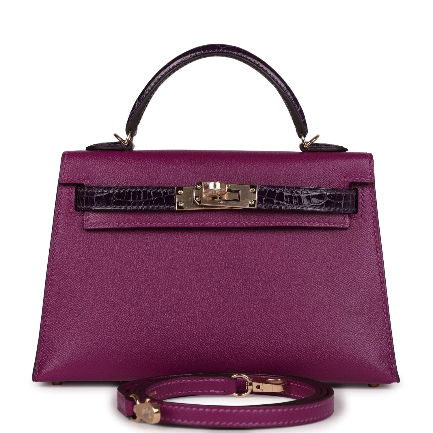 This Kelly, in the Sellier style, is in Anemone and Amethyst Madame leather and Shiny Alligator with permabrass hardware and has tonal stitching, two front straps with front toggle closure, single rolled handle and removable shoulder strap.