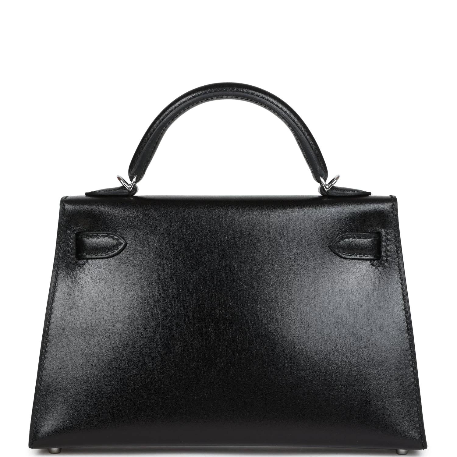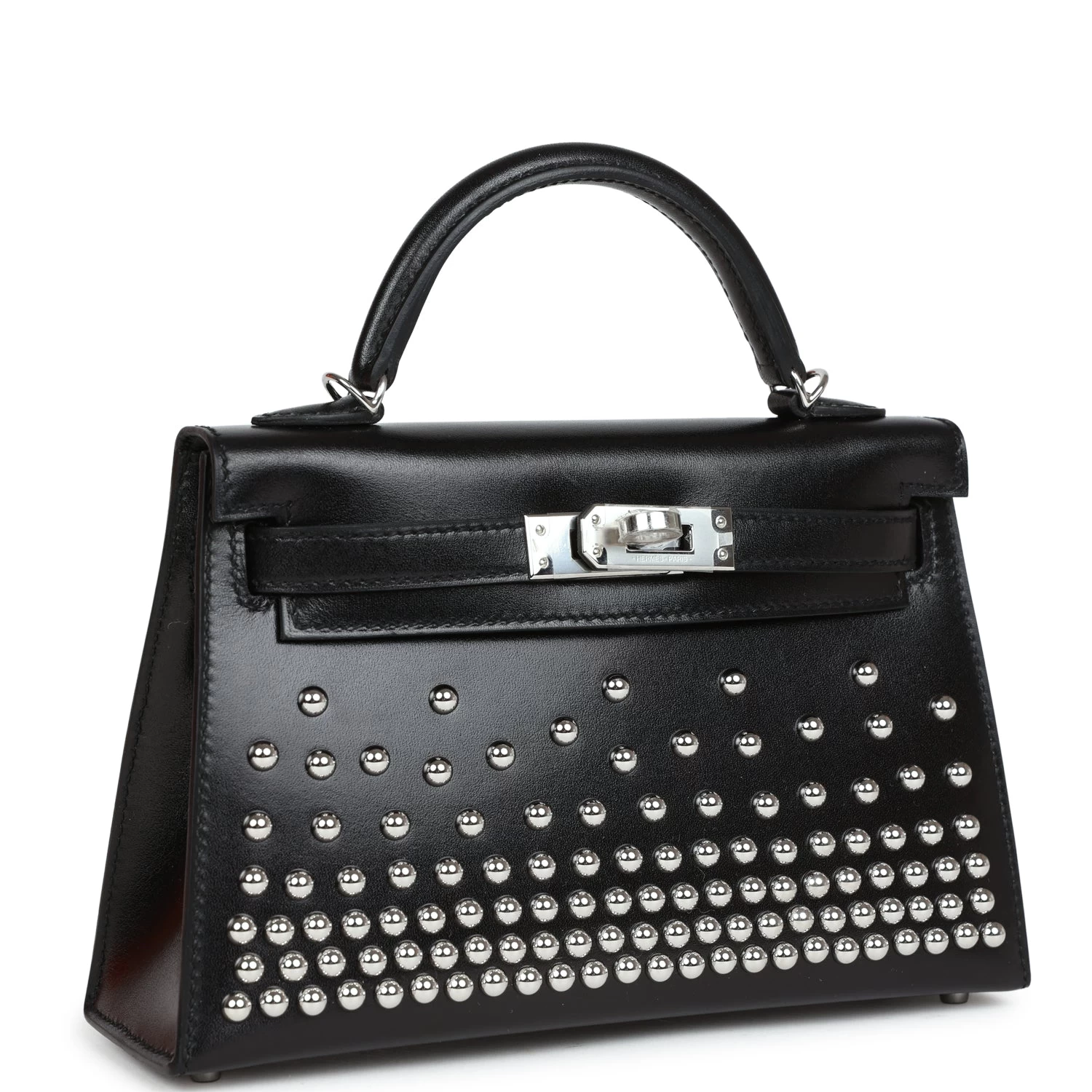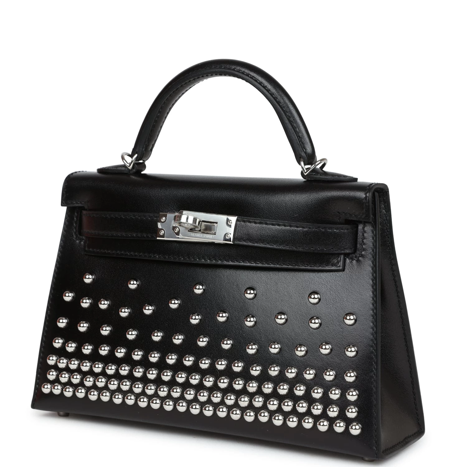This tiny Kelly, in the Sellier style, is in black box leather with palladium hardware and has palladium rounds studs, tonal stitching, two front straps with front toggle closure, single rolled handle and removable shoulder strap.