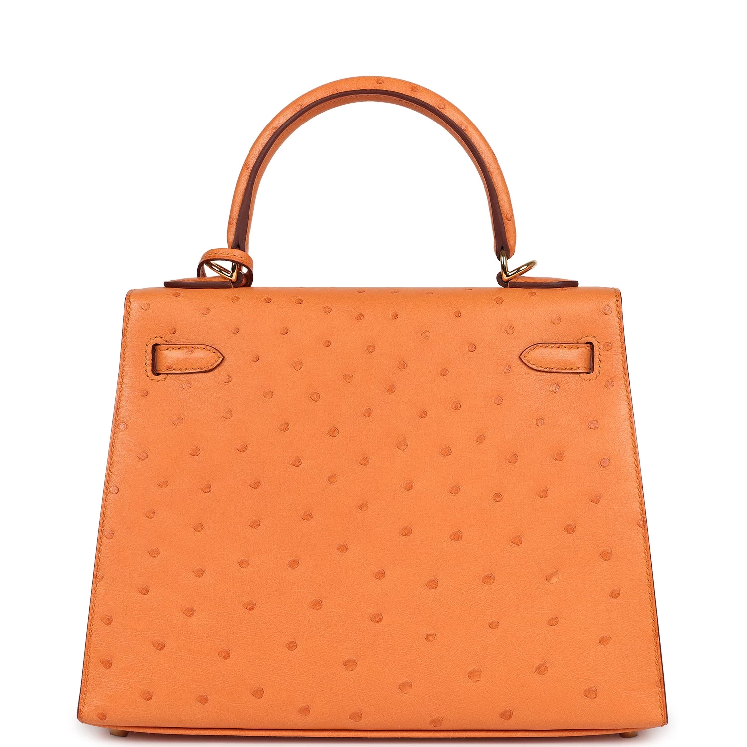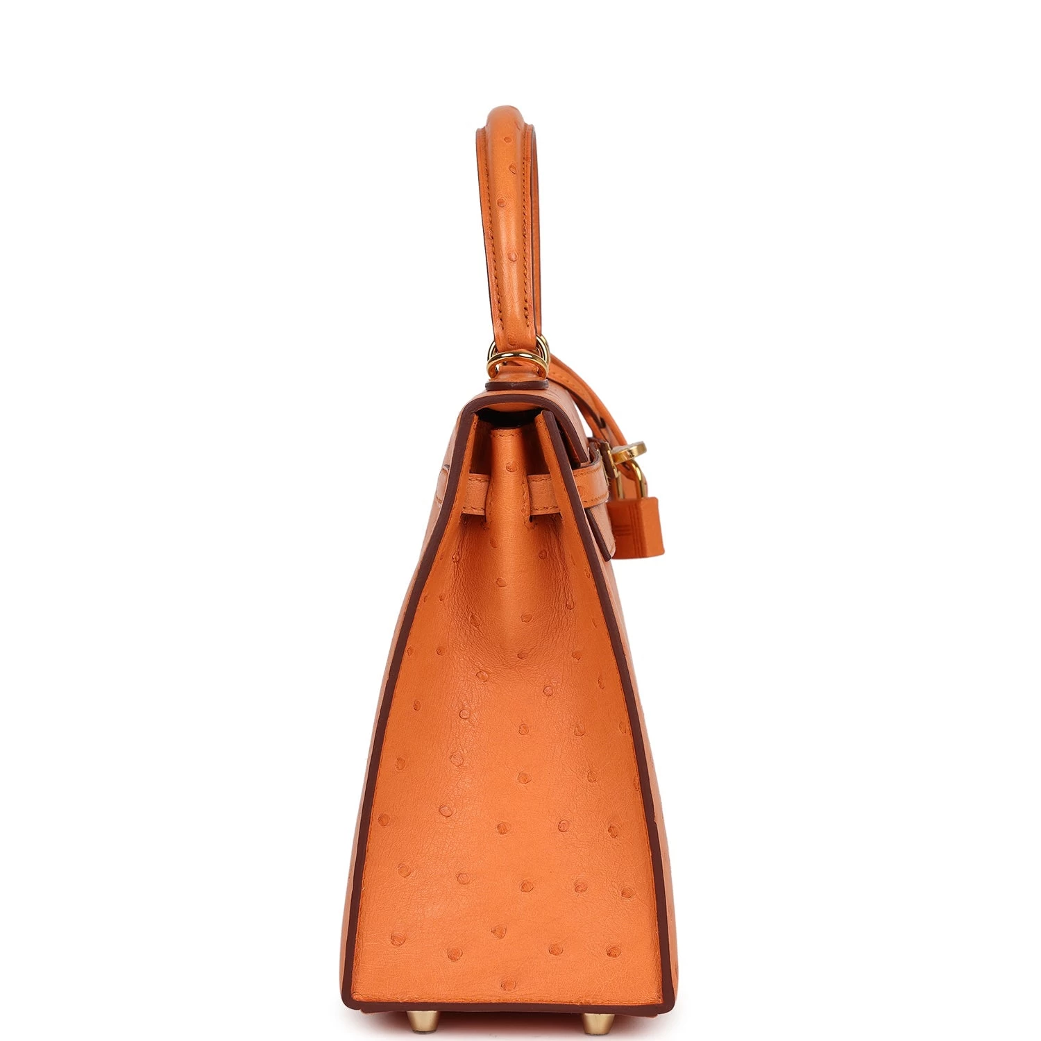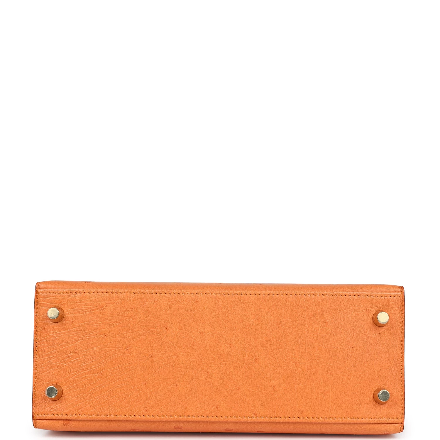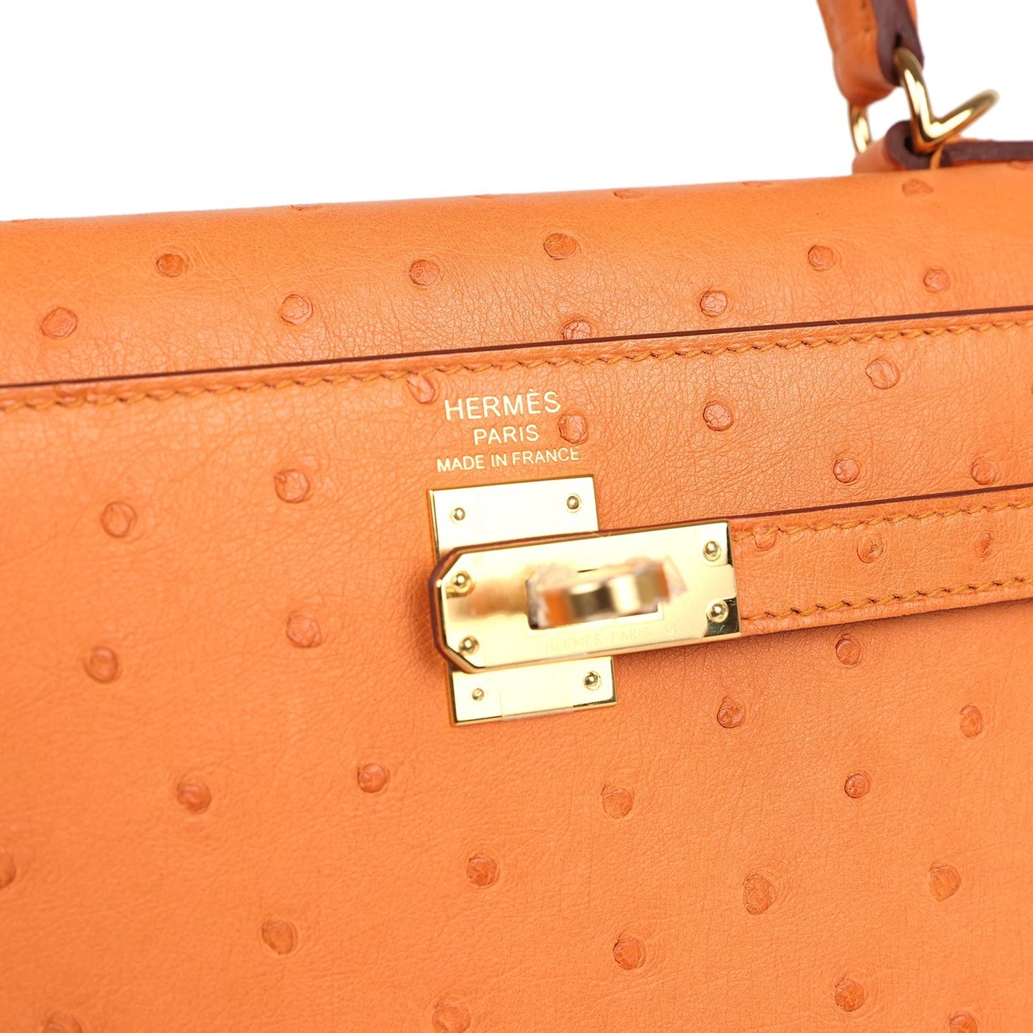 This Kelly, in the Sellier style, is in Abricot ostrich leather with gold tone hardware and has tonal stitching, two straps with front toggle closure, clochette with lock and two keys, single rolled handle and removable shoulder strap.