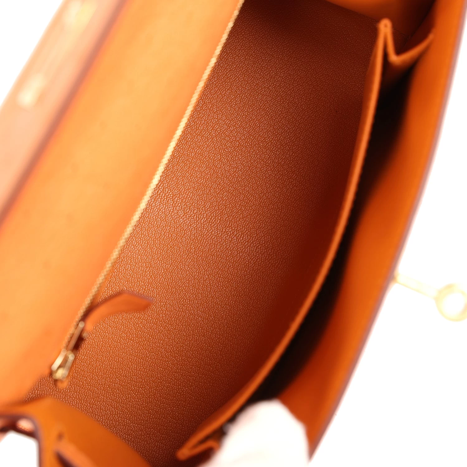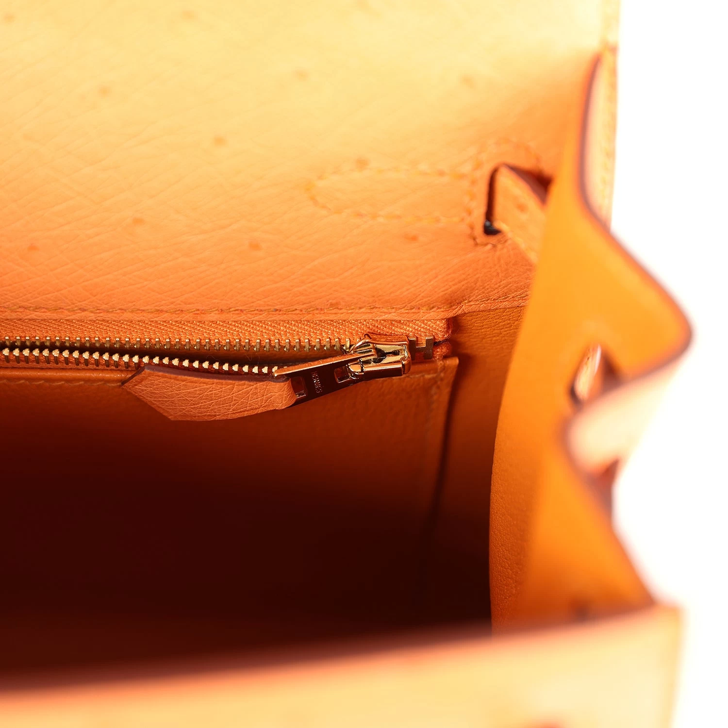 The interior is lined with Abricot chevre and has a zipper pocket with an Hermes engraved pull and one pocket on the opposite side.