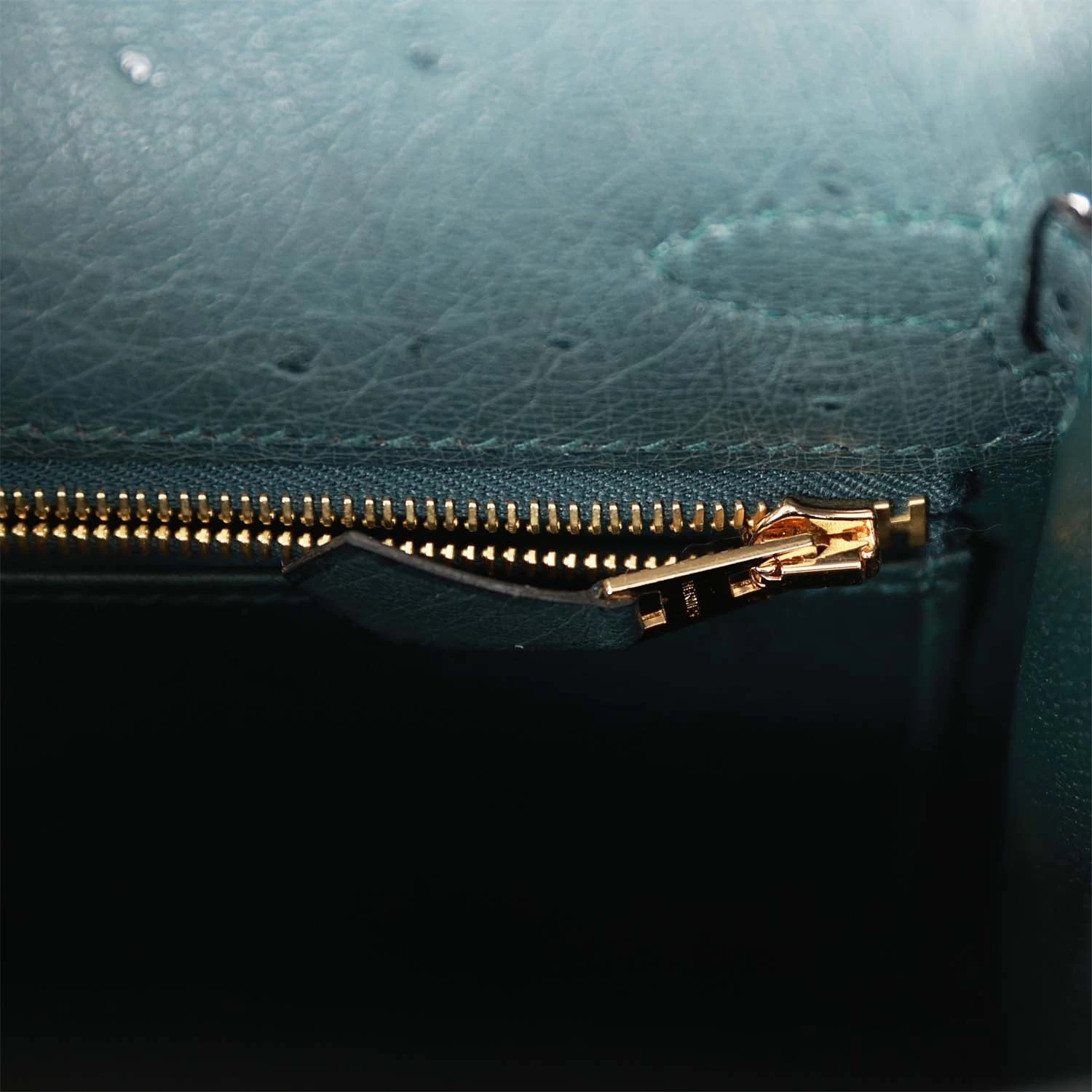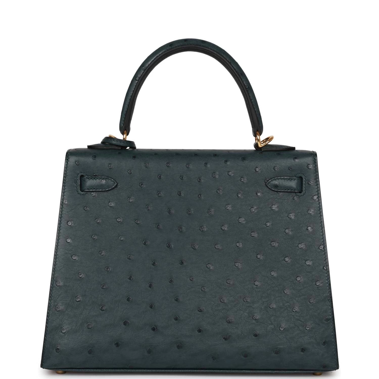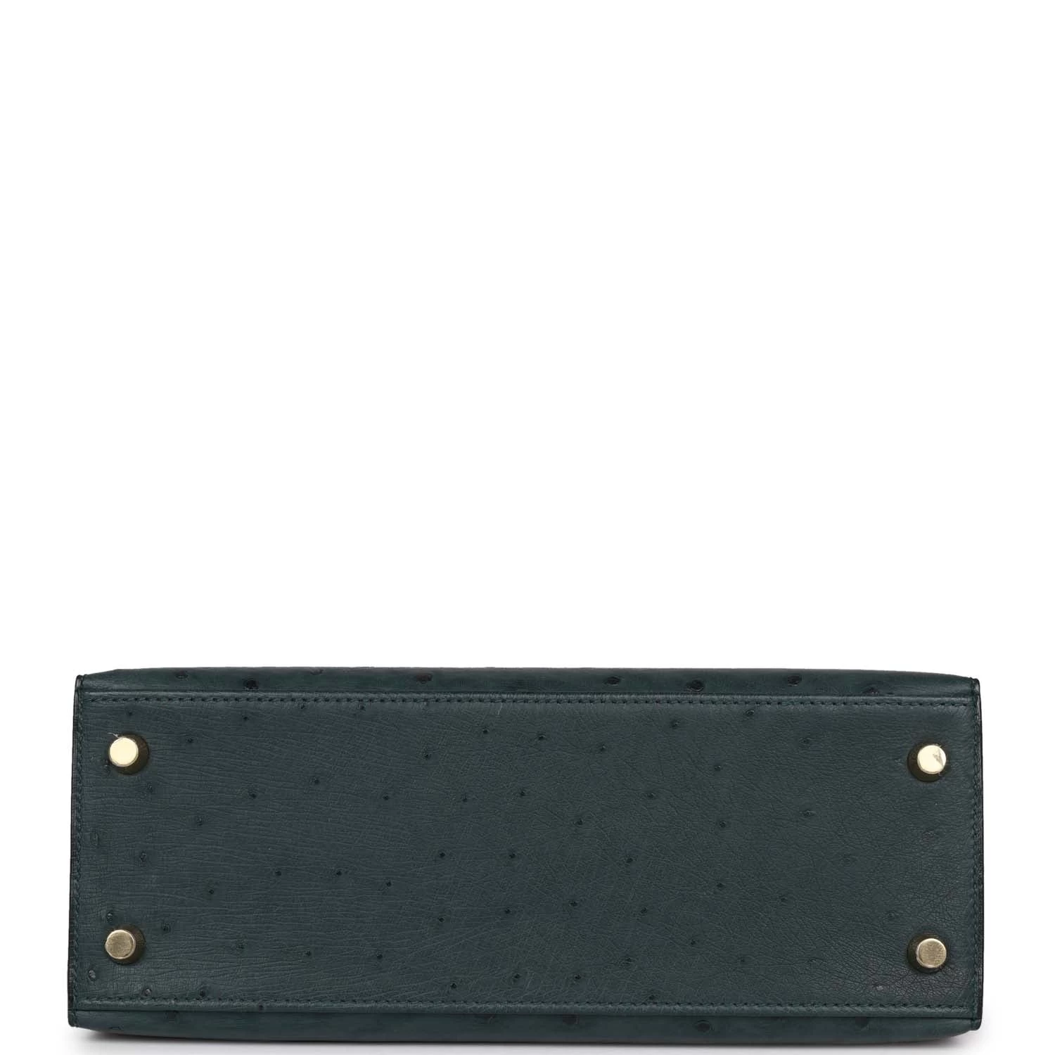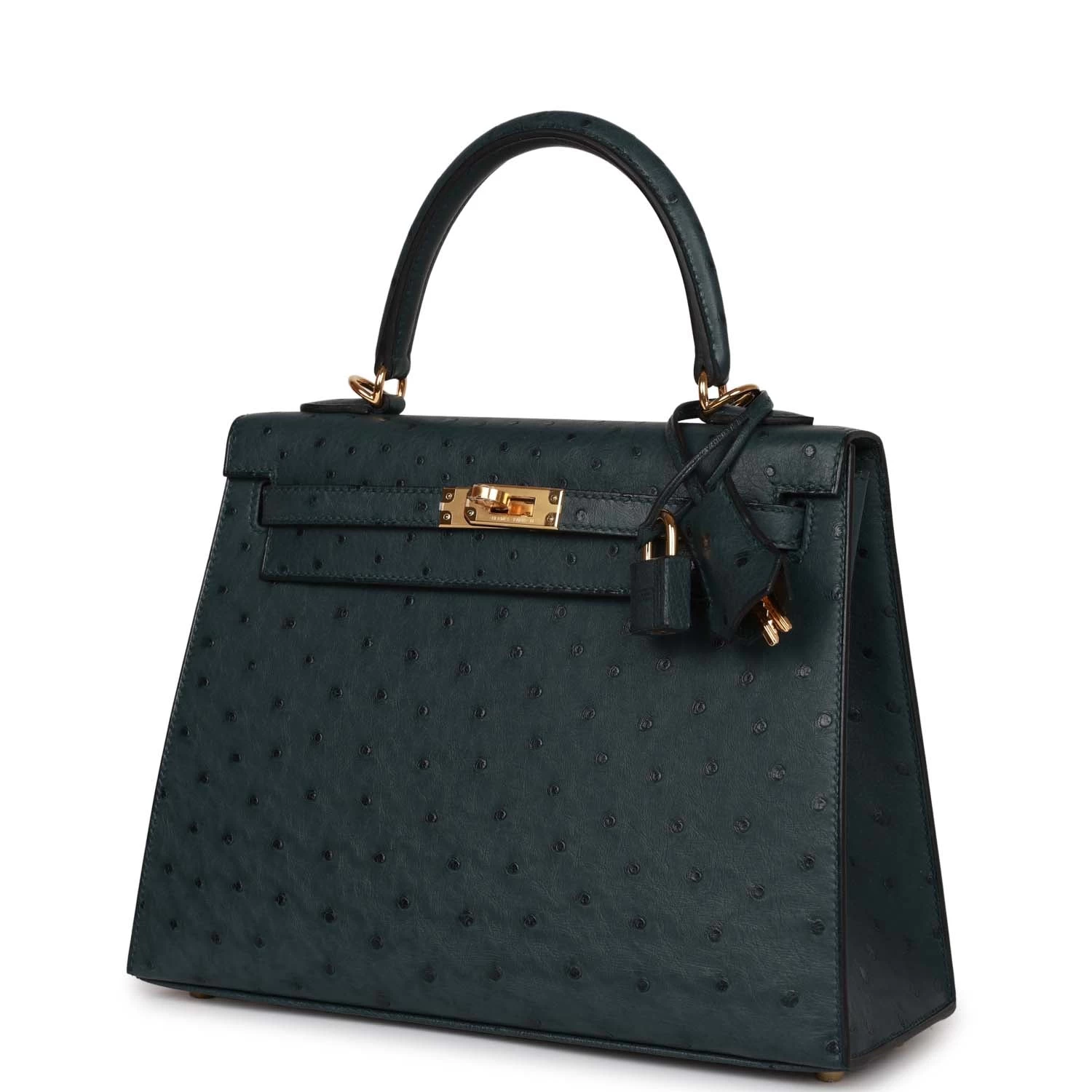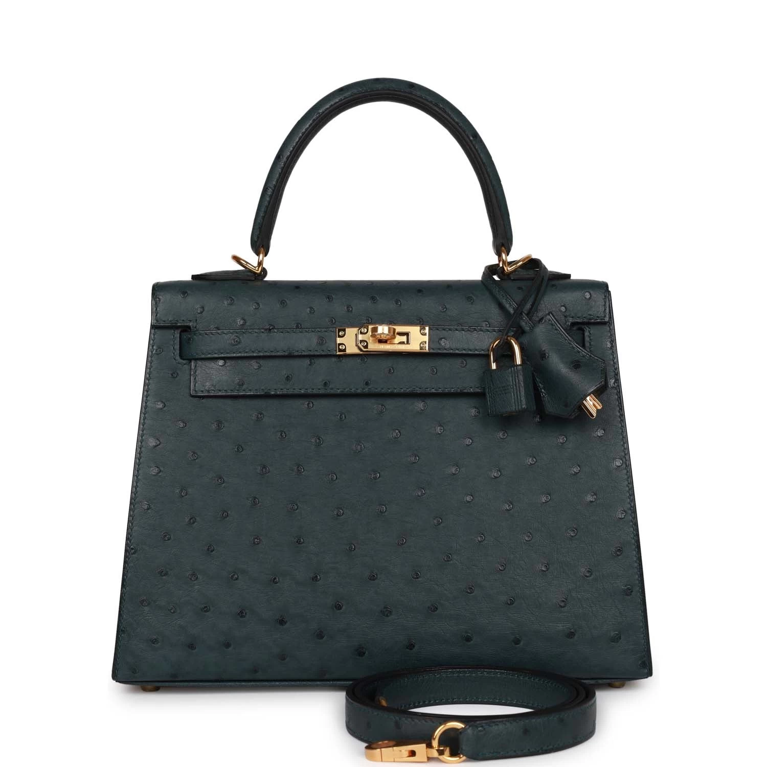 This Kelly, in the Sellier style, is in Vert Cypress ostrich with gold hardware and has tonal stitching, two straps with front toggle closure, clochette with lock and two keys, single rolled handle and removable shoulder strap.