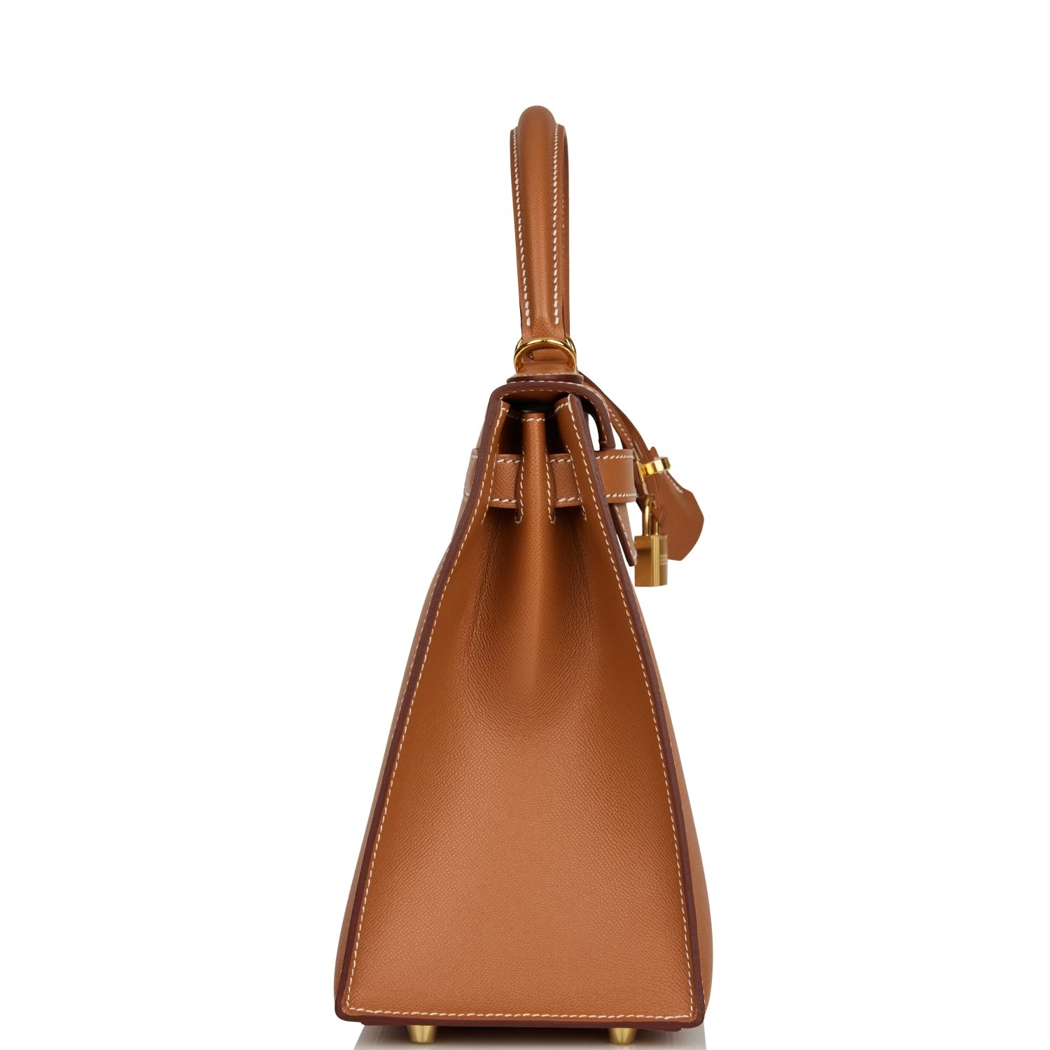 This Kelly, in the Sellier style, is in gold madame leather with gold hardware and has contrast stitching, front flap, two straps with center toggle closure, clochette with lock and two keys a single rolled handle and removable shoulder strap.