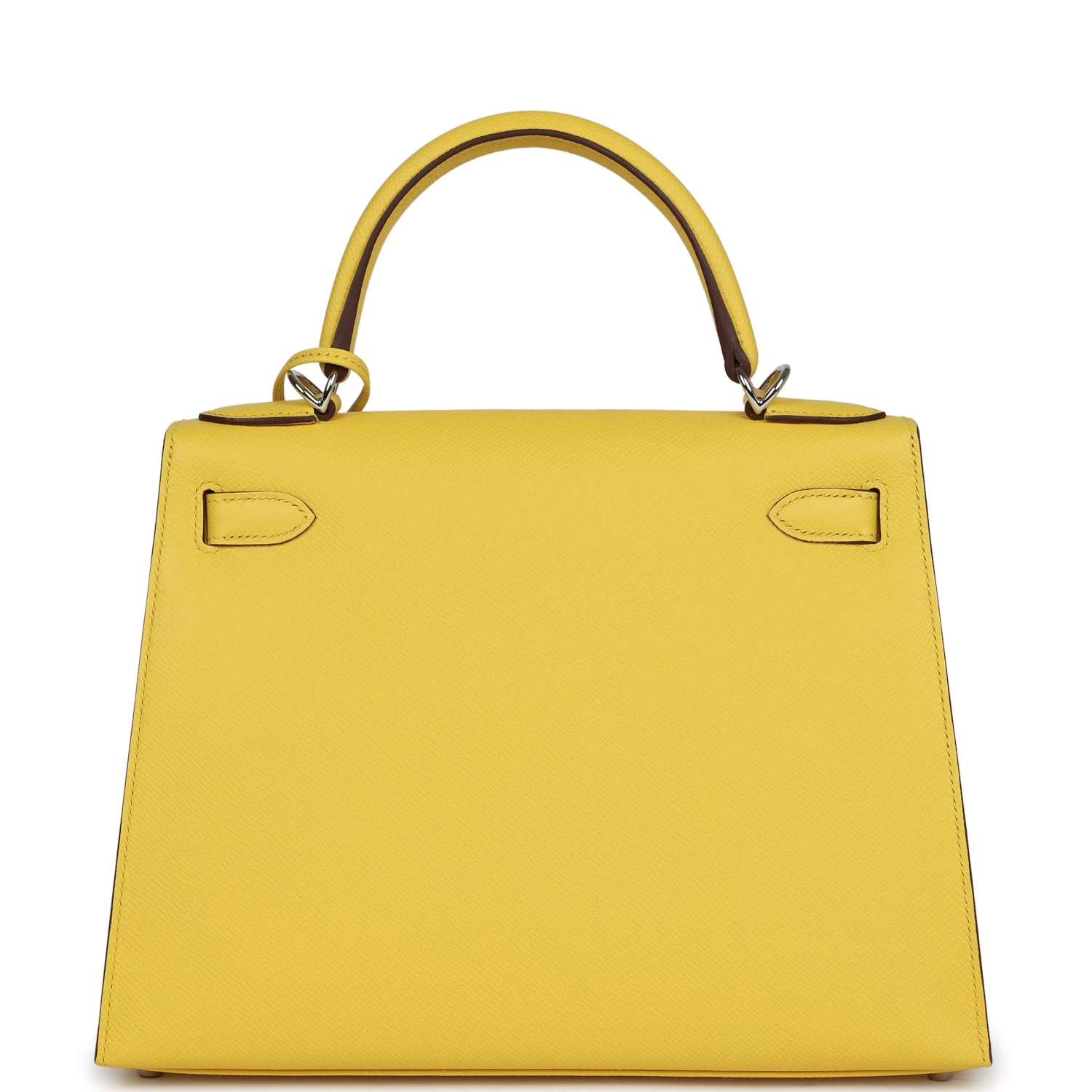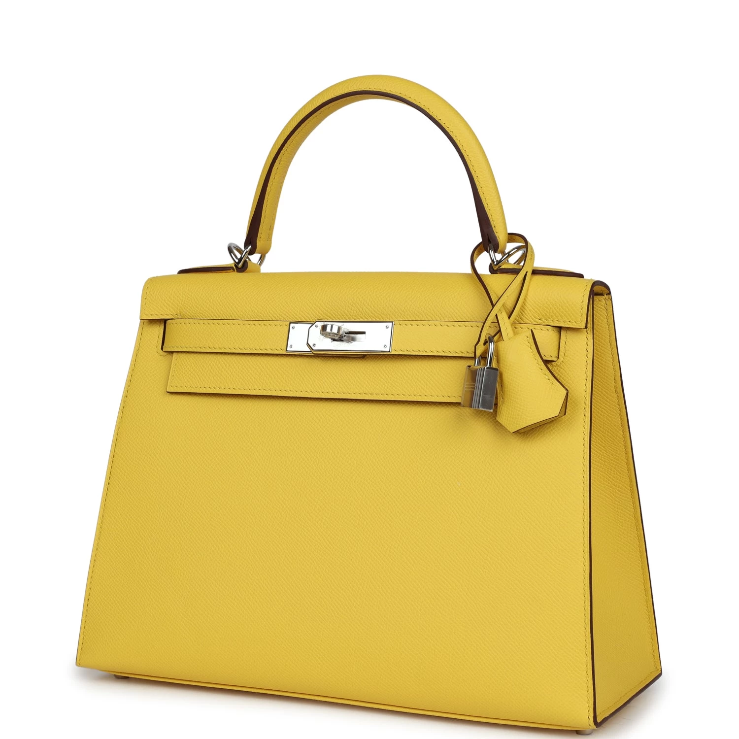 This Kelly Sellier is of Jaune de Naples epsom leather with palladium hardware and has tonal stitching, a front toggle closure, a clochette with lock and two keys, a single rolled handle and an optional shoulder strap.
