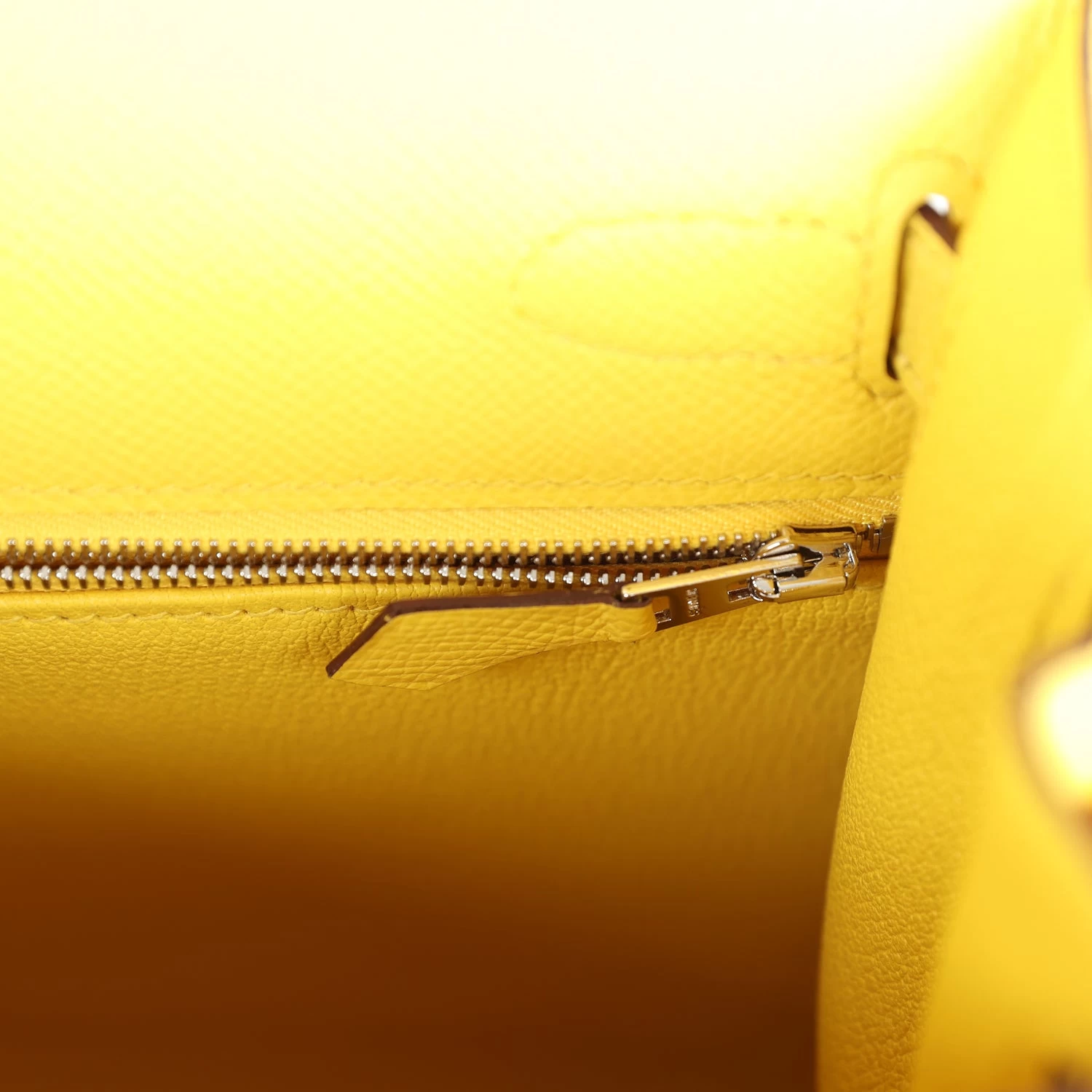 The interior is lined with Jaune de Naples chevre leather and has one zip pocket with an Hermes engraved pull and two open pockets on the opposite side.