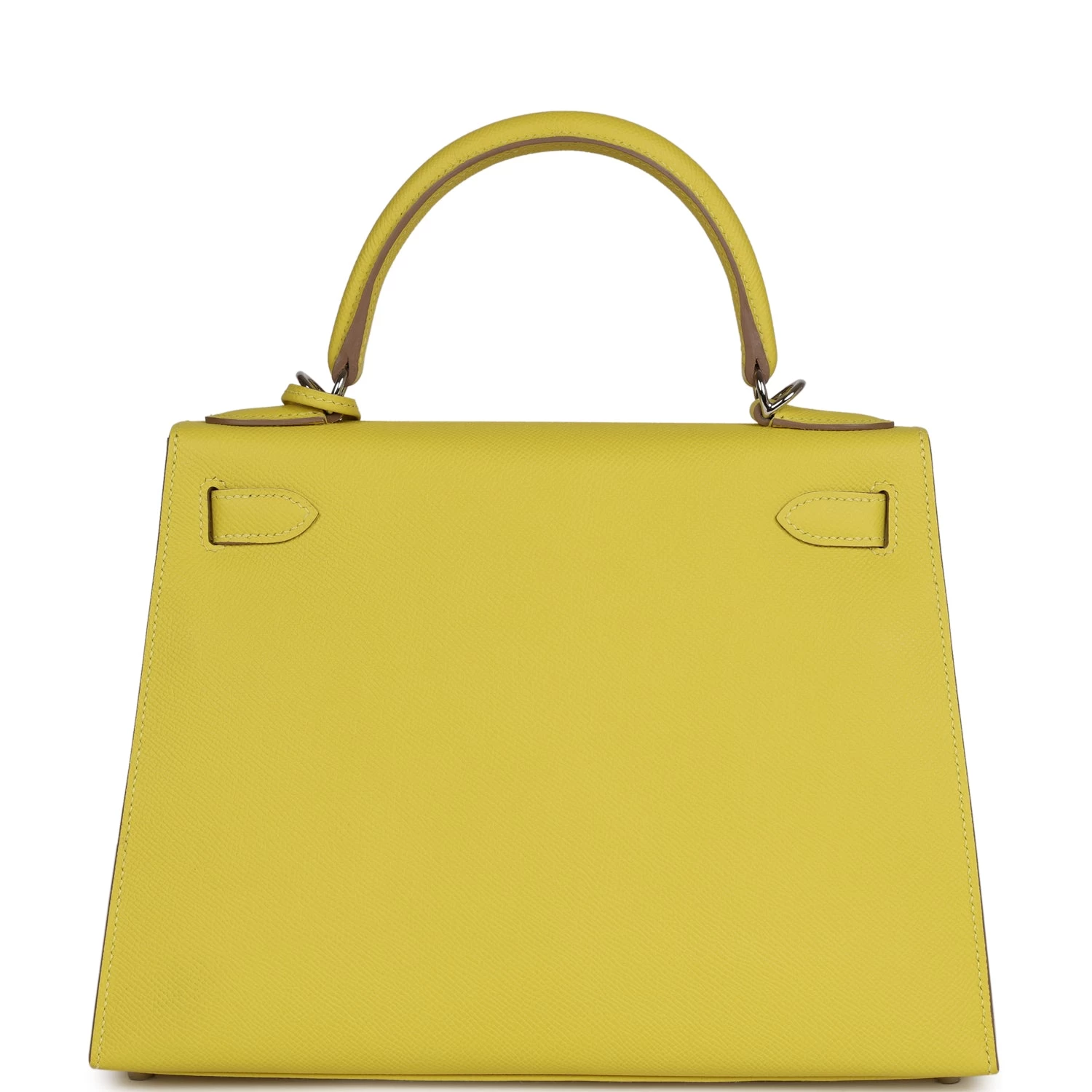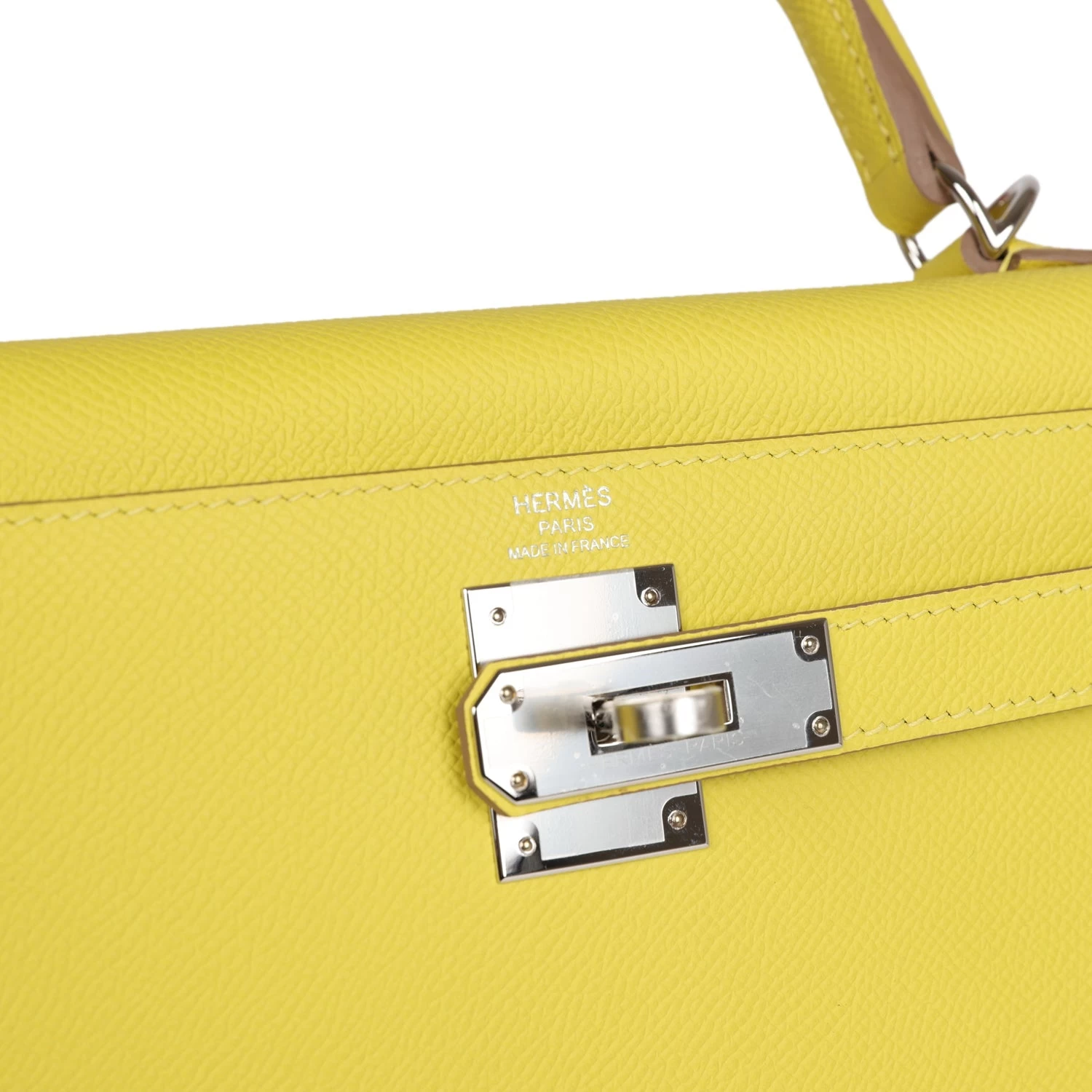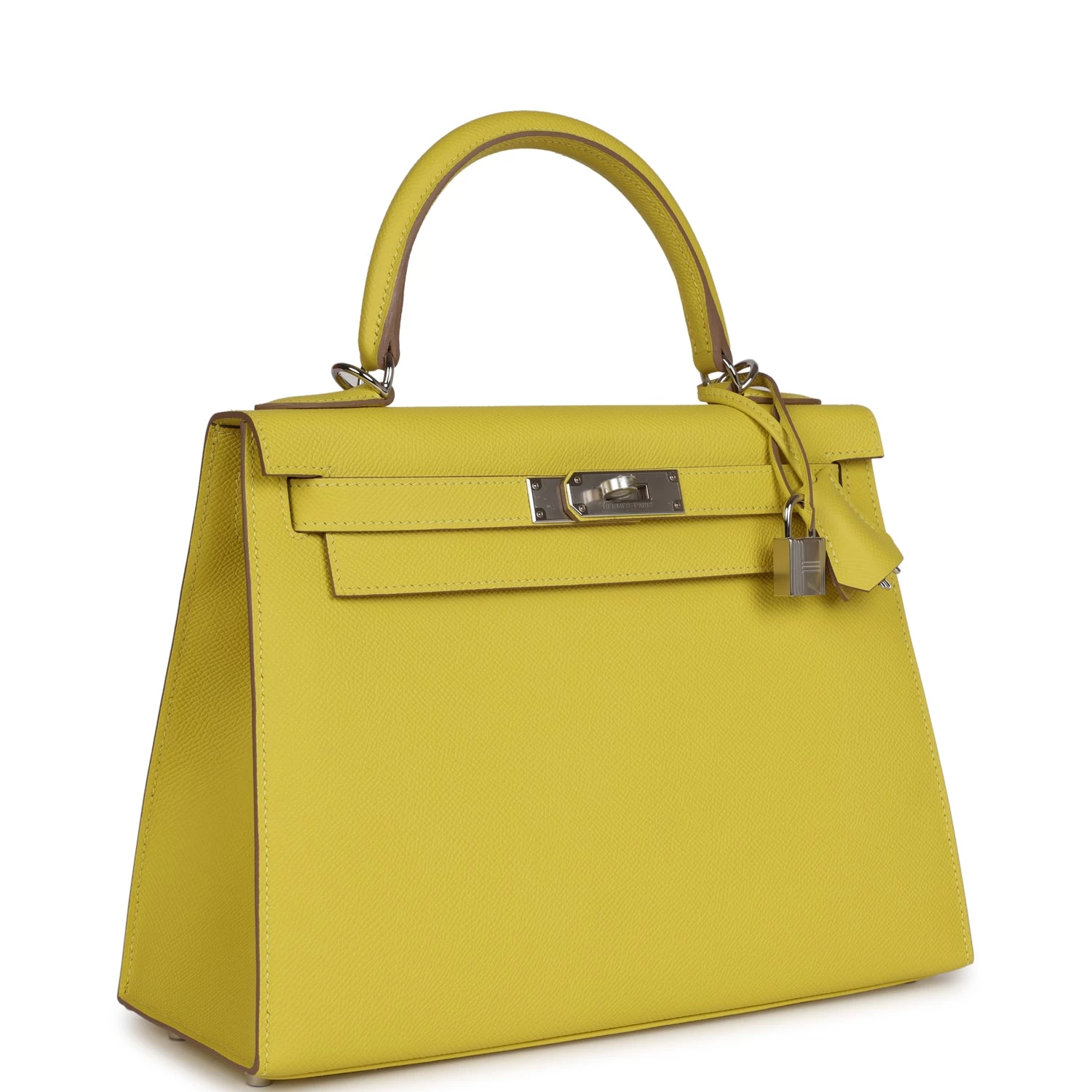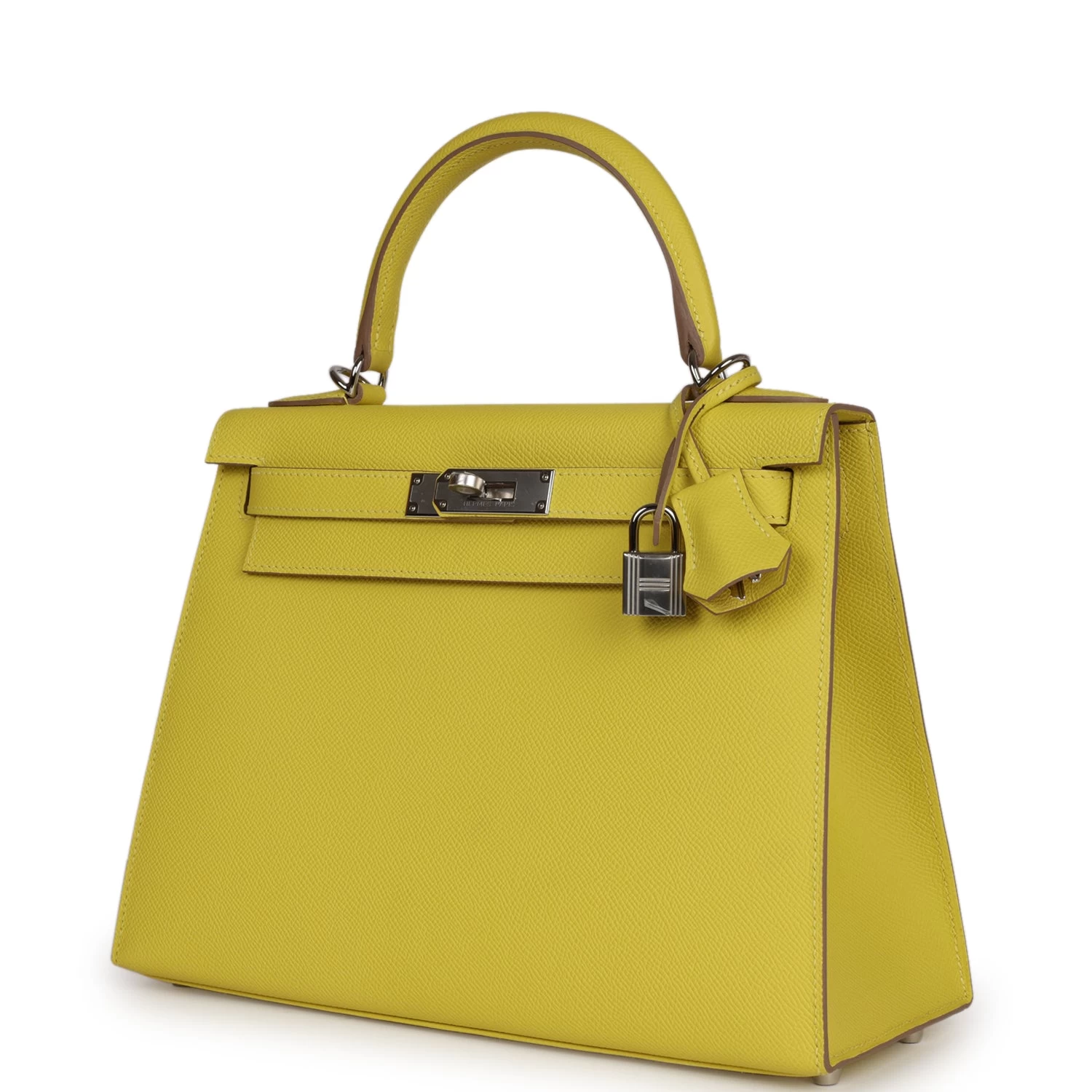 This Kelly Sellier is of Lime epsom leather with palladium hardware and has tonal stitching, a front toggle closure, a clochette with lock and two keys, a single rolled handle and an optional shoulder strap.