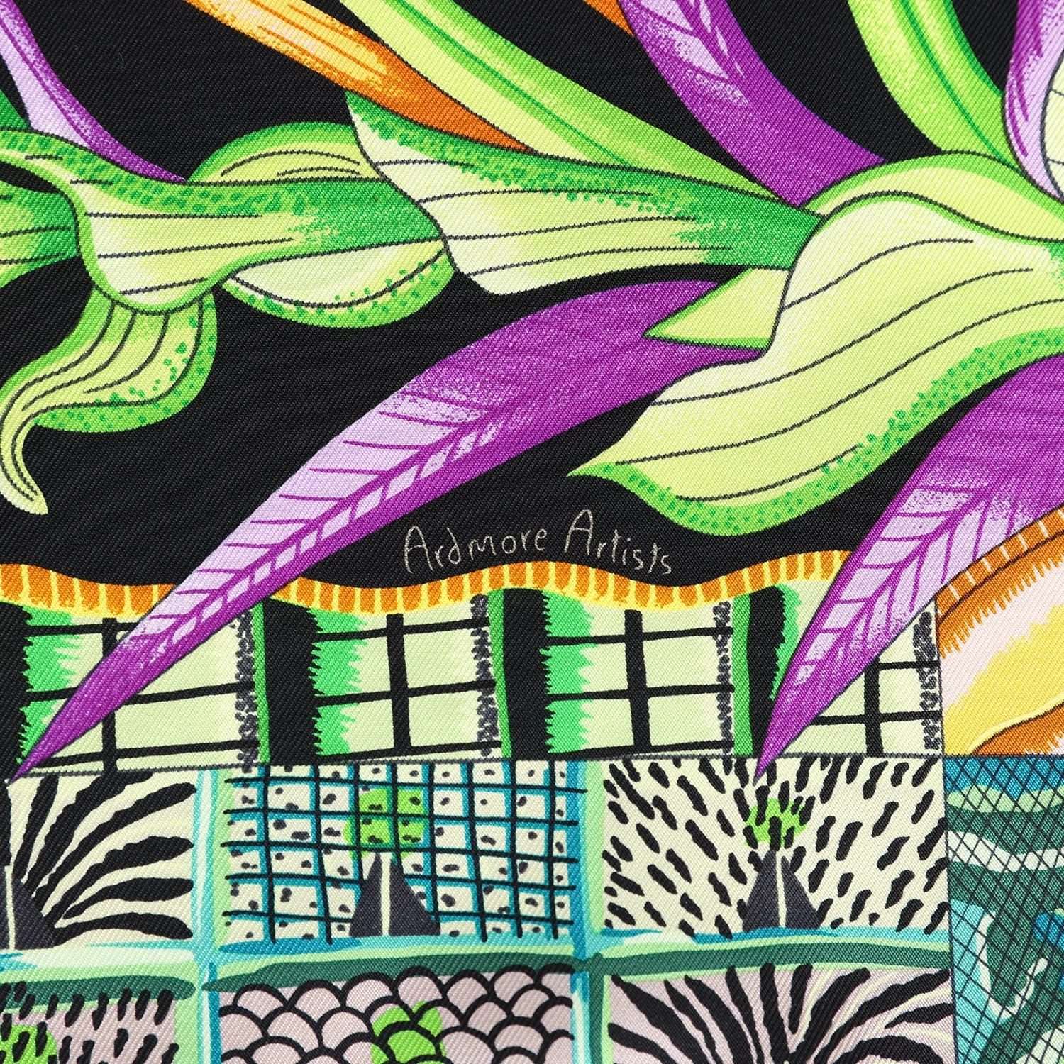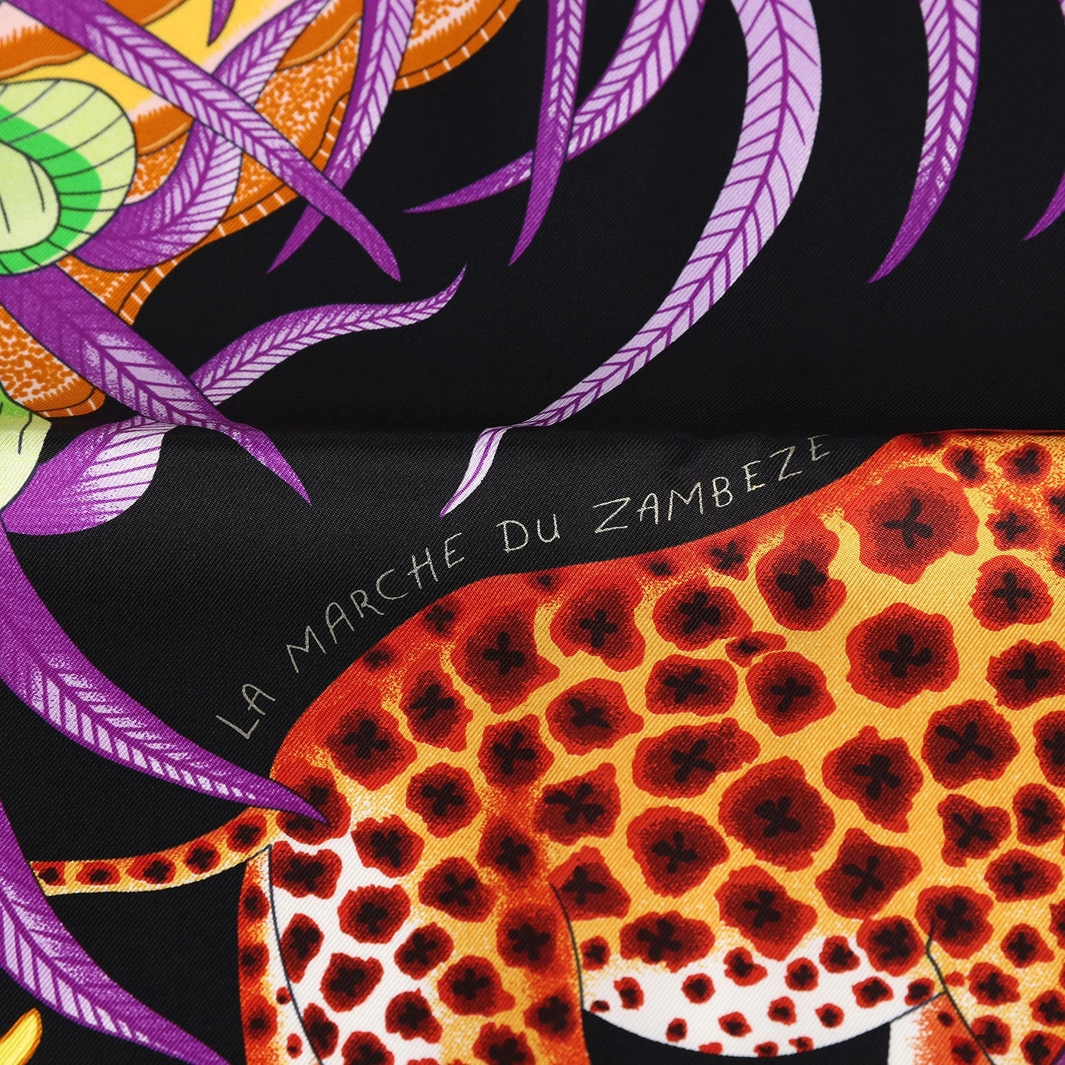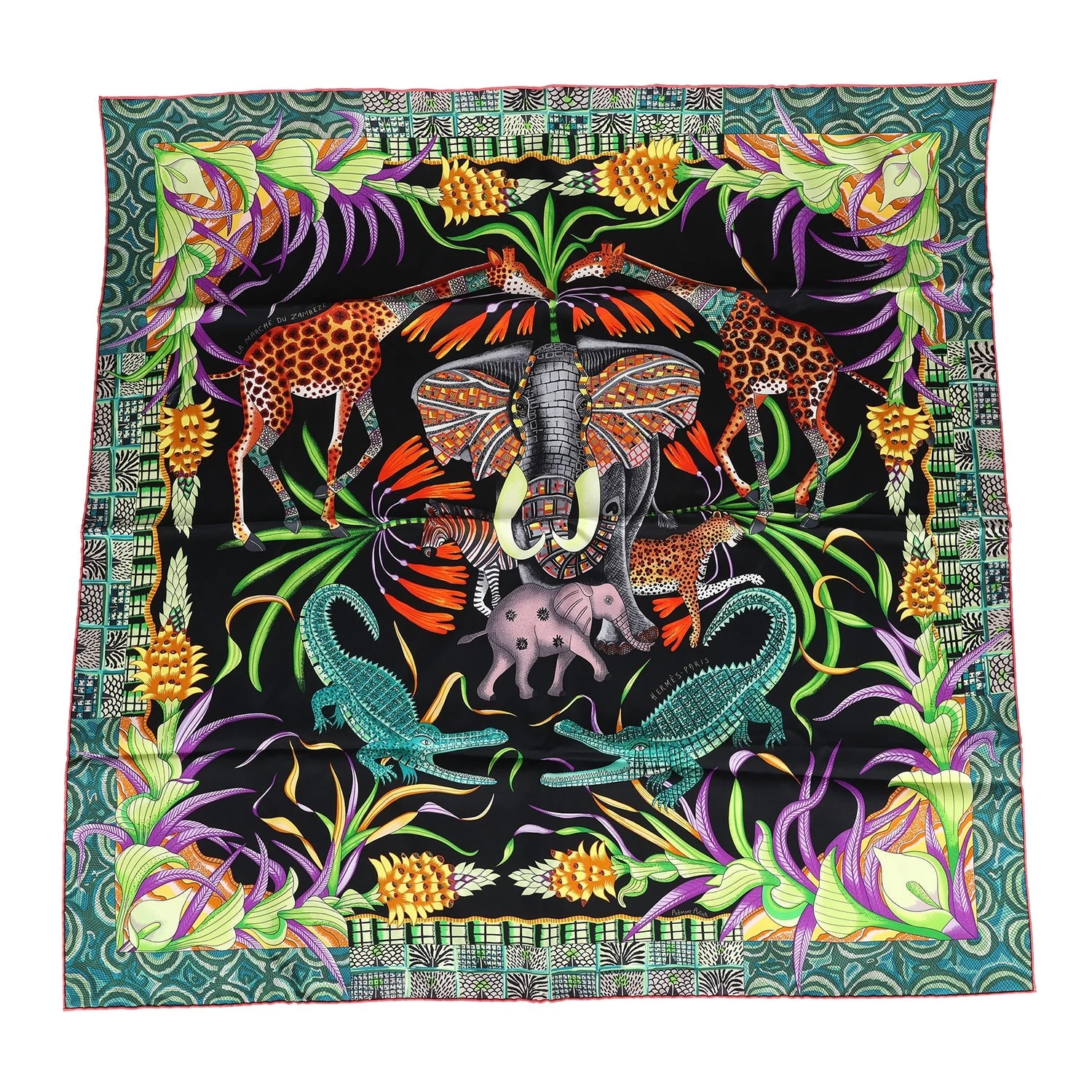 This Hermes “La Marche Du Zambeze” silk scarf is in a black multicolor colorway designed by Ardmore Artists.