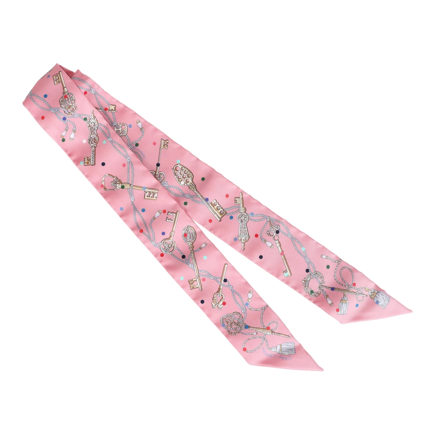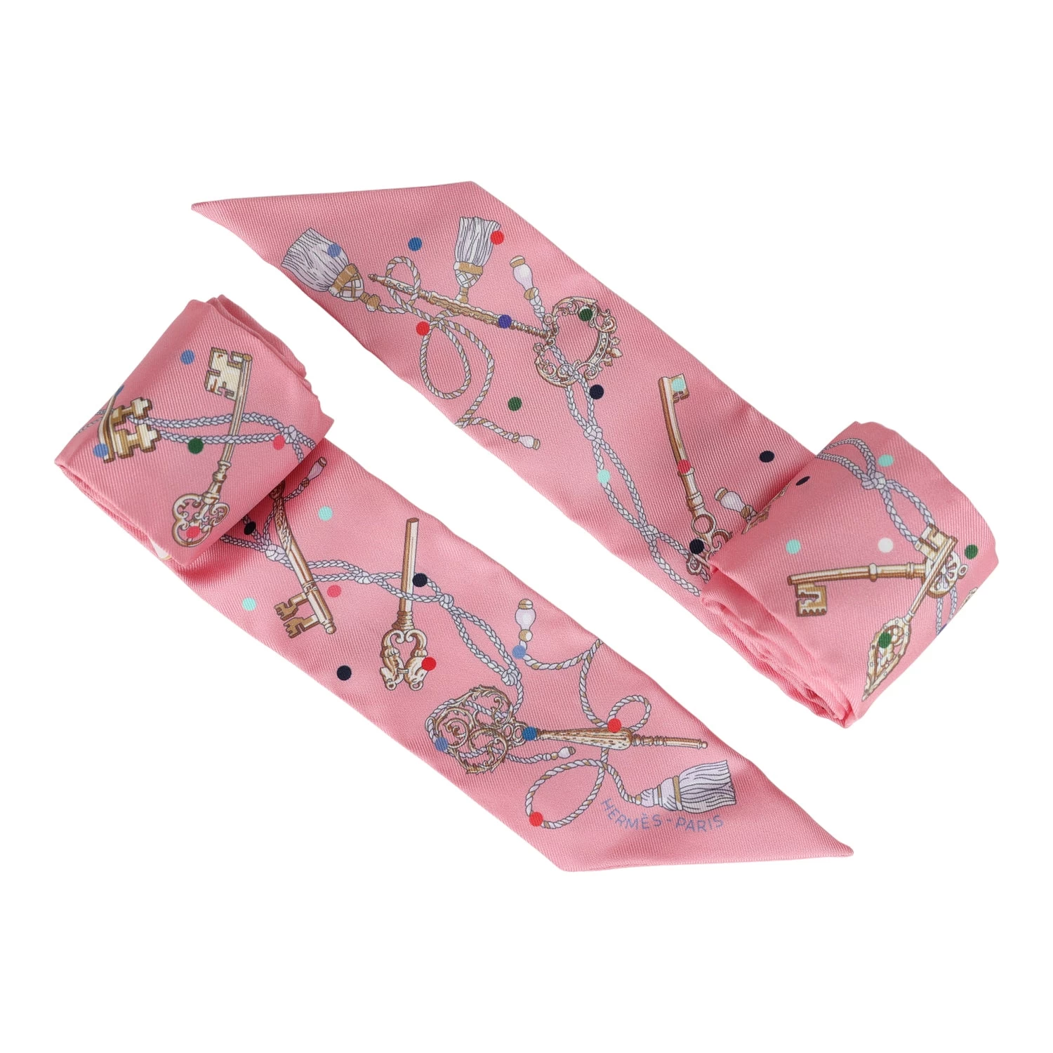 This silk twilly pair is in a Rose and Beige colorway.