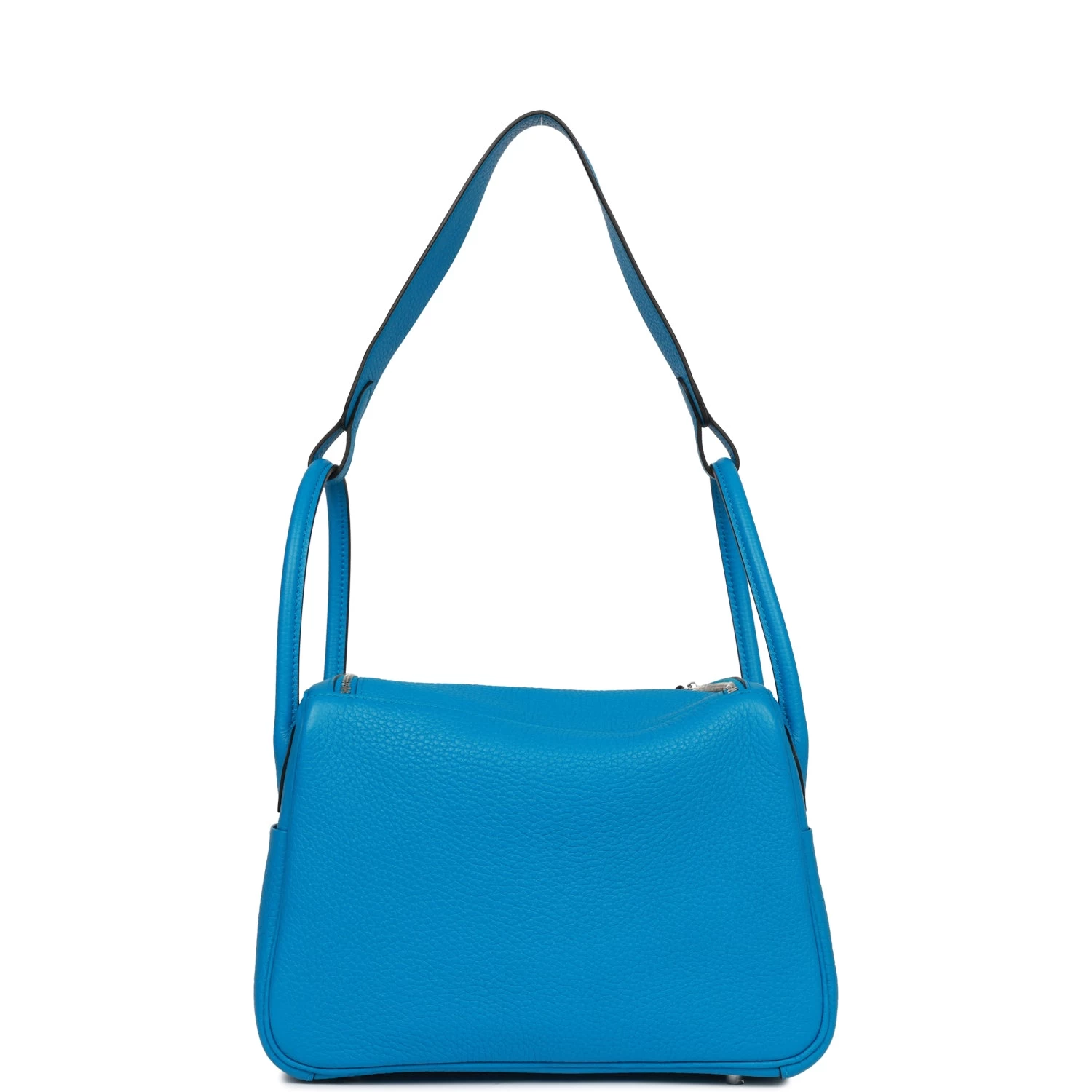 This Lindy is of Bleu Zanzibar clemence with palladium hardware and features tonal stitching, double zipper pulls, center Hermes twist lock closure, five palladium feet, and two top handles that are linked by a removable shoulder strap.