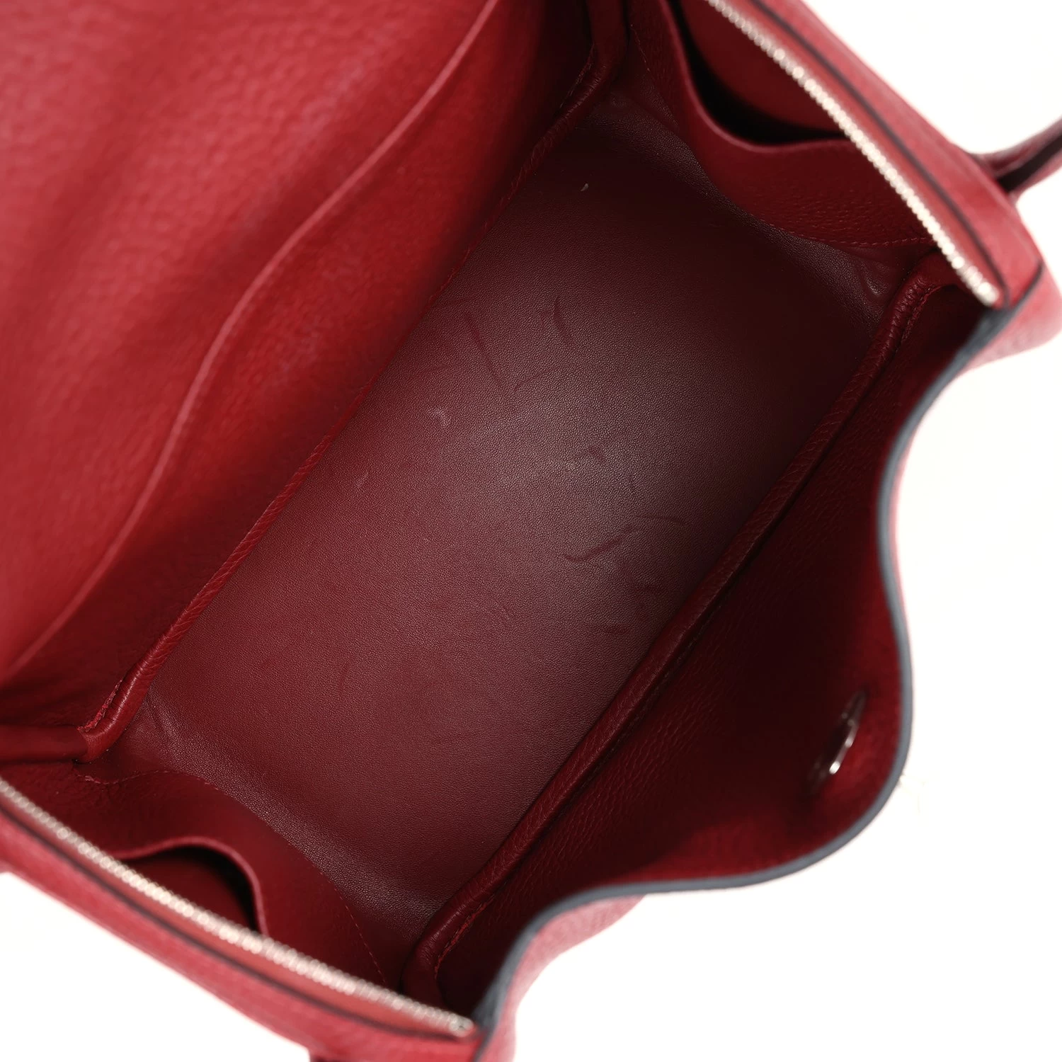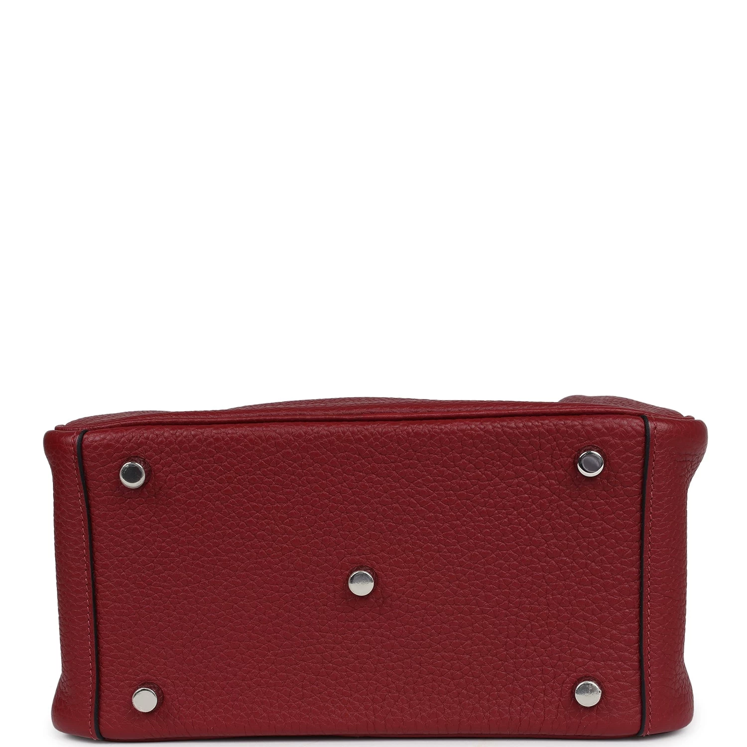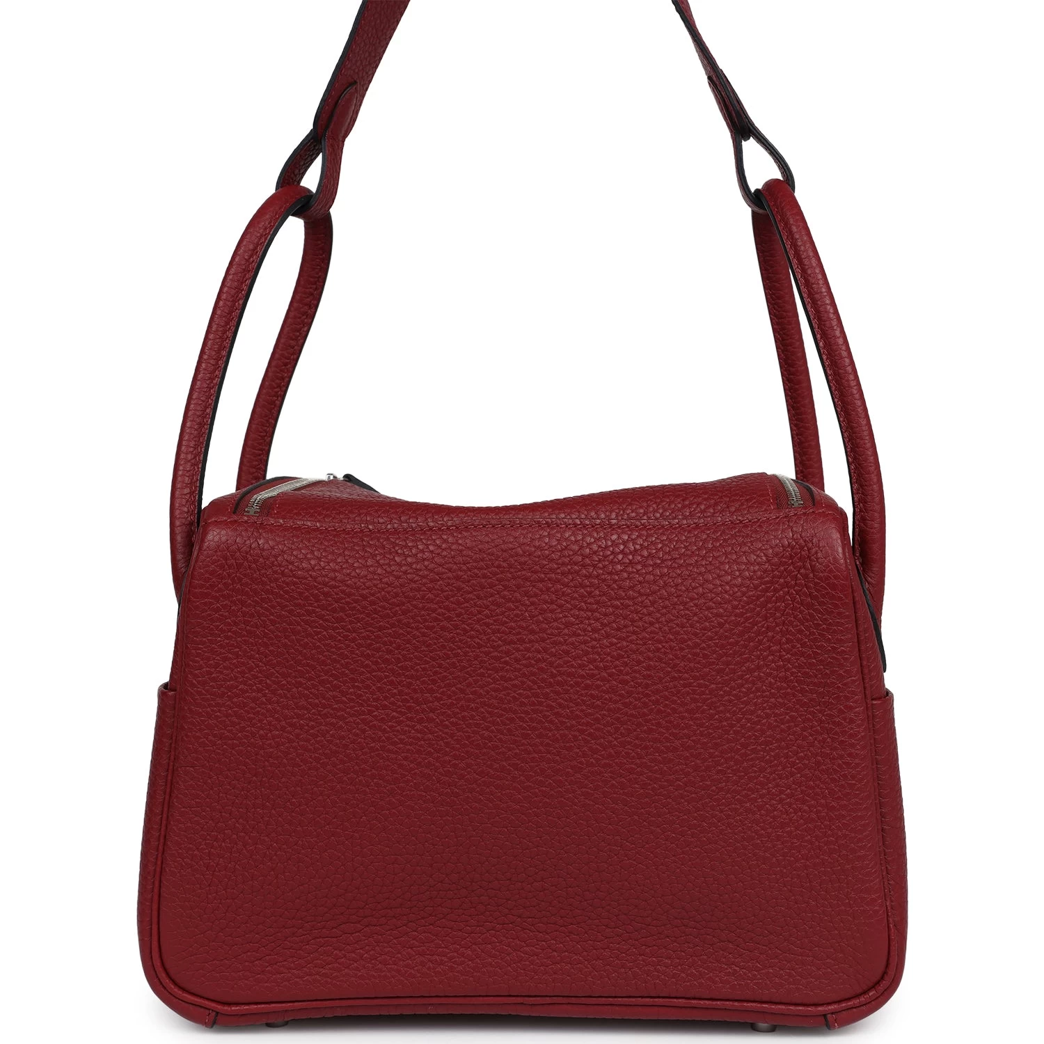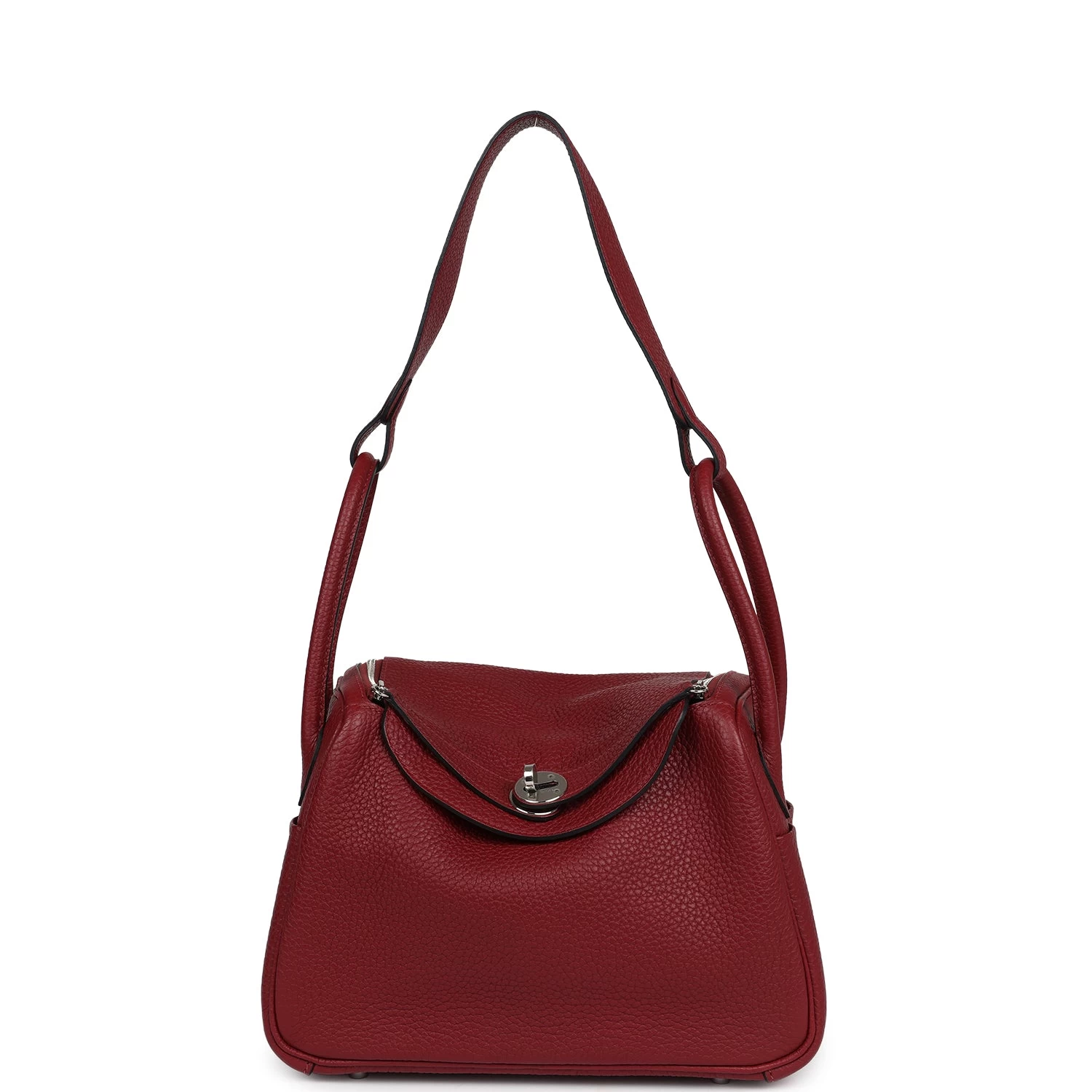 This Lindy is of Rubis clemence with palladium hardware and features tonal stitching, double zipper pulls, center Hermes twist lock closure, five gold feet, and two top handles that are linked by a removable shoulder strap.