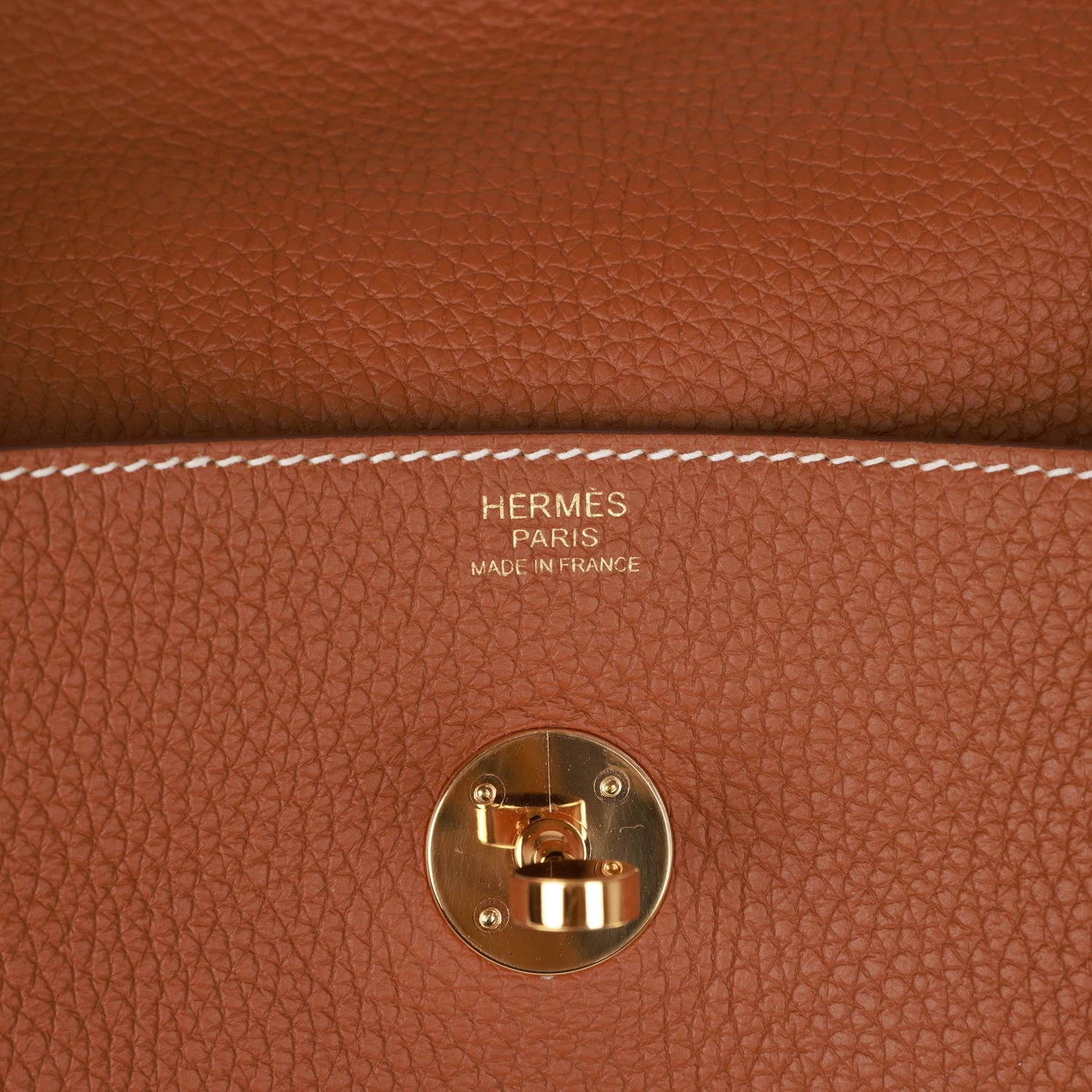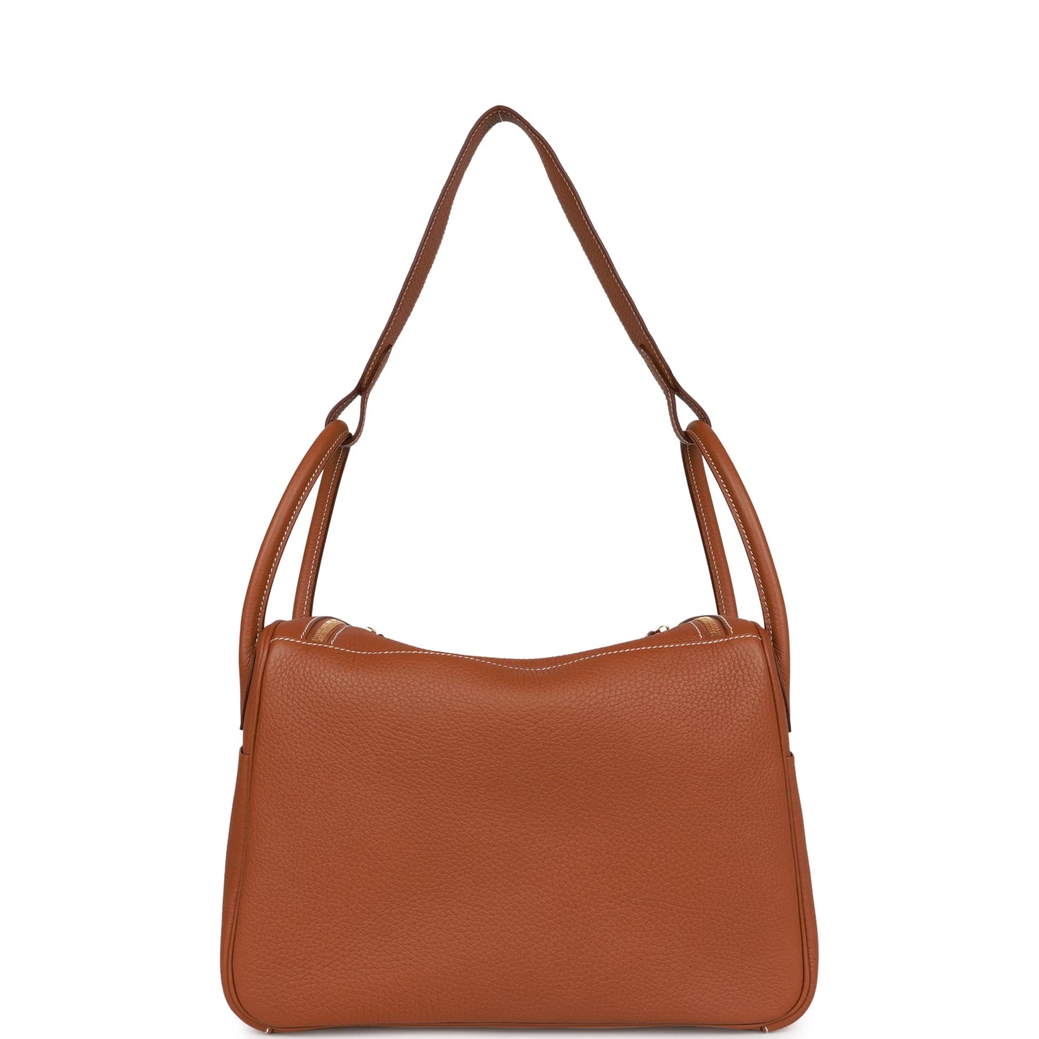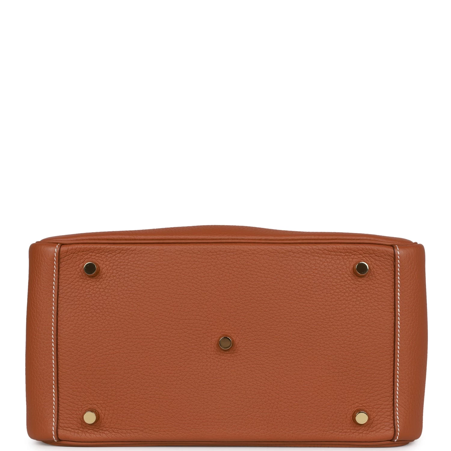 This Lindy is in Gold clemence with gold hardware and features contrast stitching, double zipper pulls, center Hermes twist lock closure, five gold feet, and two top handles that are linked by a removable shoulder strap.