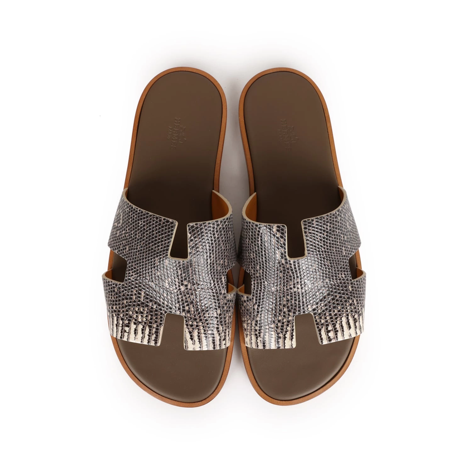 This pair of Izmir Sandals are in Ombre Lizard with the iconic H crossover lined in an etoupe sole