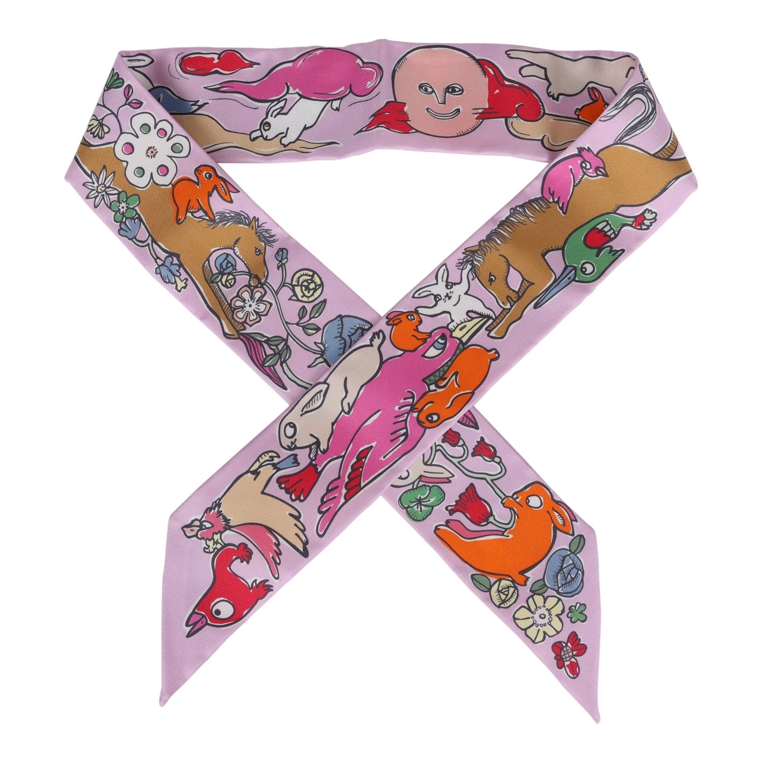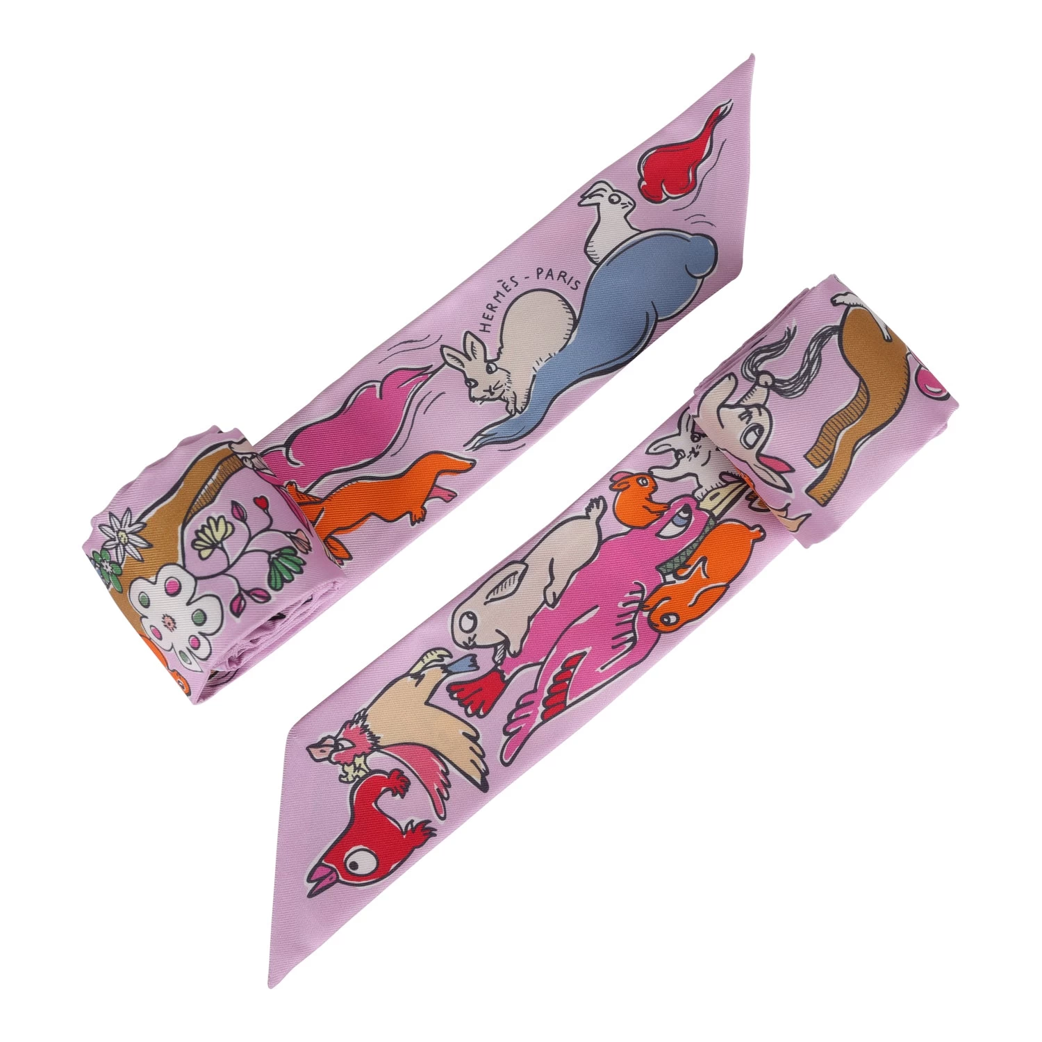 Hermes “Mille et Un Lapins” silk twilly designed by Shinsuke Kawahara in a pink multi colorway.