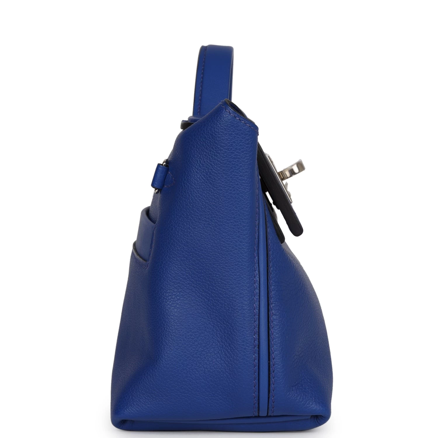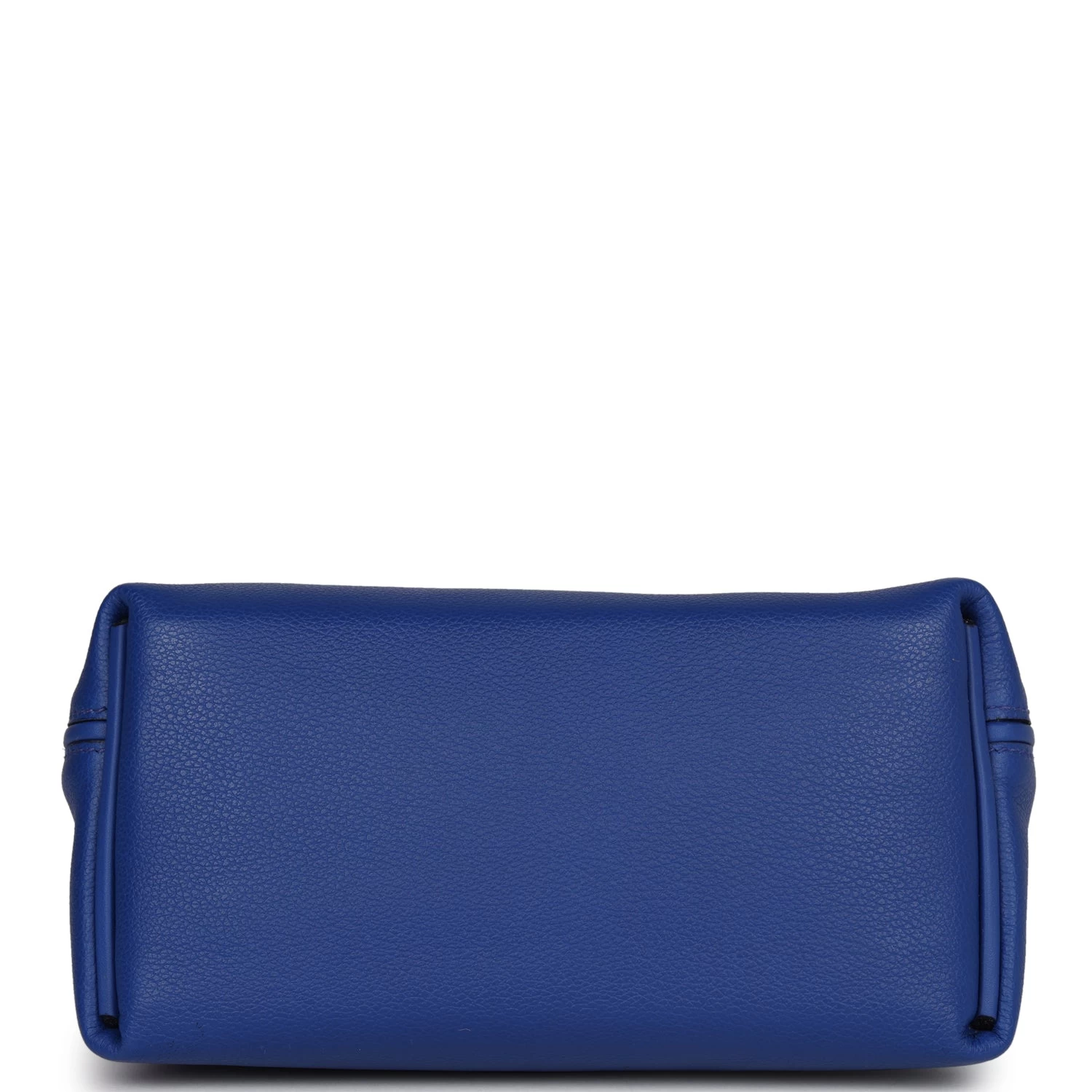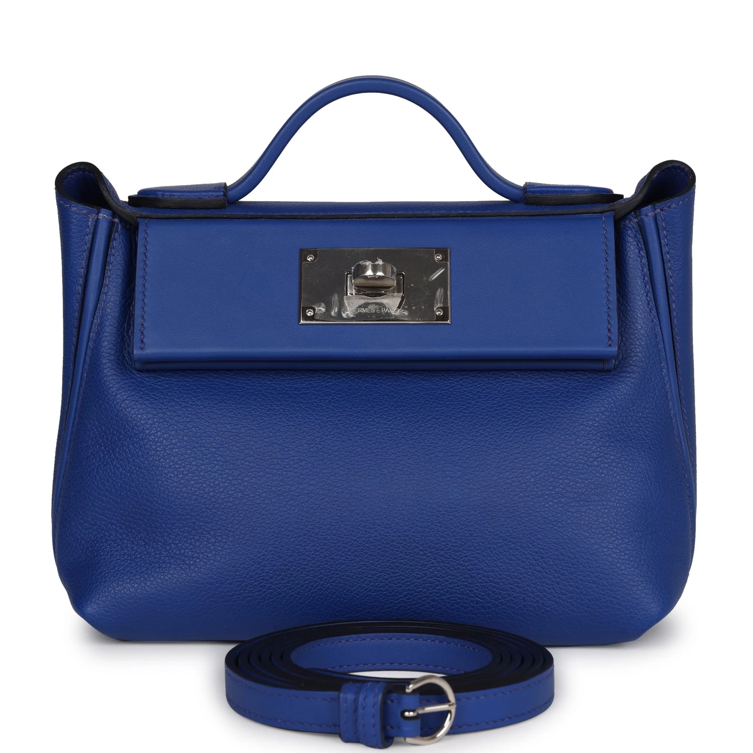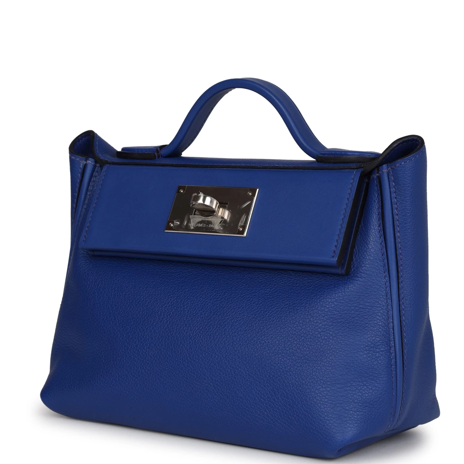 This 24/24 bag is in Bleu Royal evercolor and swift leather with palladium hardware and has tonal stitching, front turnlock closure, open rear pocket, single flap top handle and removable shoulder strap.