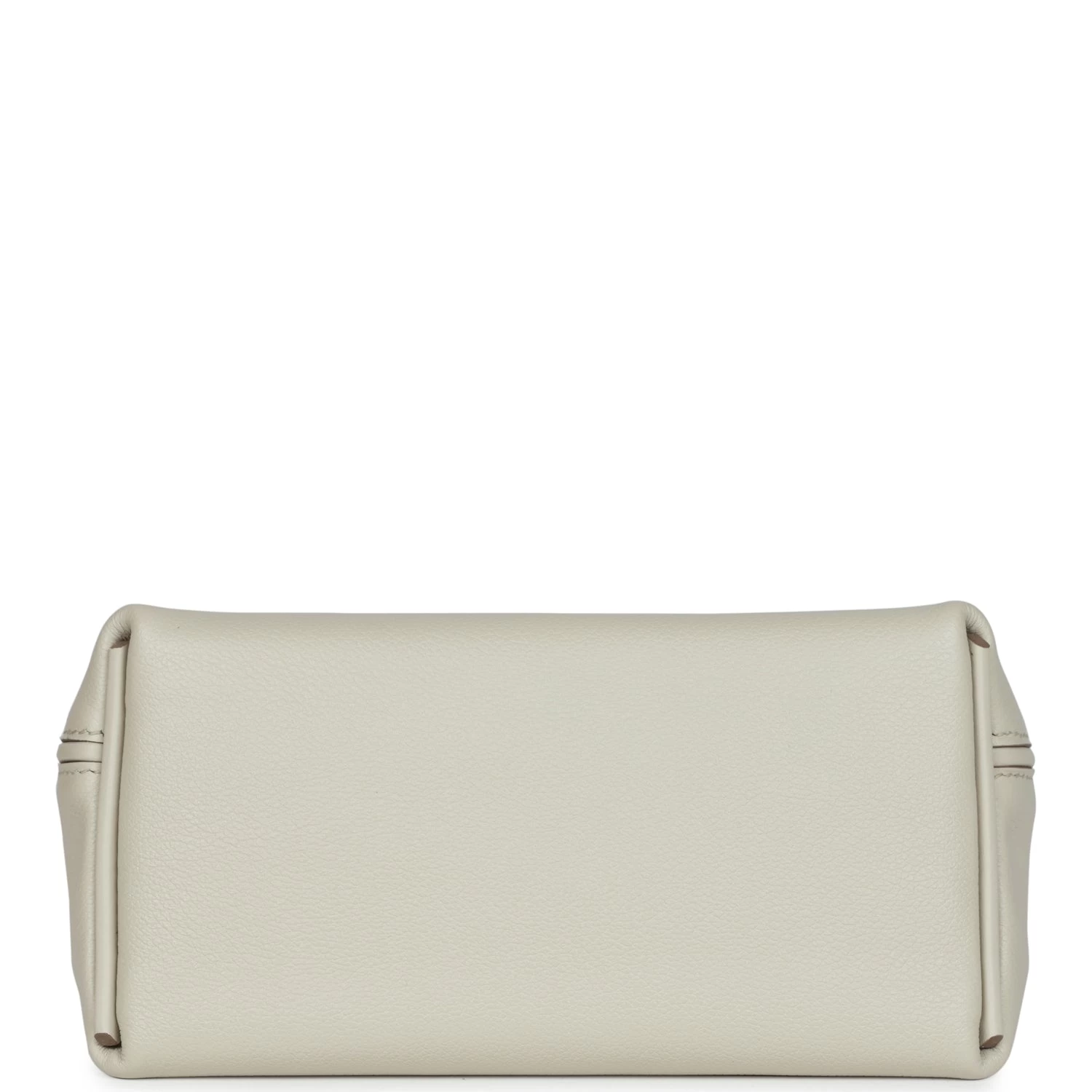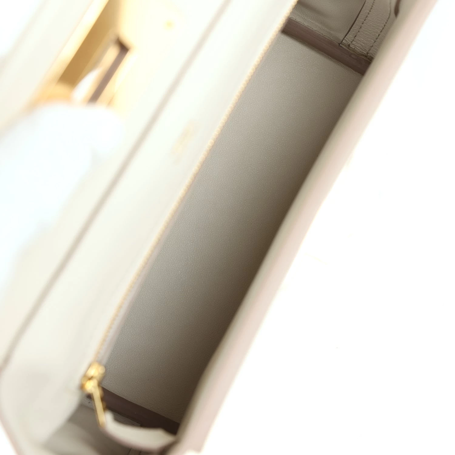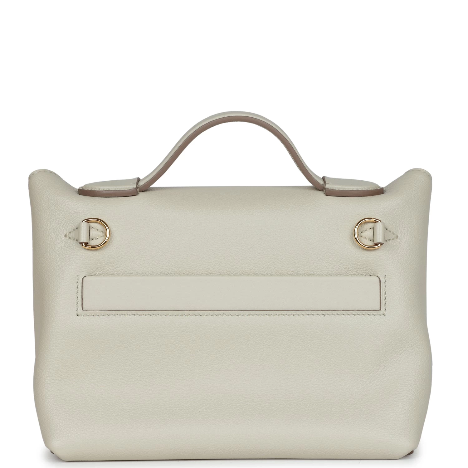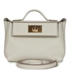 This 24/24 bag is in Beton evercolor and swift leather with gold hardware, has tonal stitching, front turnlock closure, open rear pocket, single flap top handle and removable shoulder strap.