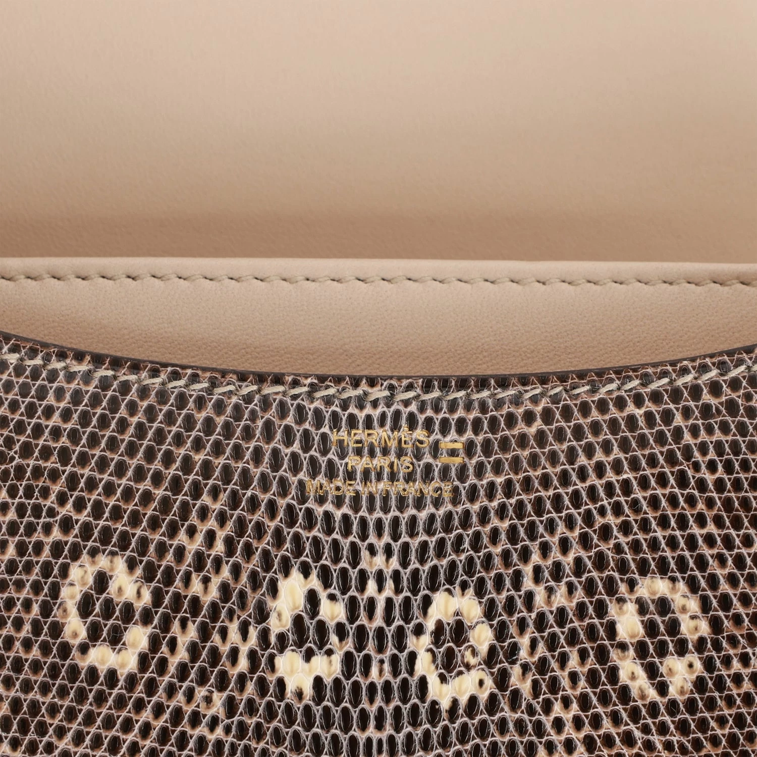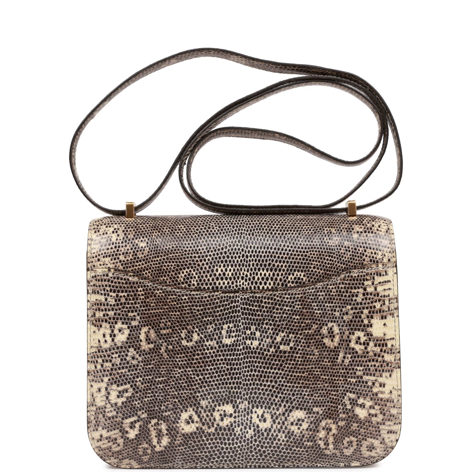 This Mini Constance is in Ombre varanus salvator lizard with gold hardware and has tonal stitching, gold “H” snap lock closure and adjustable shoulder strap.