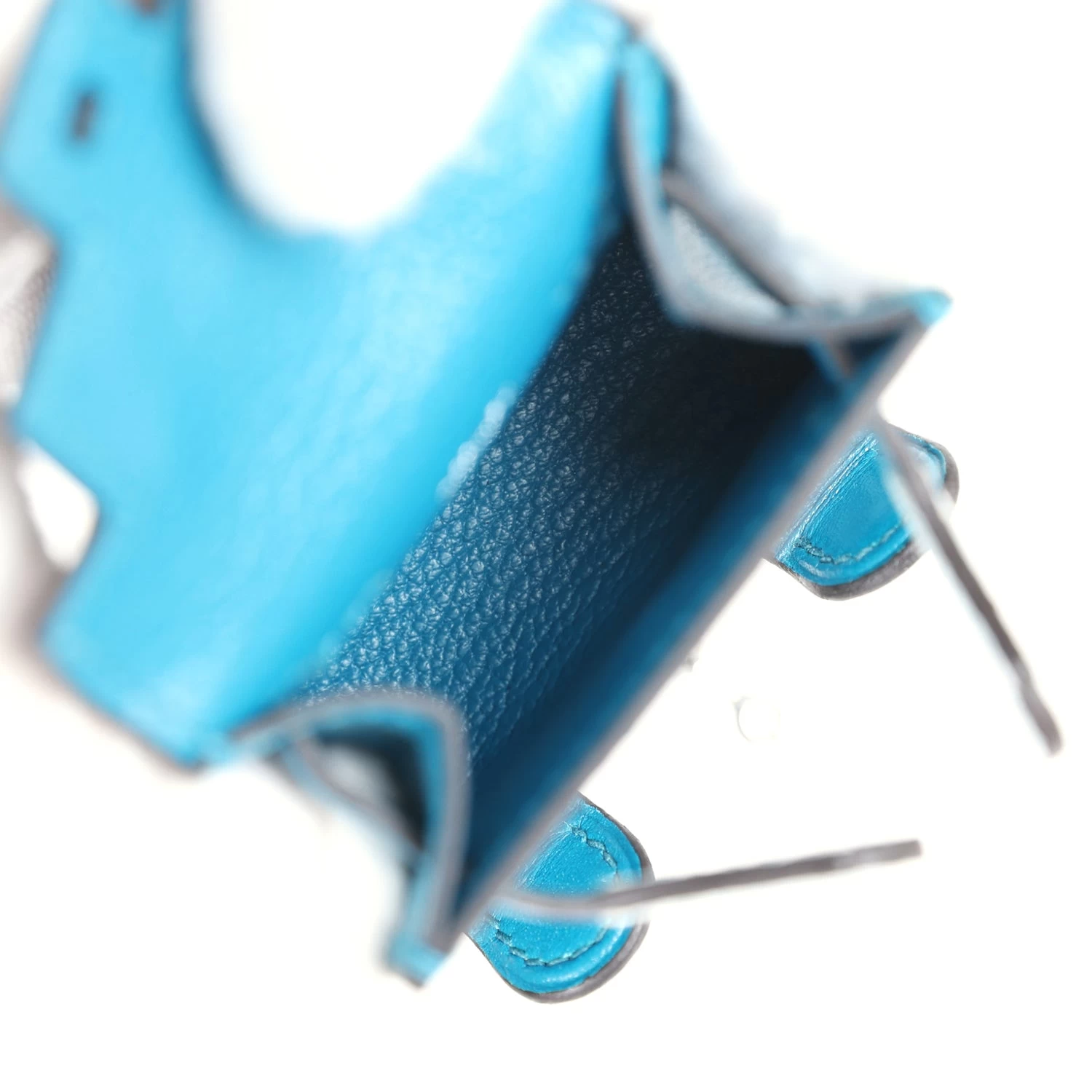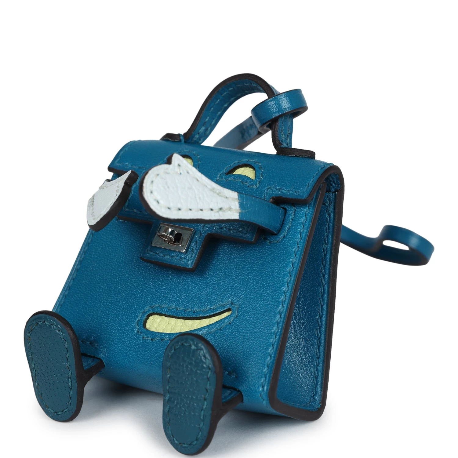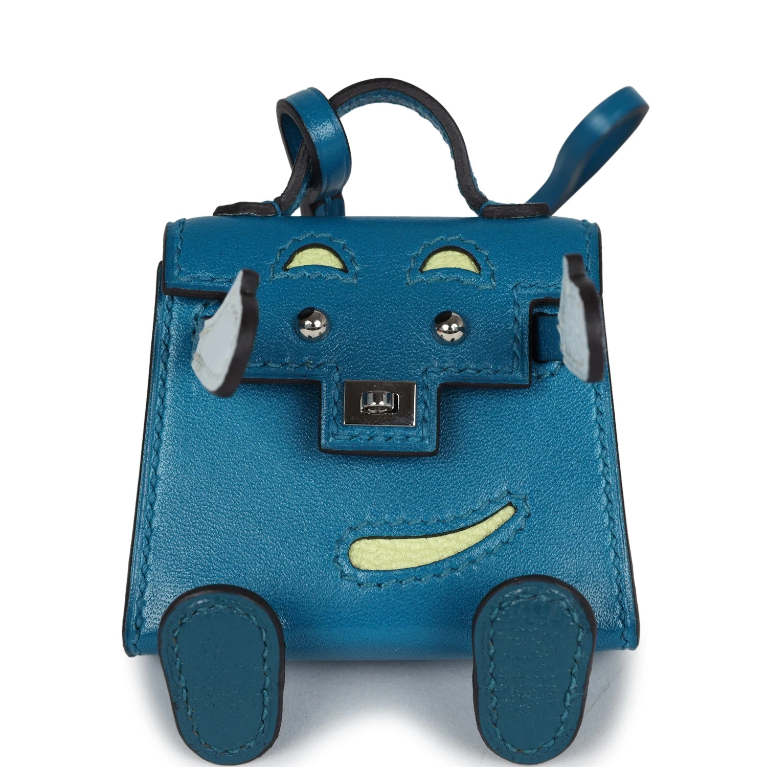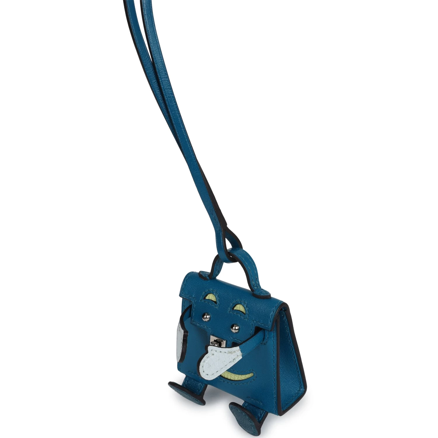 This Mini Kelly Idole Bag Charm is of Bleu Izmir, Jaune Bourgeon, Bleu Brume and Vert Bosphore tadelakt and chevre leather with palladium hardware, featuring the classic functional front flap and turnlock closure with accented caricature leather stitched applique and a leather loop strap.